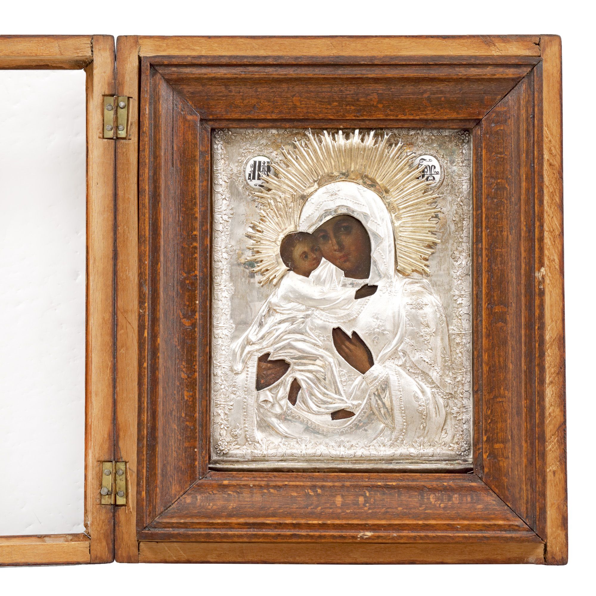 122. Icoană pe lemn, cu ferecătură din argint și email, ”Maica Domnului cu Pruncul (Glykofilusa)”, școală rusească, 1832