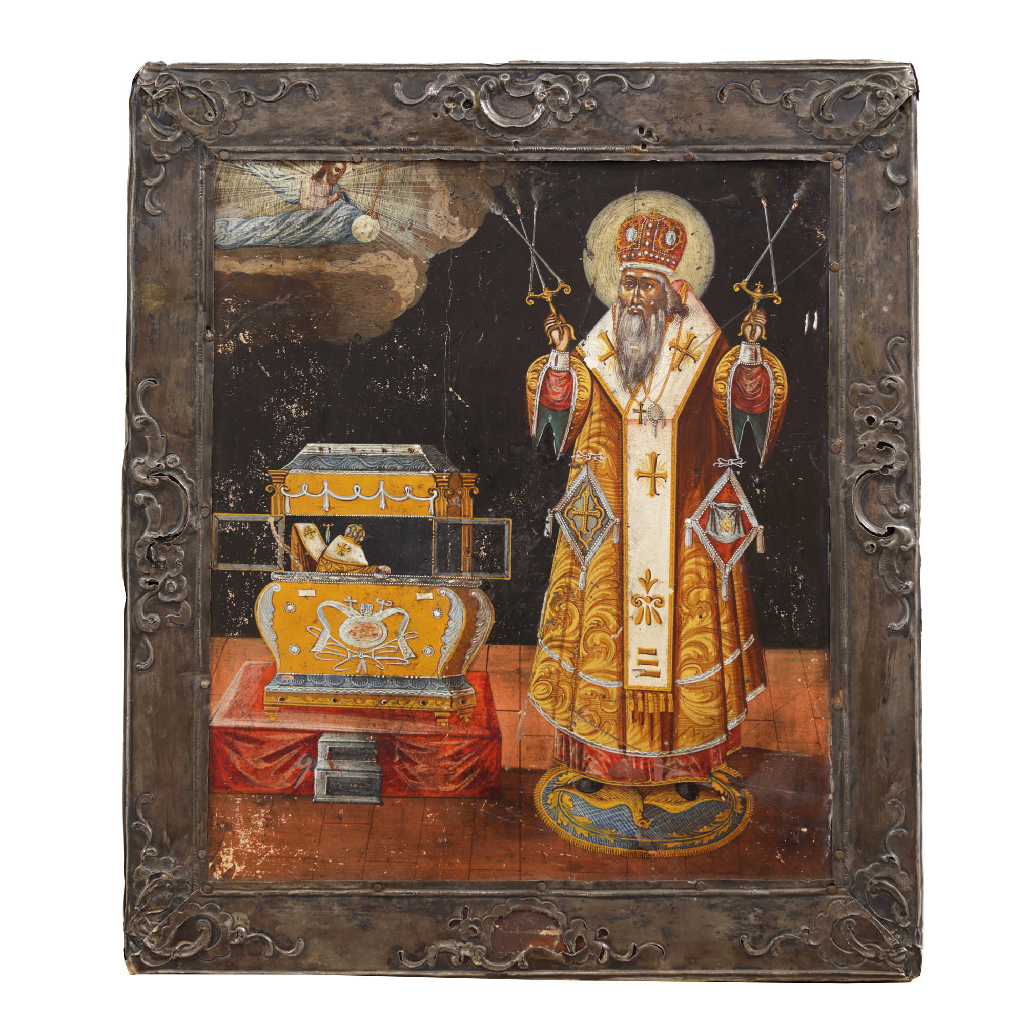 112. Icoană pe lemn, cu riză din argint, ”Sfântul Ierarh Vasile cel Mare”, școală rusească, cca. 1776, piesă de colecție