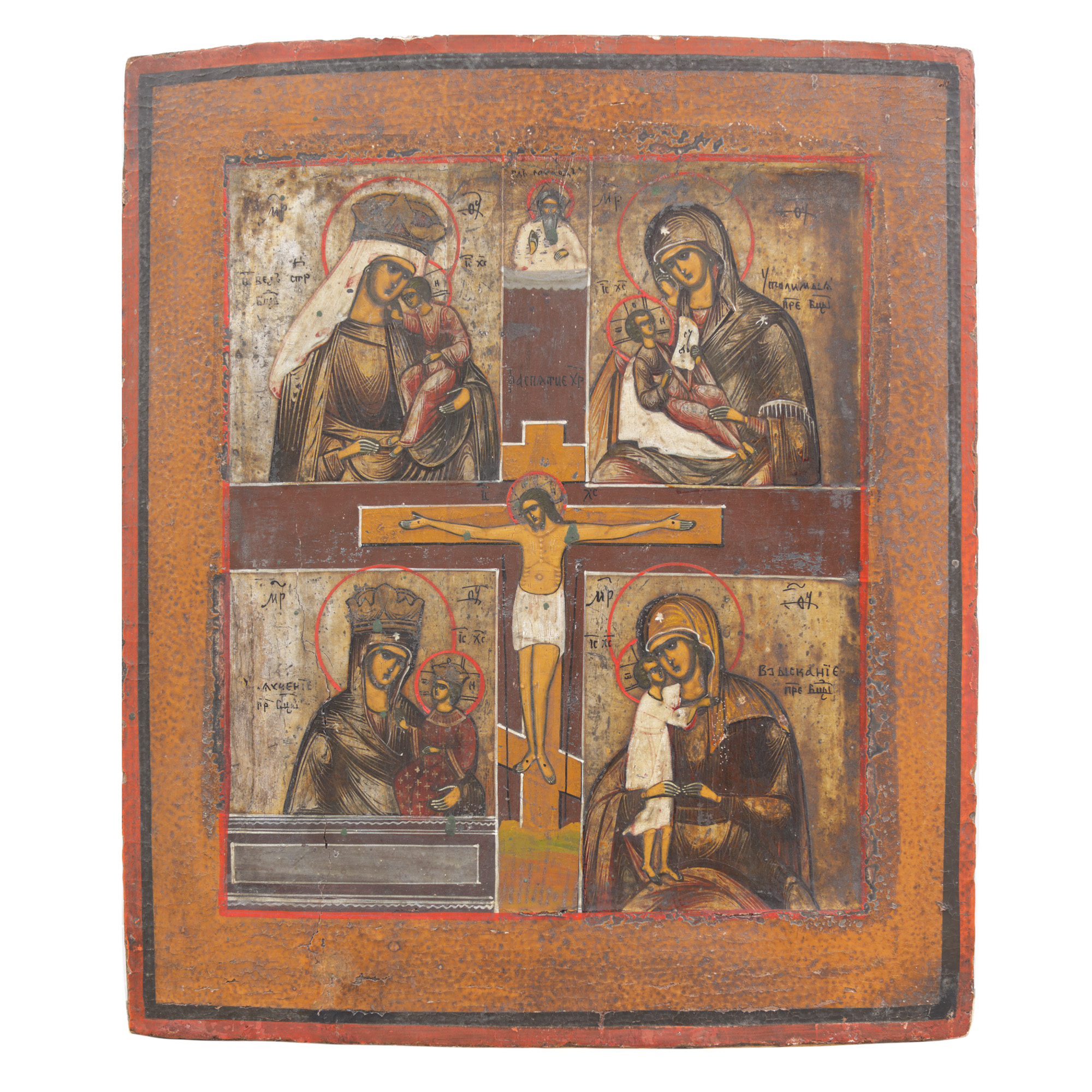 150. Icoană pe lemn, în patru registre ”Maica Domnului cu Pruncul în patru tipuri iconografice”, școală rusească, prima jumătate a sec. XIX