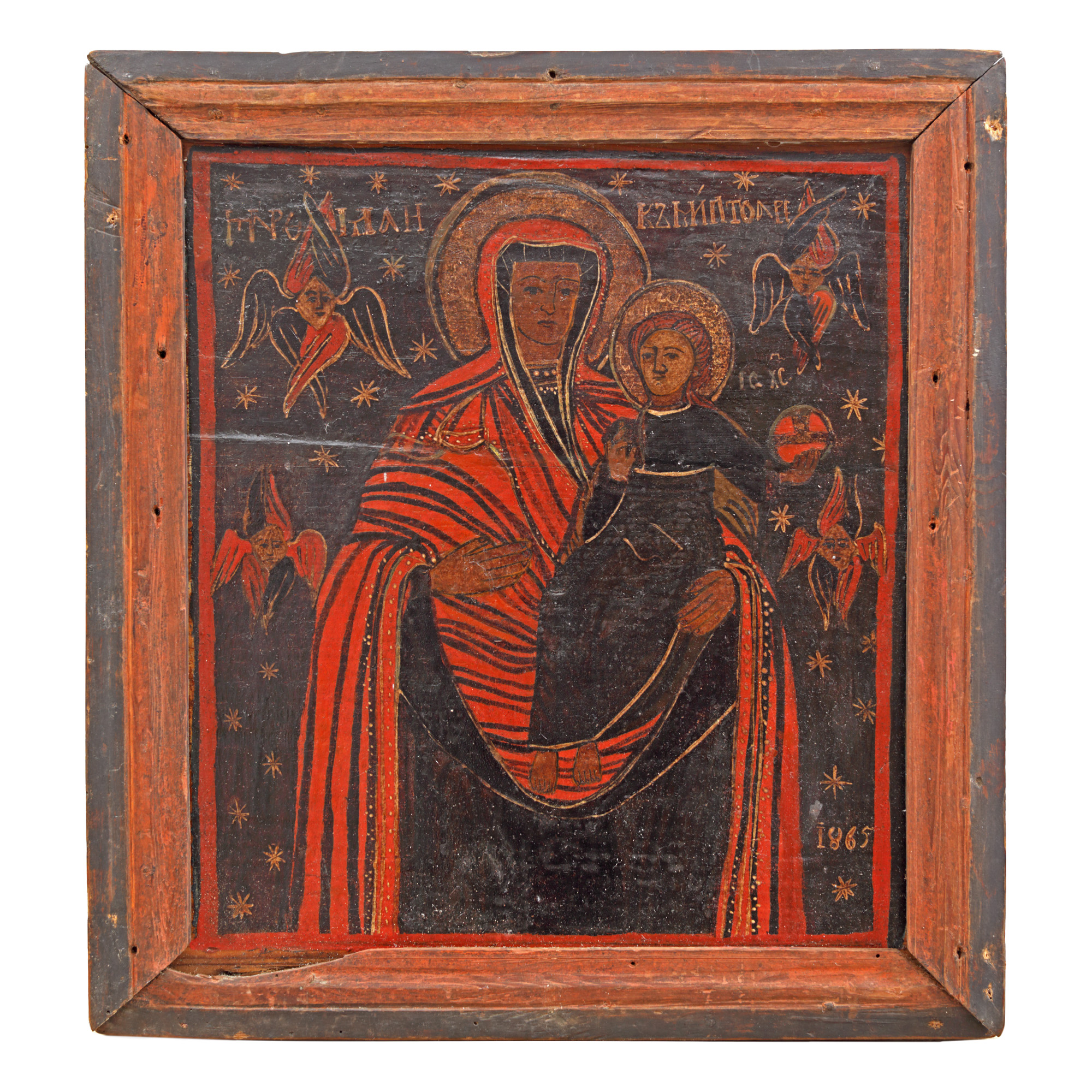 86. Icoană pe lemn, ”Maica Domnului cu Pruncul”, școală transilvăneană, 1865