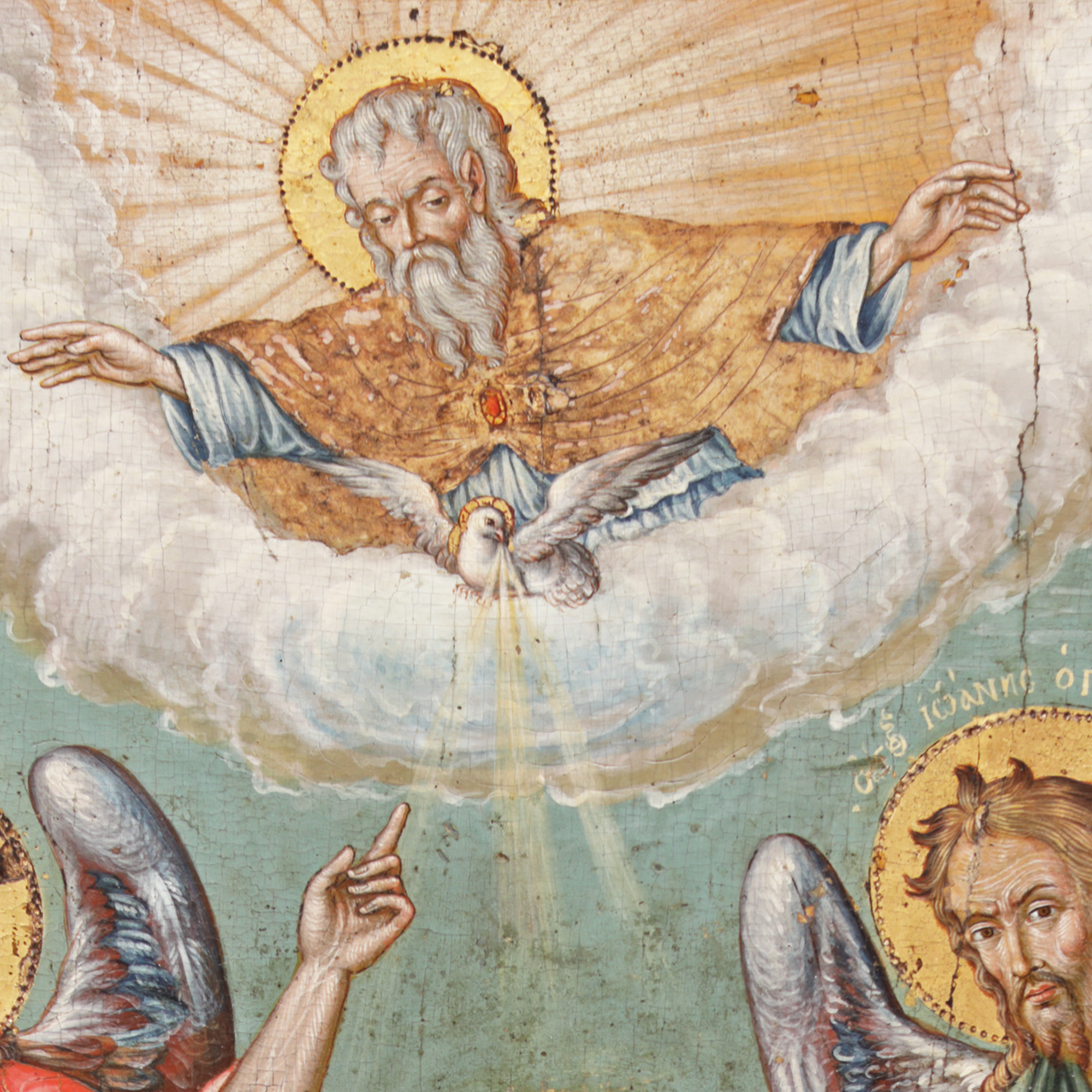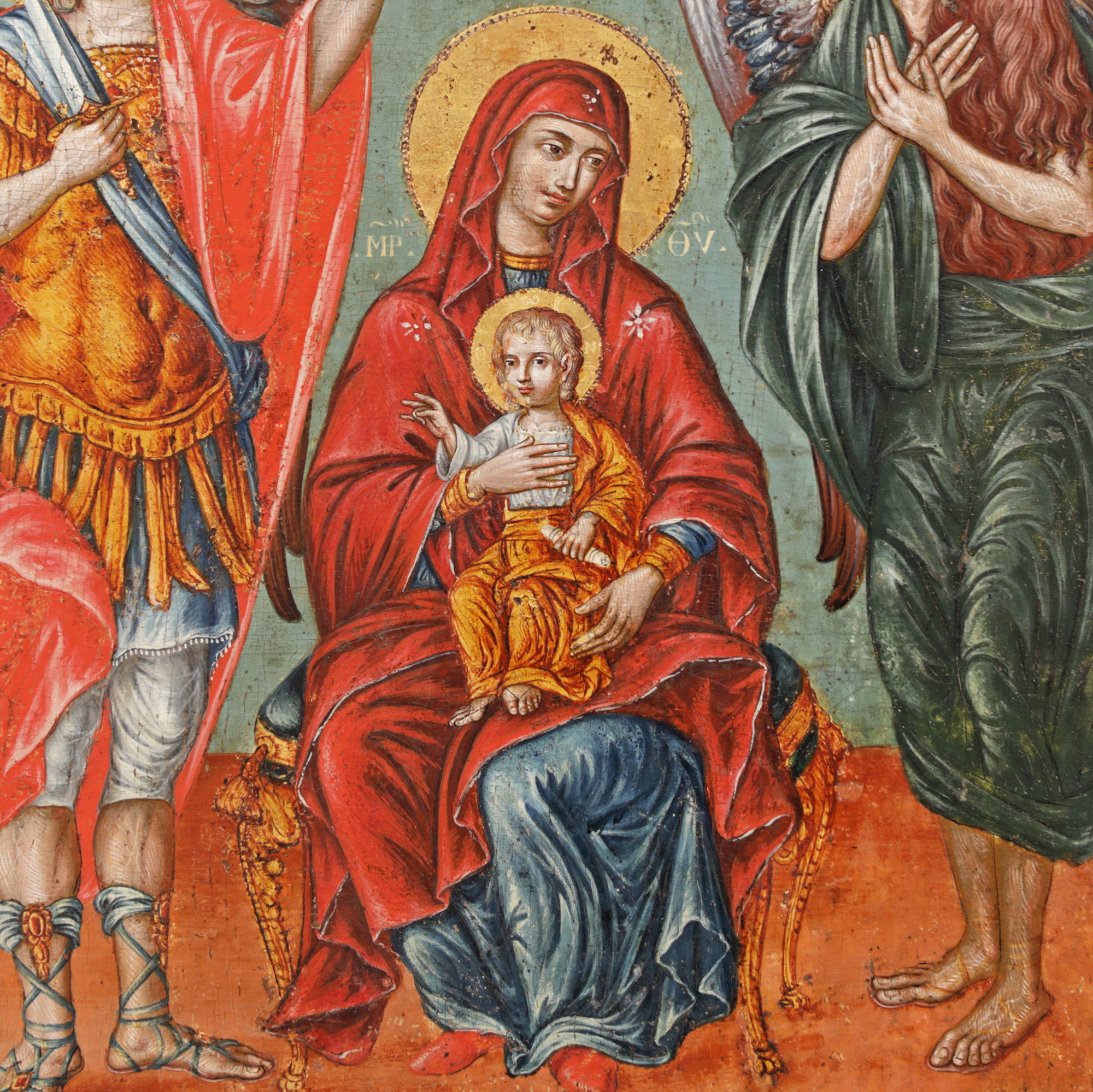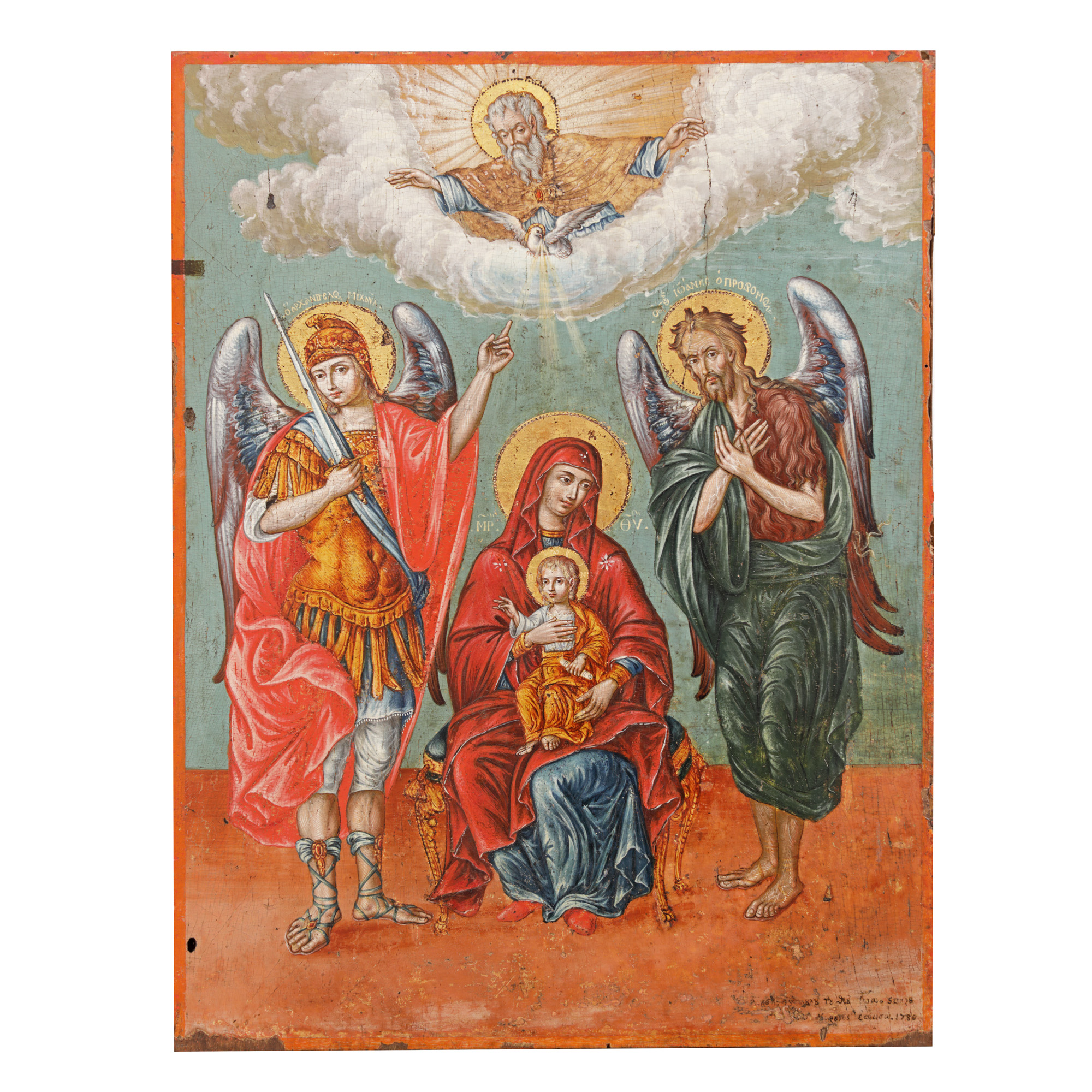133. Icoană pe lemn, ”Maica Domnului cu Pruncul, Sfântul Arhanghel Mihail și Sfântul Ioan Botezătorul - Îngerul deșertului”, școală grecească, 1780, piesă rară, de colecție