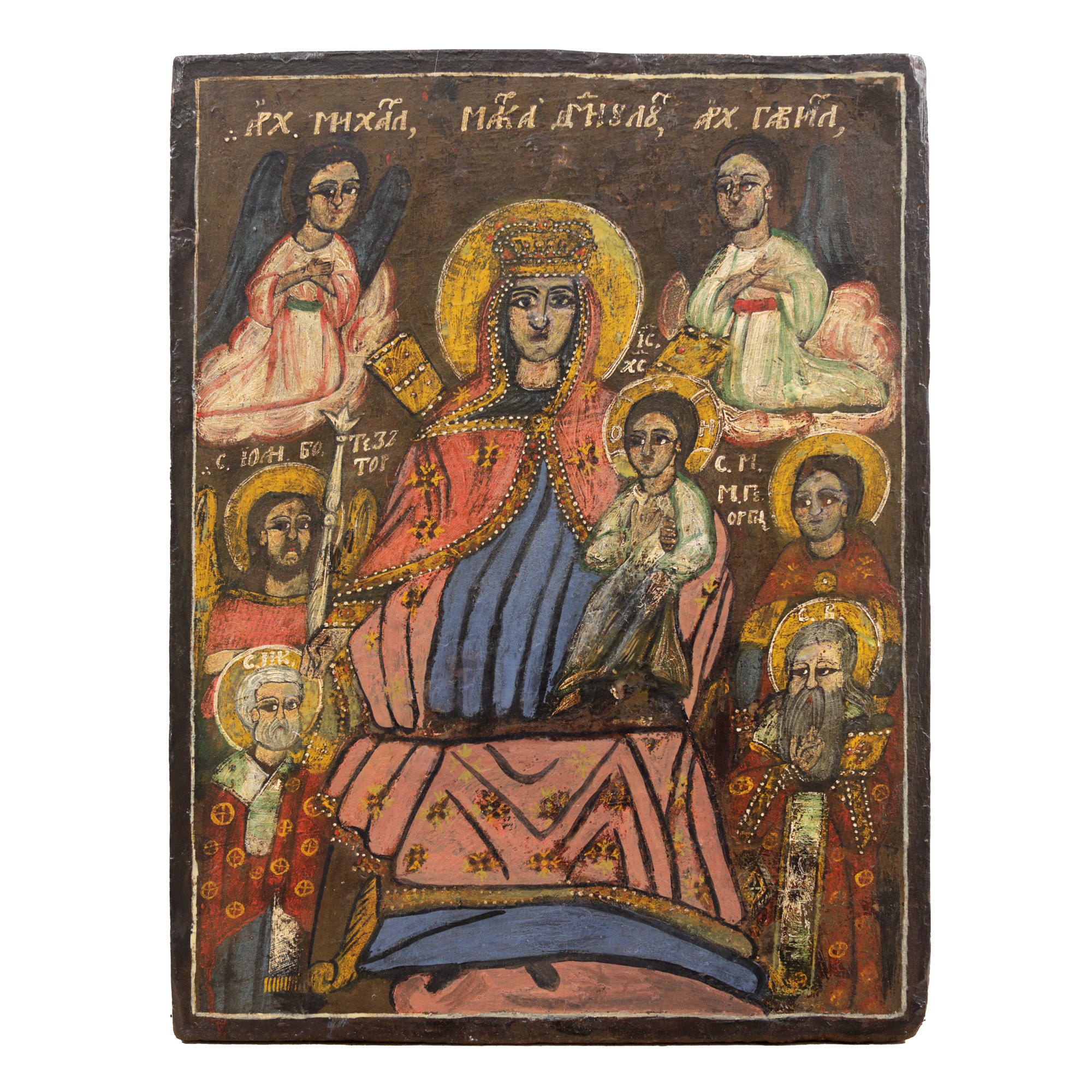 91. Icoană pe lemn, ”Maica Domnului cu Pruncul, Sfinții Arhangheli Mihail și Gavril, Sfinții Ioan Botezătorul, Nicolae, Gheorghe și Vasile”, școală românească, prima jumătate a sec. XIX
