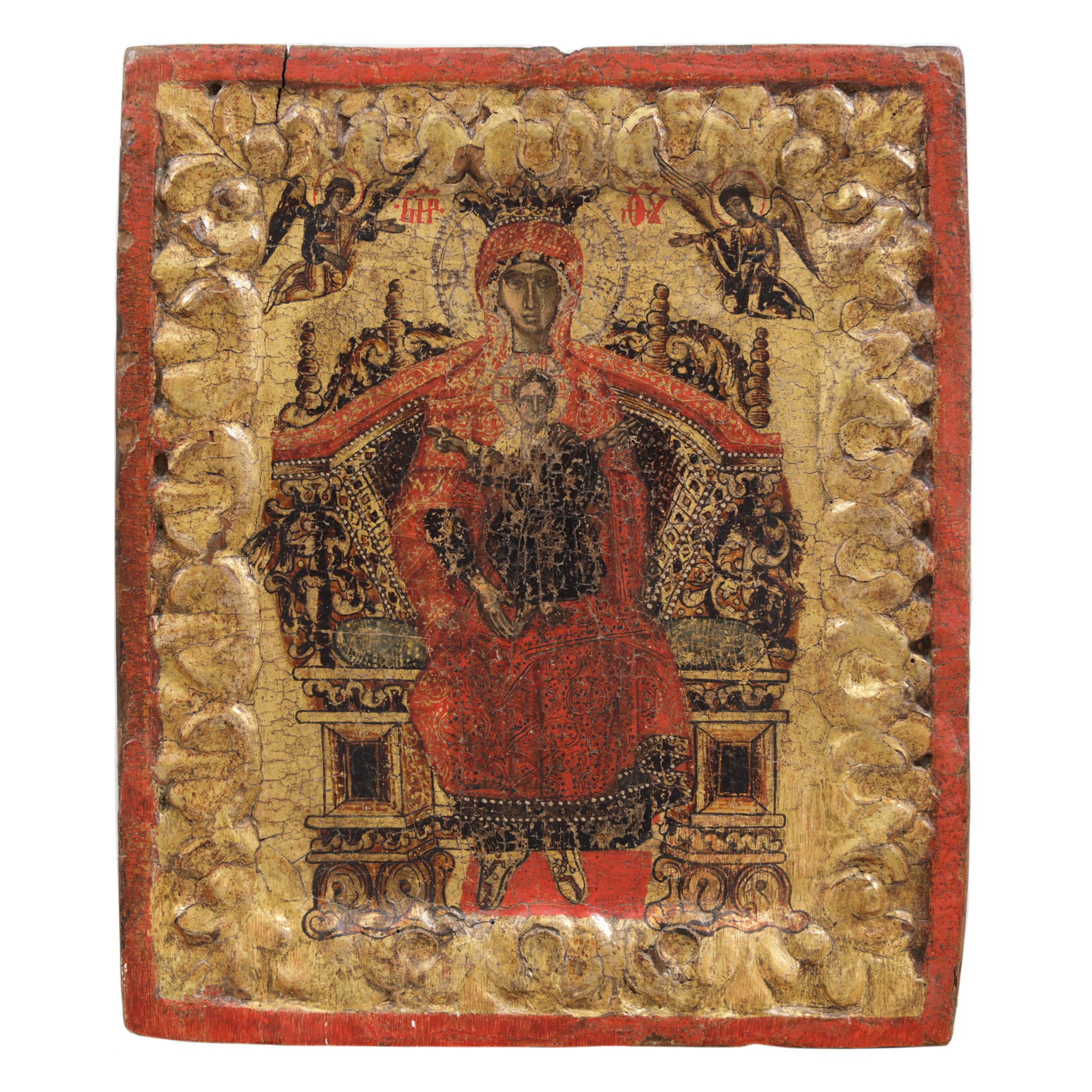 74. Icoană pe lemn, ”Maica Domnului - Împărăteasă”, ramă sculptată, școală post-brâncovenească, a doua jumătate a sec. XVIII, de colecție
