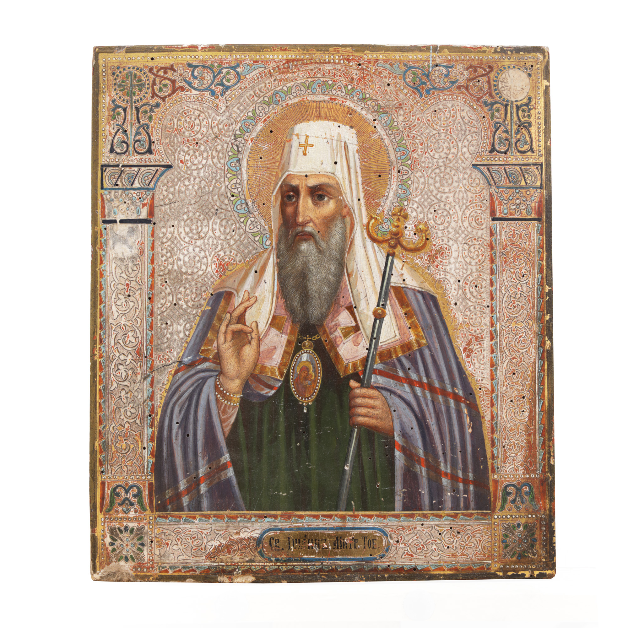 156. Icoană pe lemn, ”Sfântul Ierarh Ioan”, școală rusească, a doua jumătate a sec. XIX, piesă rară, de colecție