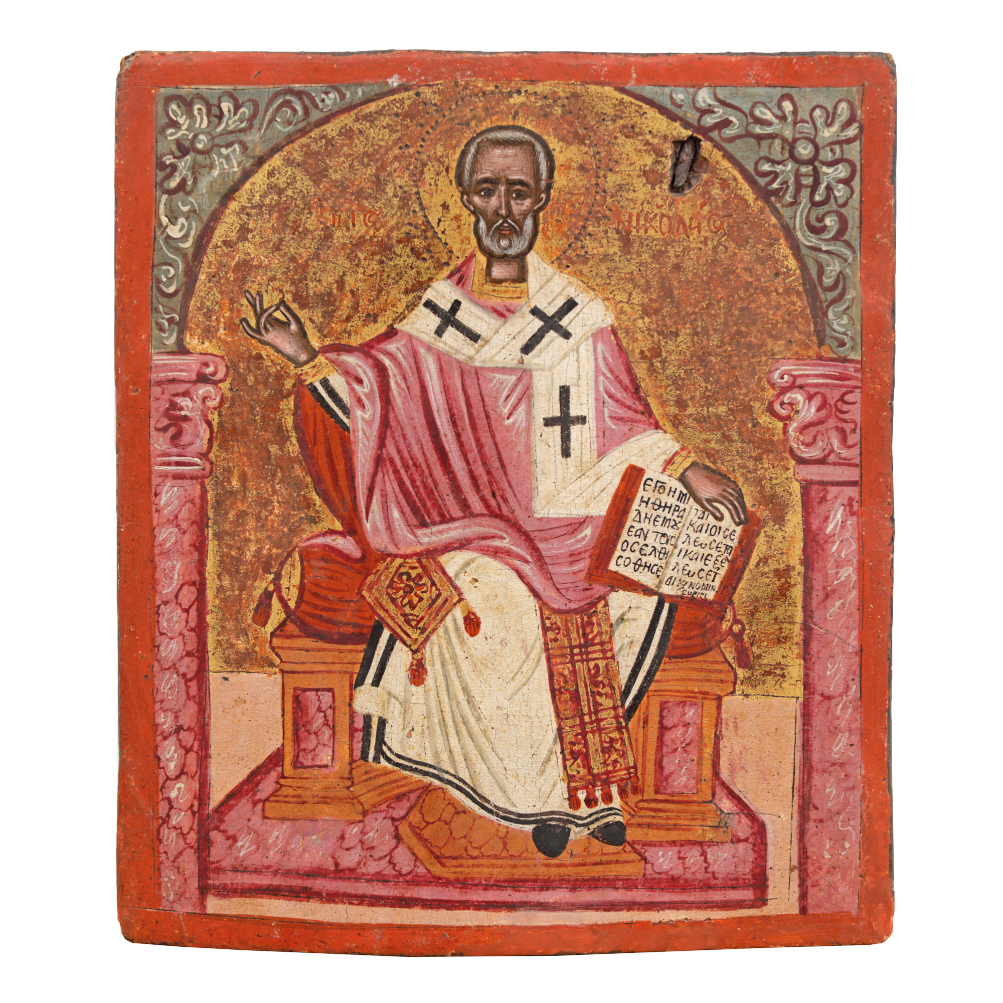 130. Icoană pe lemn, ”Sfântul Ierarh Nicolae, tronând”, școală grecească, jumătatea sec. XVIII