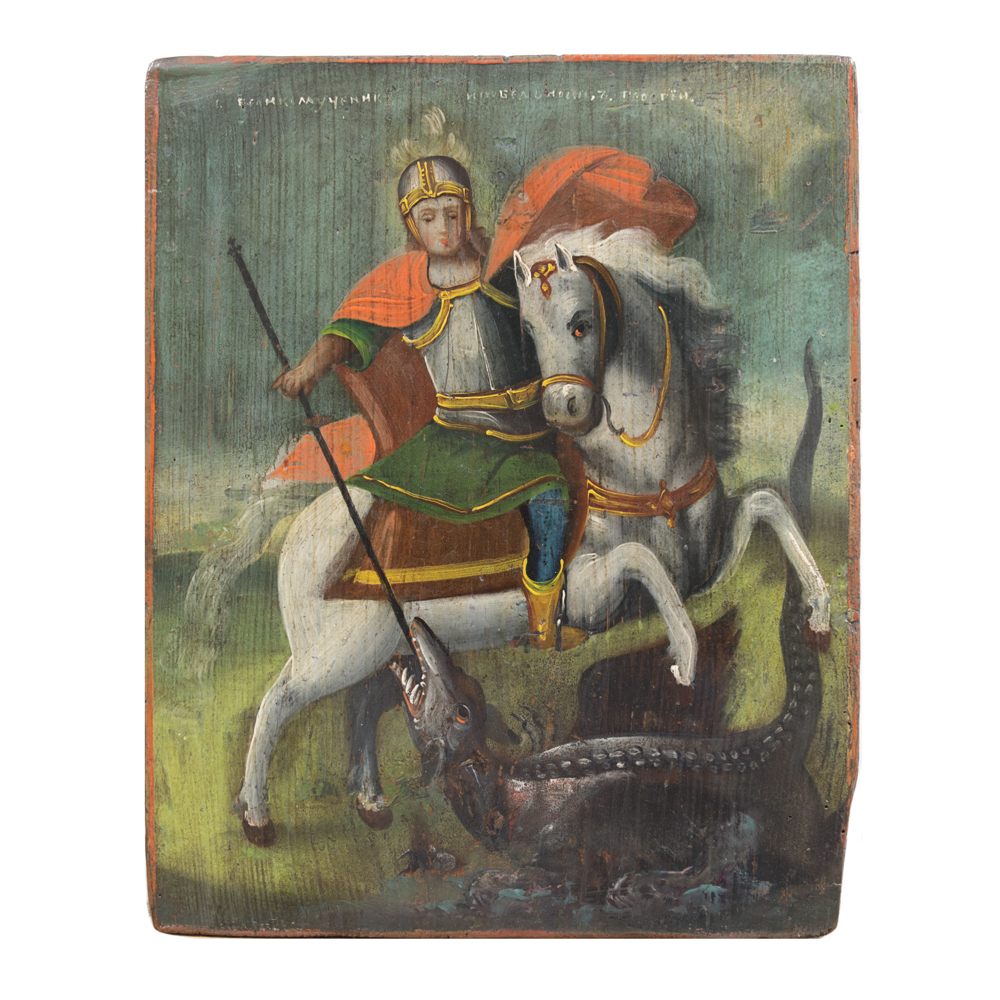 189. Icoană pe lemn, ”Sfântul Mare Mucenic Gheorghe omorând balaurul”, școală românească, jumătatea sec. XIX