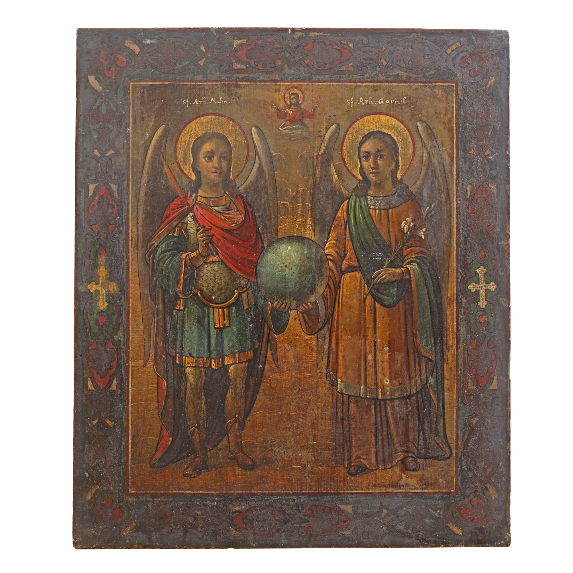 195. Icoană pe lemn, ”Sfinții Arhangheli Mihail și Gavril”, pictor C.M. Constantănescu, 1929