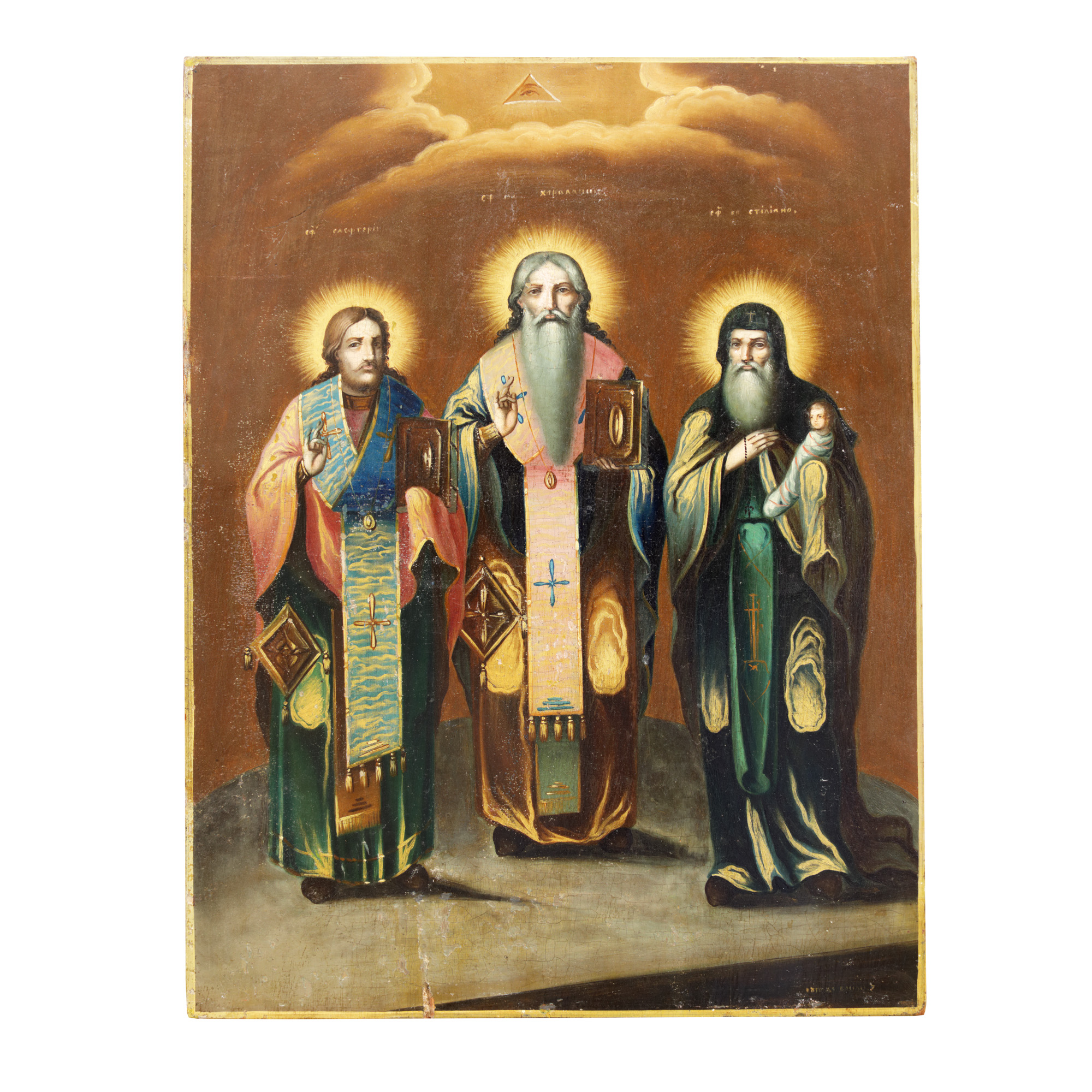 194. Icoană pe lemn, ”Sfinții Ierarhi Elefterie, Haralambie și Stelian”, zugrav Vasile, probabil Căldărușani, 1850, de colecție