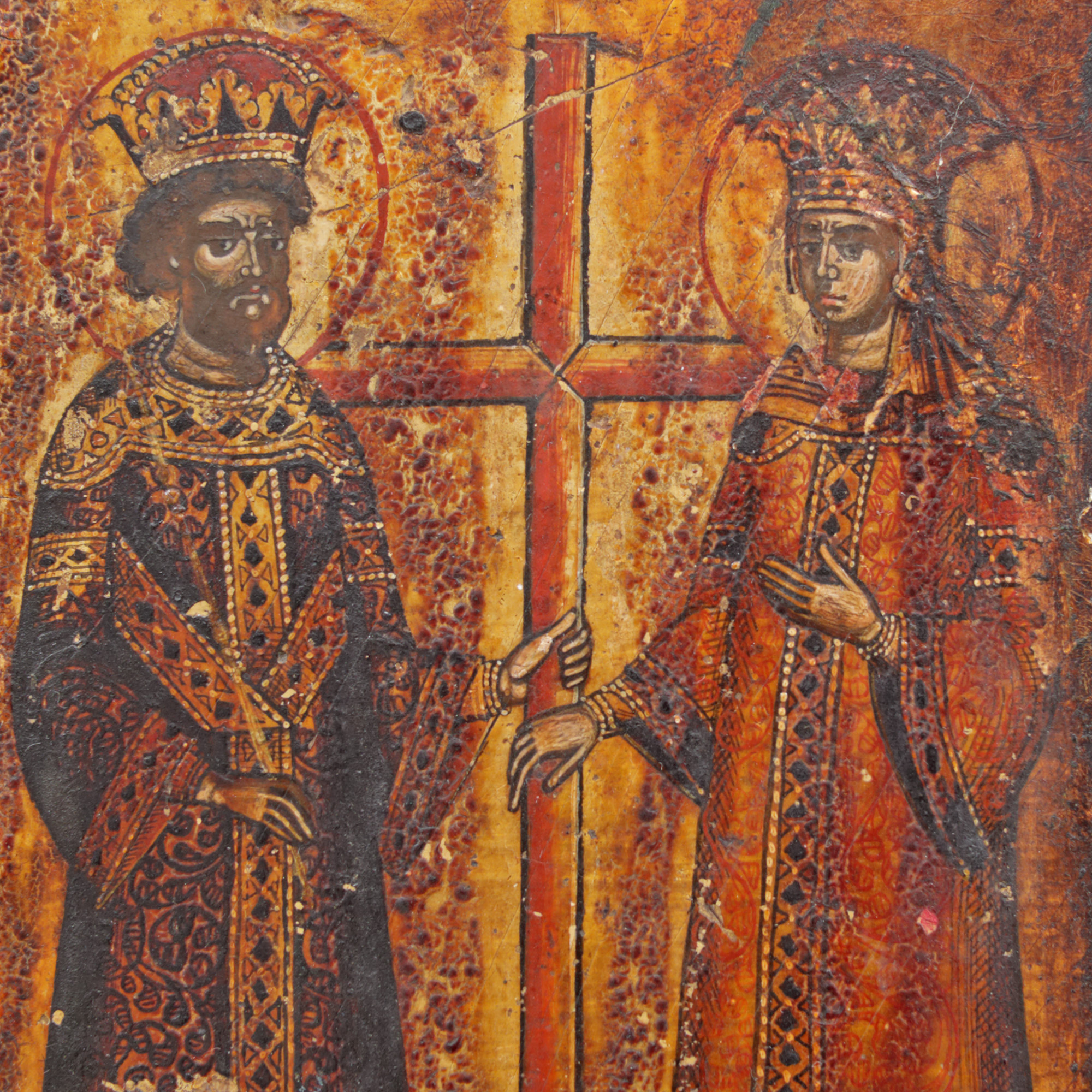 73C. Icoană pe lemn, ”Sfinții Împărați Constantin și Elena", școală brâncovenească, epoca lui Constantin Brâncoveanu, începutul sec. XVIII, piesă rară, de colecție