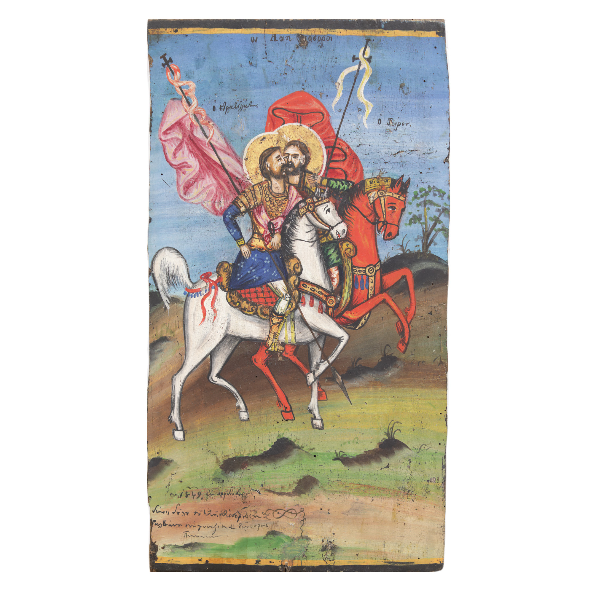 134. Icoană pe lemn, ”Sfinții Teodor Tiron și Teodor Stratilat”, școală grecească, 1849
