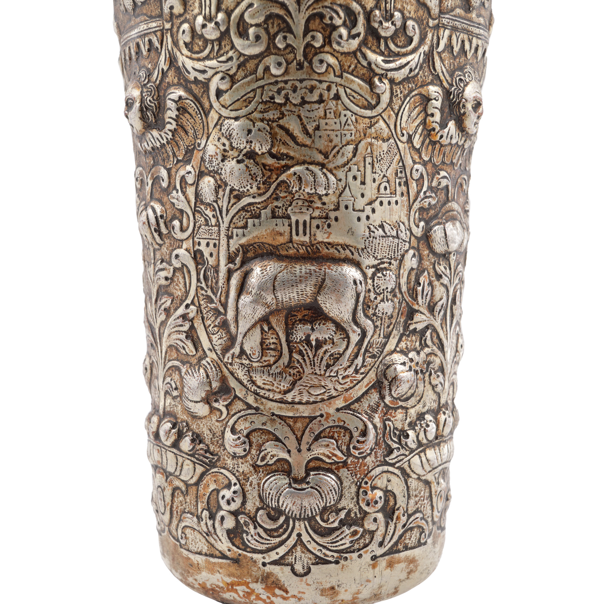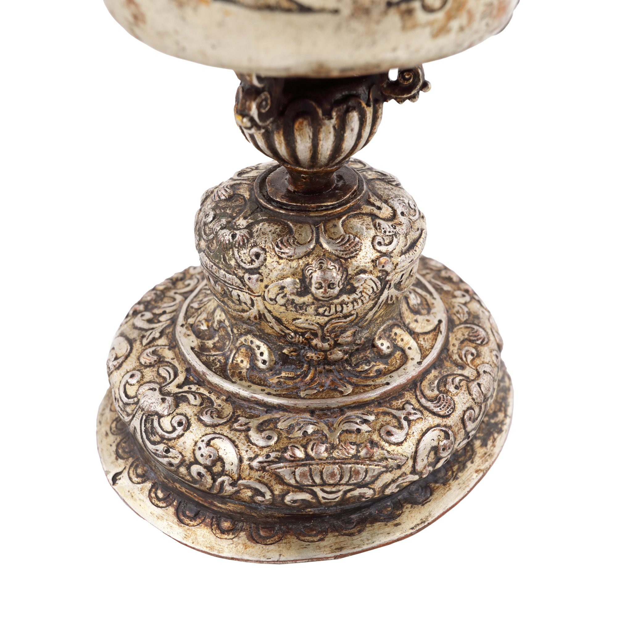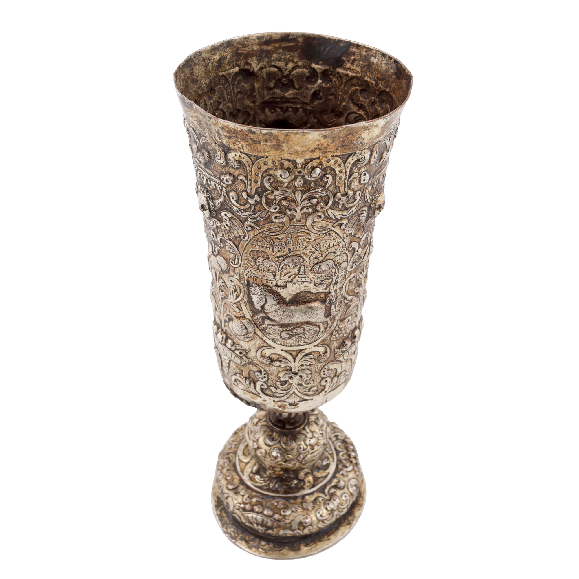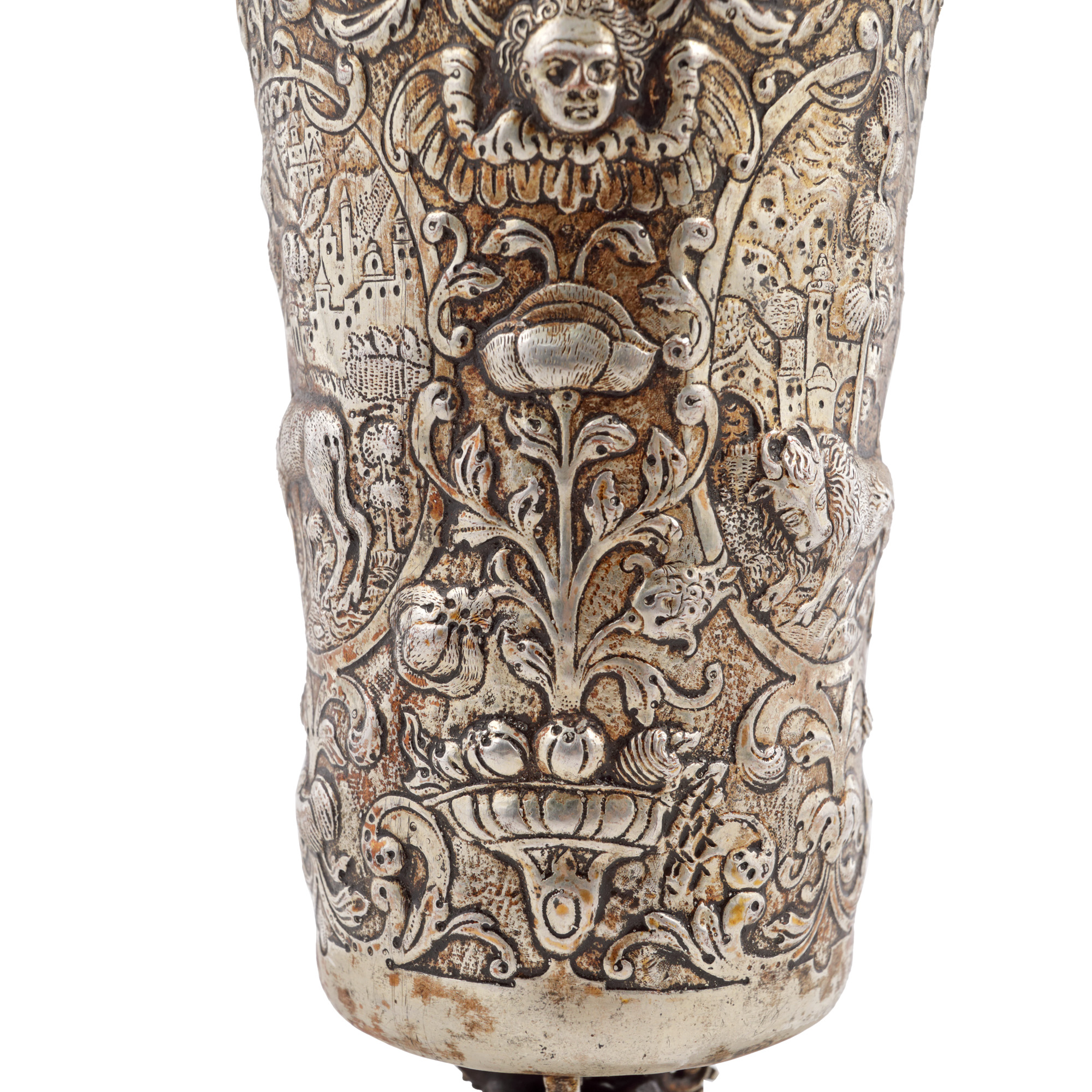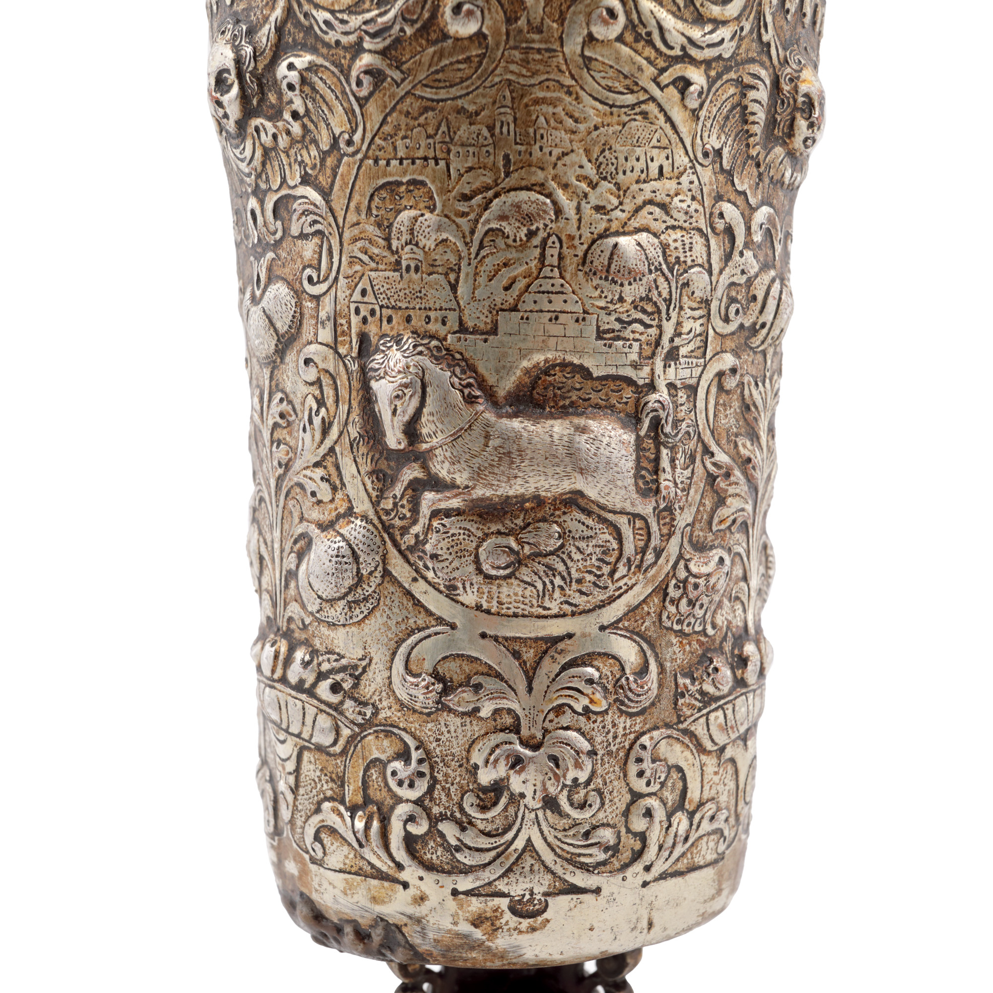 69F. Pocal de factură barocă, din cupru argintat, decorat cu cerb, cal și taur, meșter AV, atelier Levoča, Slovacia, cca. 1670, piesă extrem de rară, de colecție