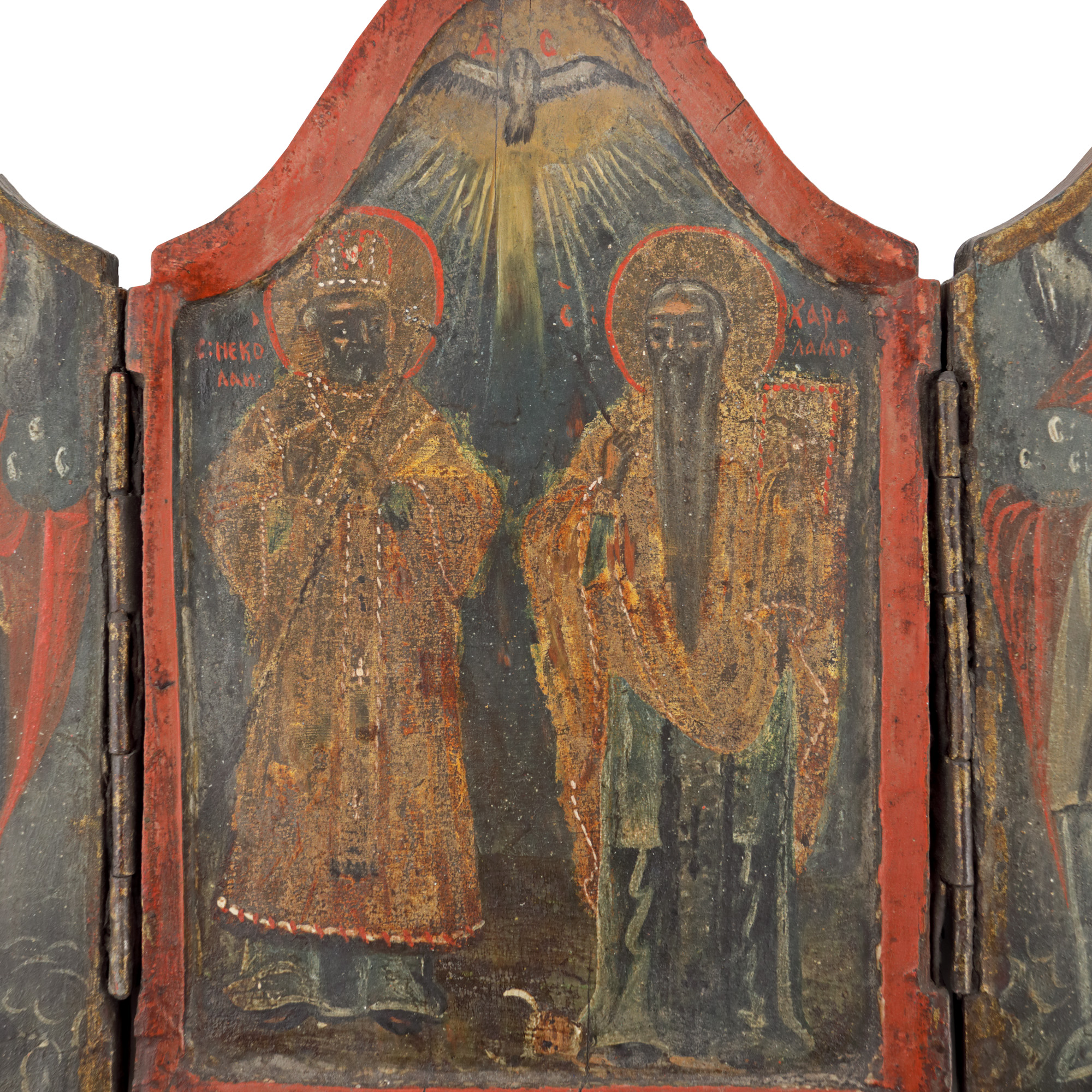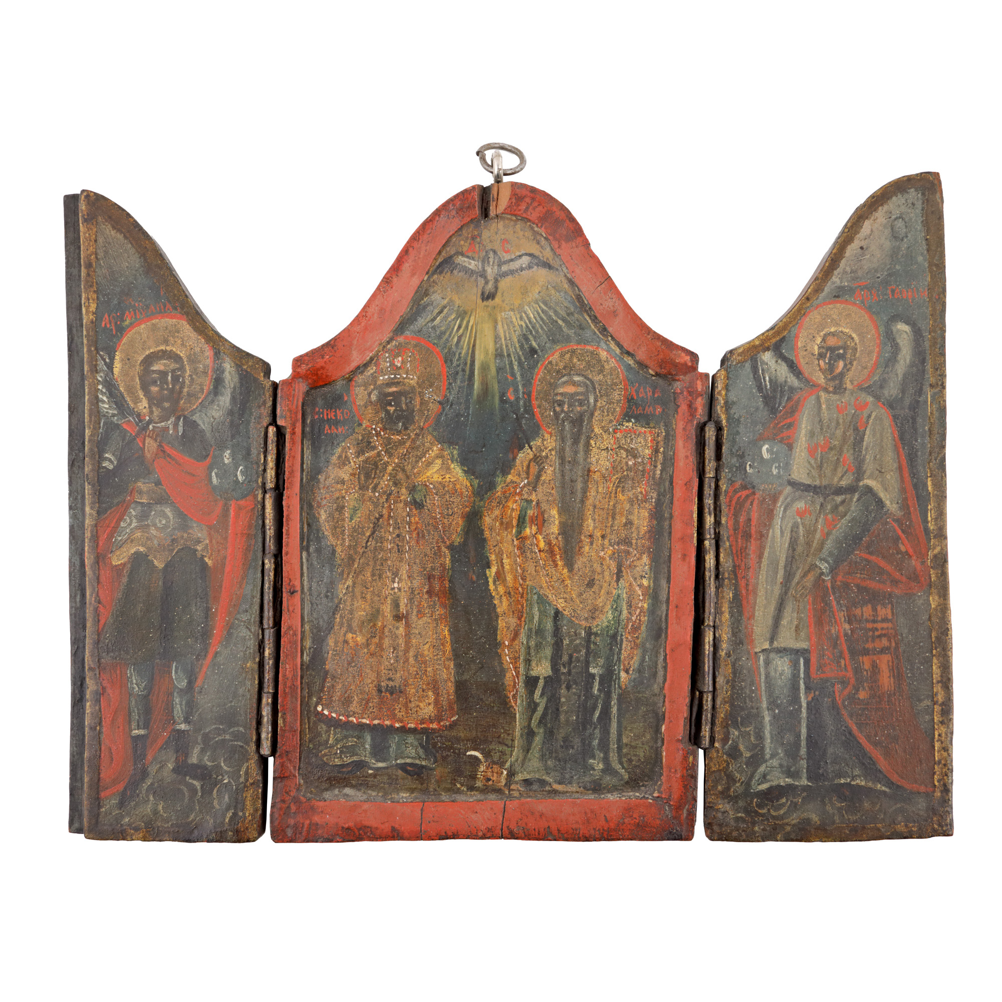 83. Triptic, ”Sfinții Ierarhi Nicolae și Haralambie și Sfinții Arhangheli Mihail și Gavril”, școală românească, sfârșitul sec. XVIII - începutul sec. XIX