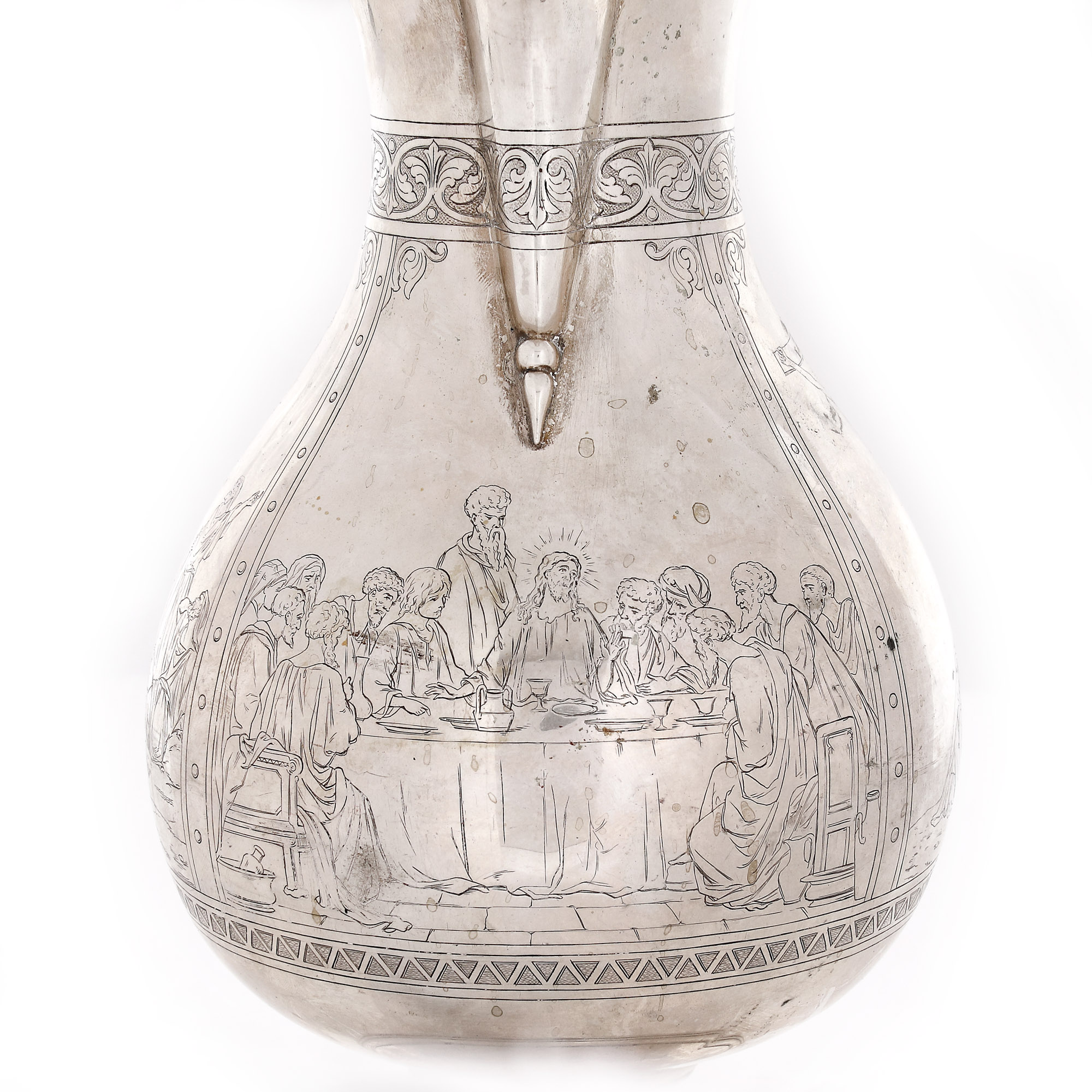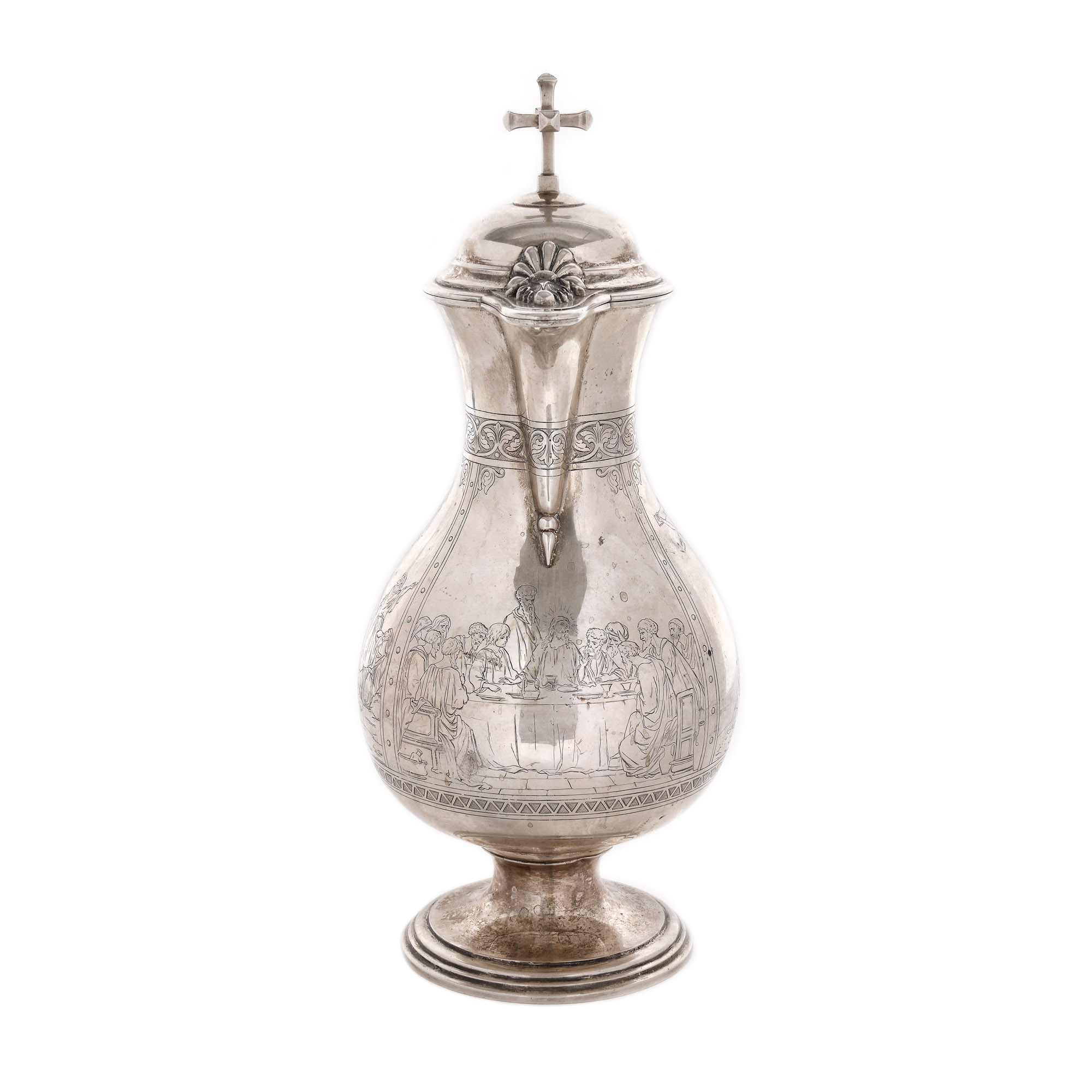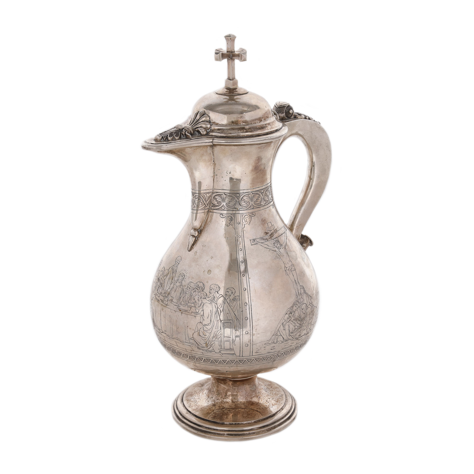 73. Carafă din argint aurit, pentru aghiazmă sau vin, decorată cu scenele ”Cina cea de Taină”, ”Răstignirea și Înălțarea Domnului”, 1886, piesă rară, de colecție