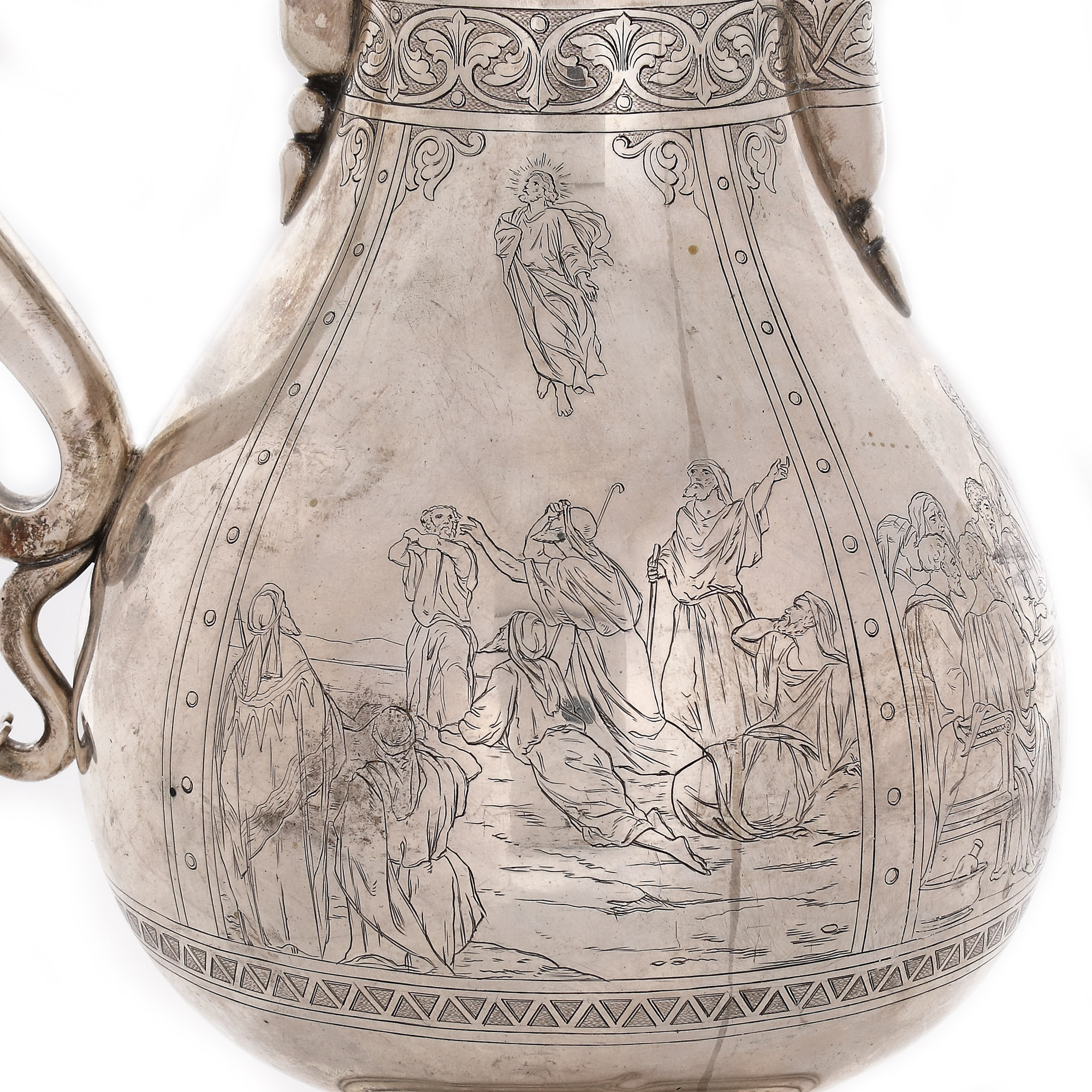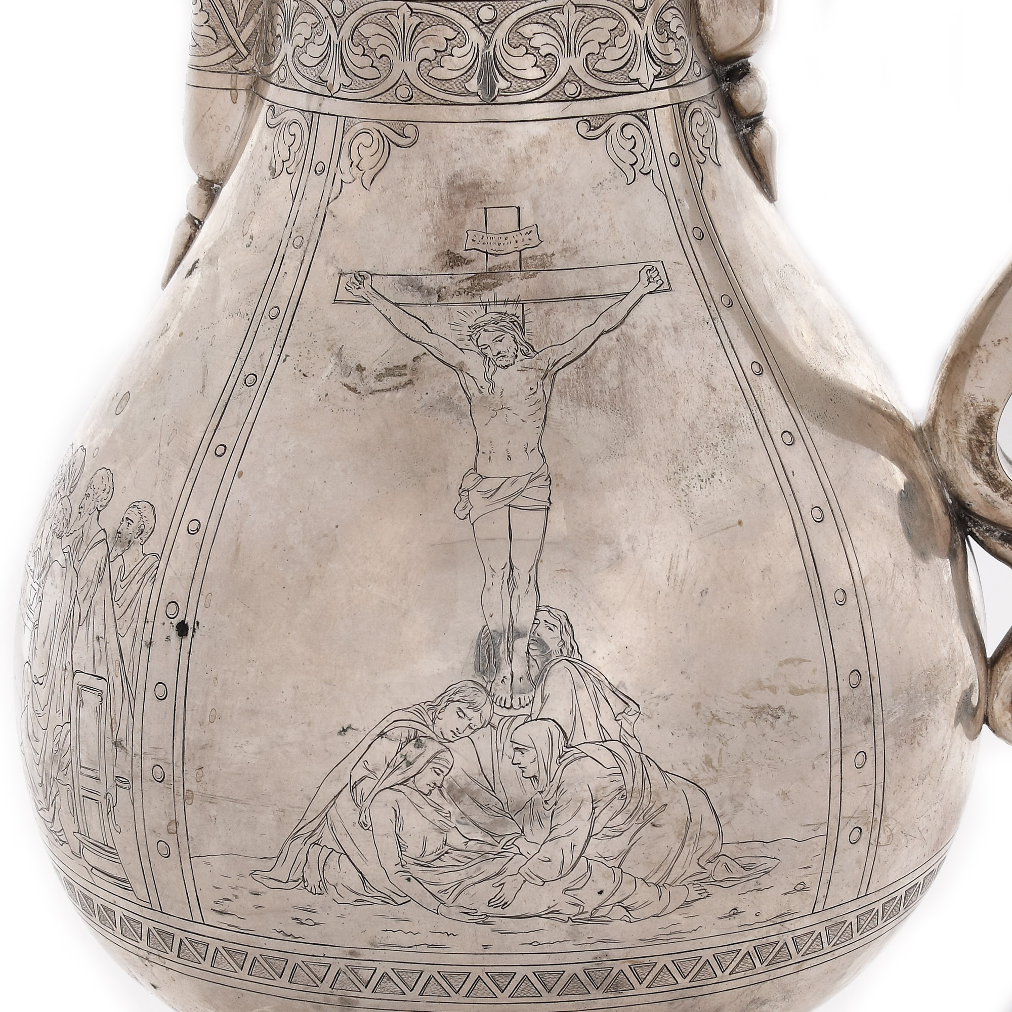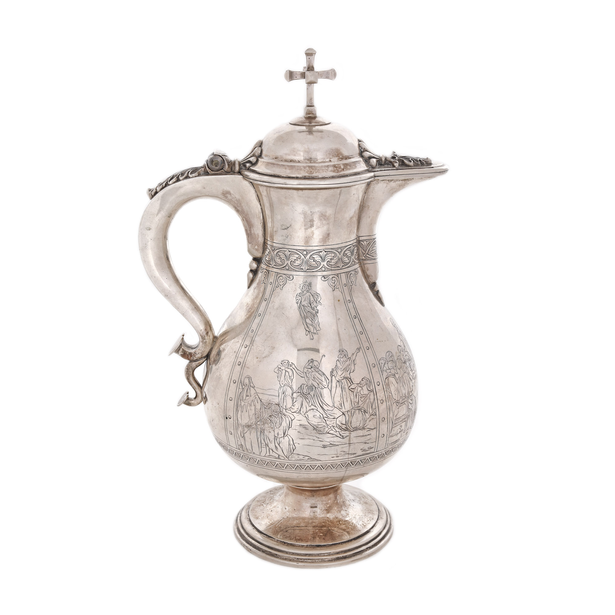 73. Carafă din argint aurit, pentru aghiazmă sau vin, decorată cu scenele ”Cina cea de Taină”, ”Răstignirea și Înălțarea Domnului”, 1886, piesă rară, de colecție