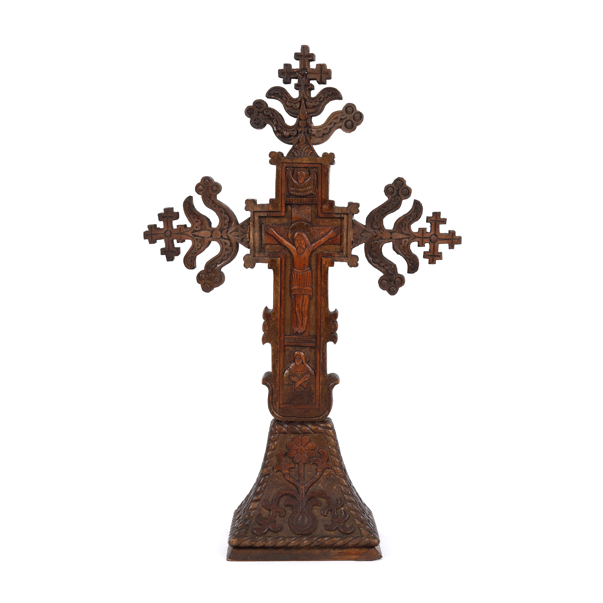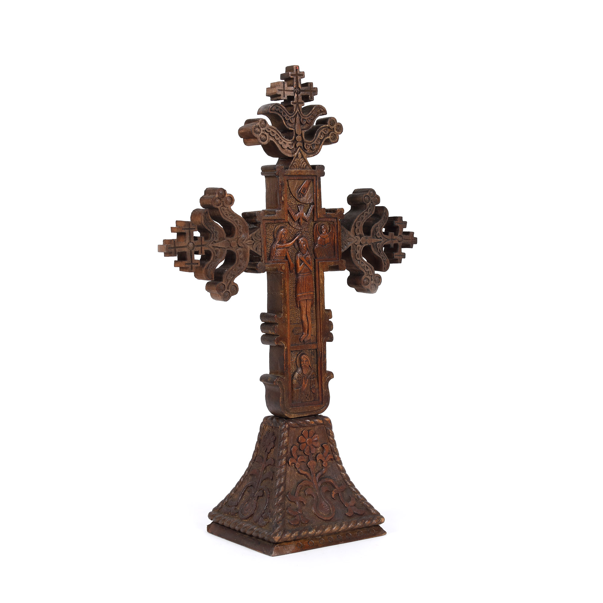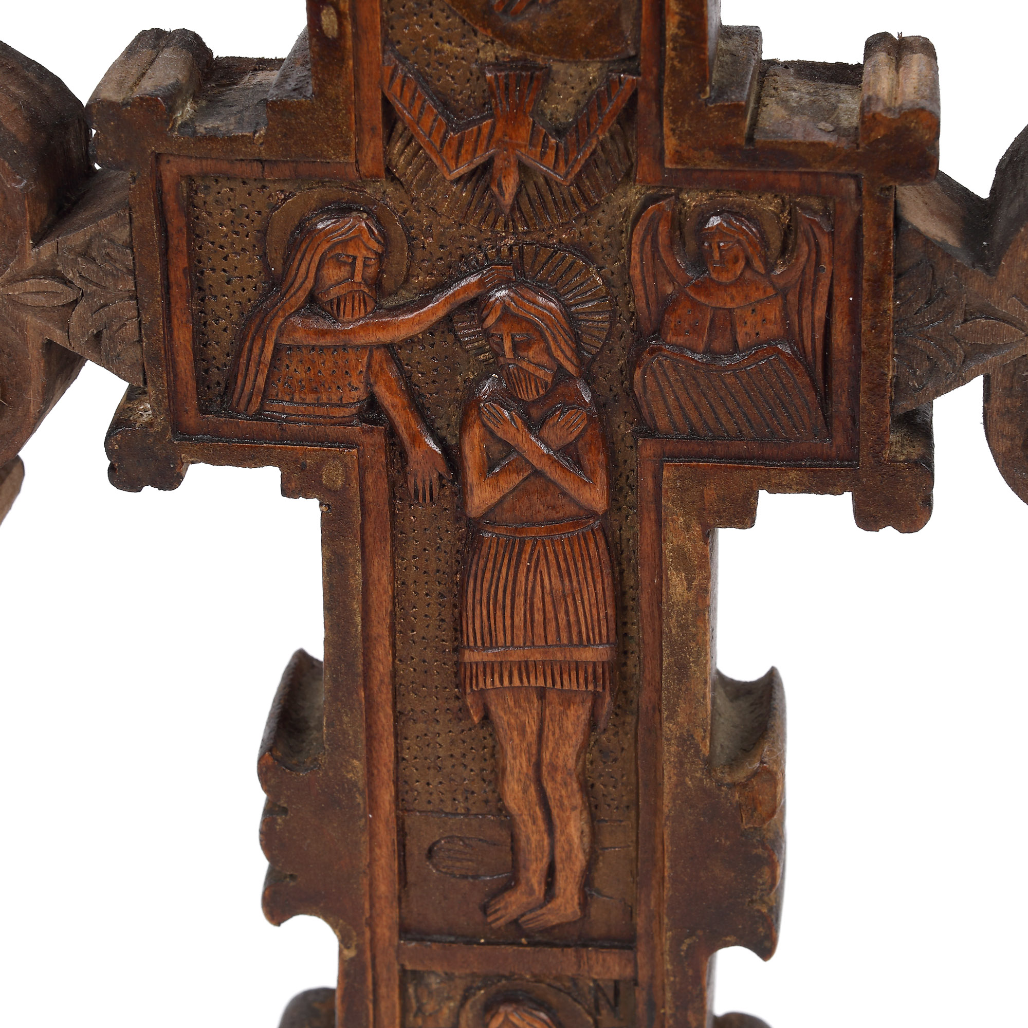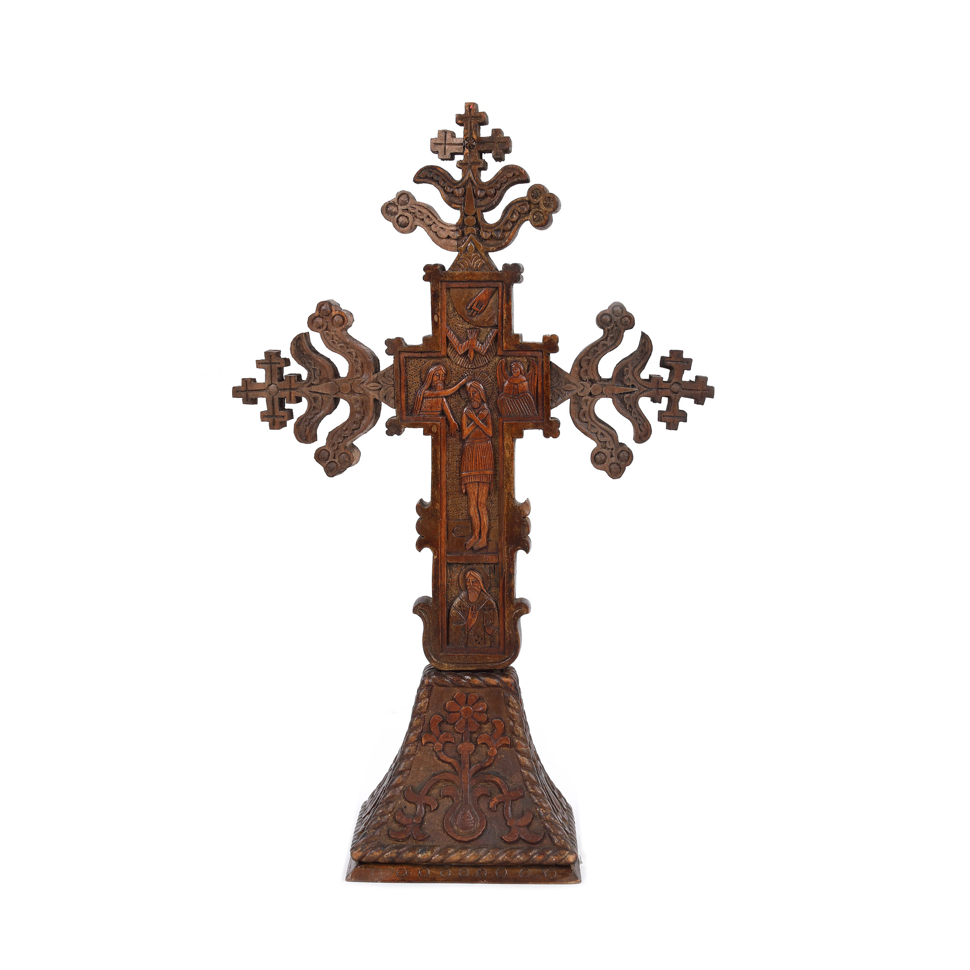 117. Cruce de masă, sculptată cu scenele ”Răstignirea” și ”Botezul Domnului”, probabil diaconul Mușat, Muntenia, sec. XIX