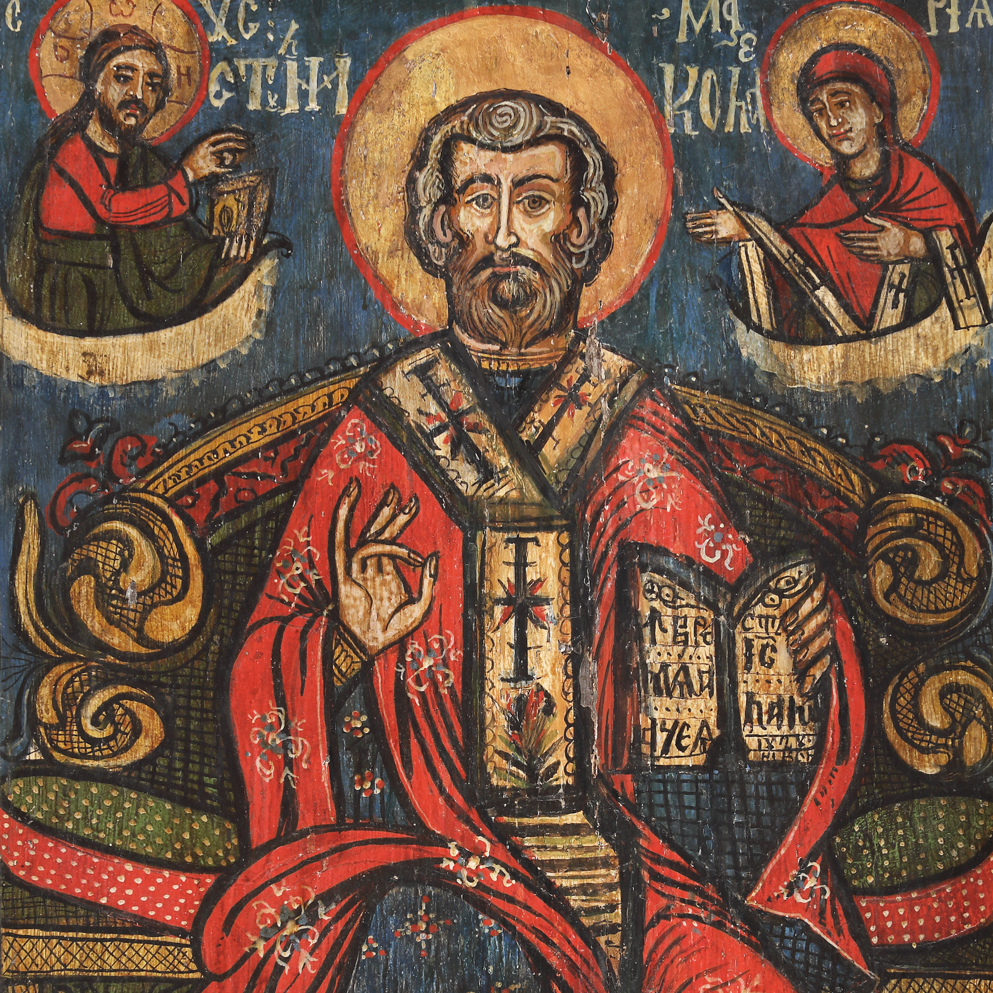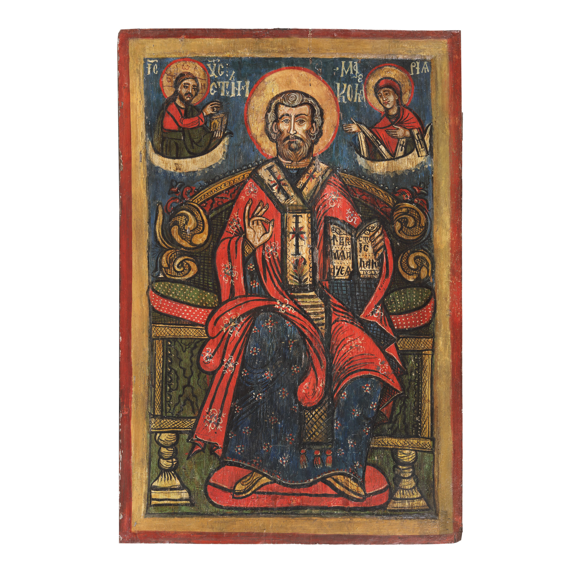 159. Icoană împărătească pe lemn, "Sfântul Nicolae pe tron", școală post-brâncovenească, 1828