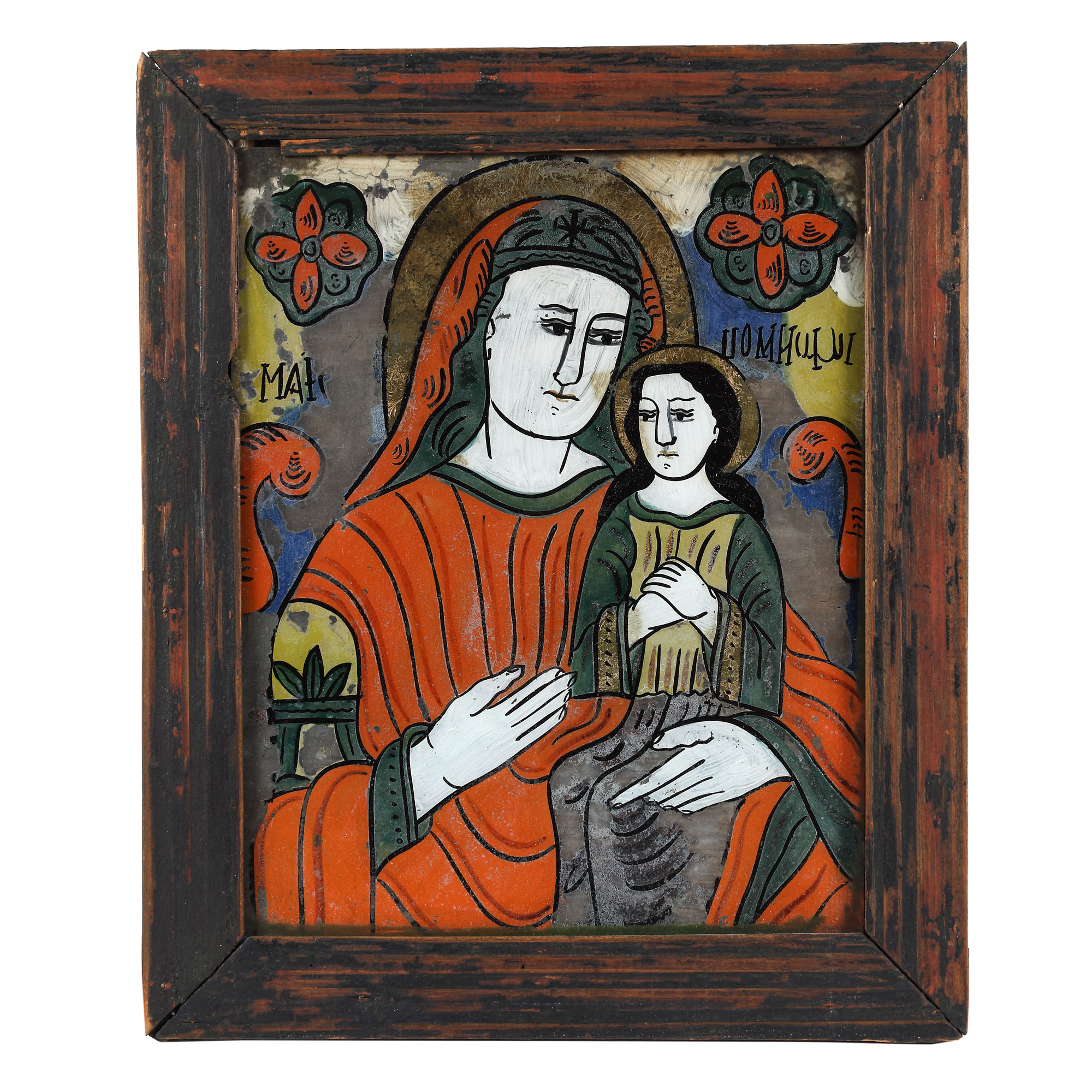 100. Icoană pe glajă, ”Maica Domnului cu Pruncul (Hodighitria)”, atelier din Nicula, a doua jumătate a sec. XIX, provine din colecția istorică Șerban Țuculescu-Maria Galaction