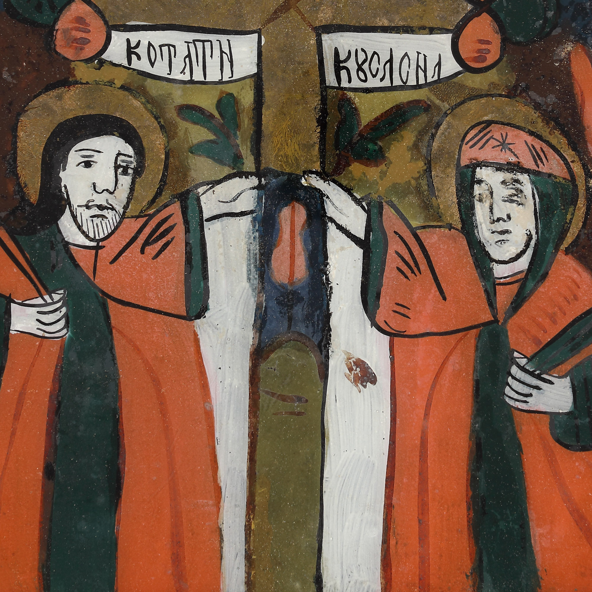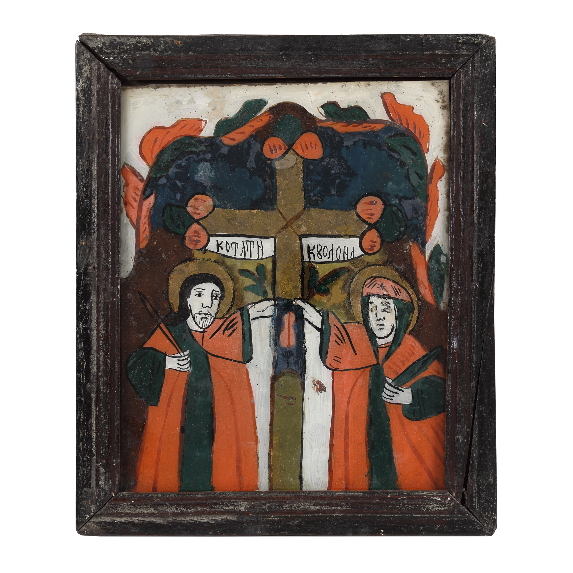 106. Icoană pe glajă, ”Sfinții Împărați Constantin și Elena”, atelier din Nicula, a doua jumătate a sec. XIX