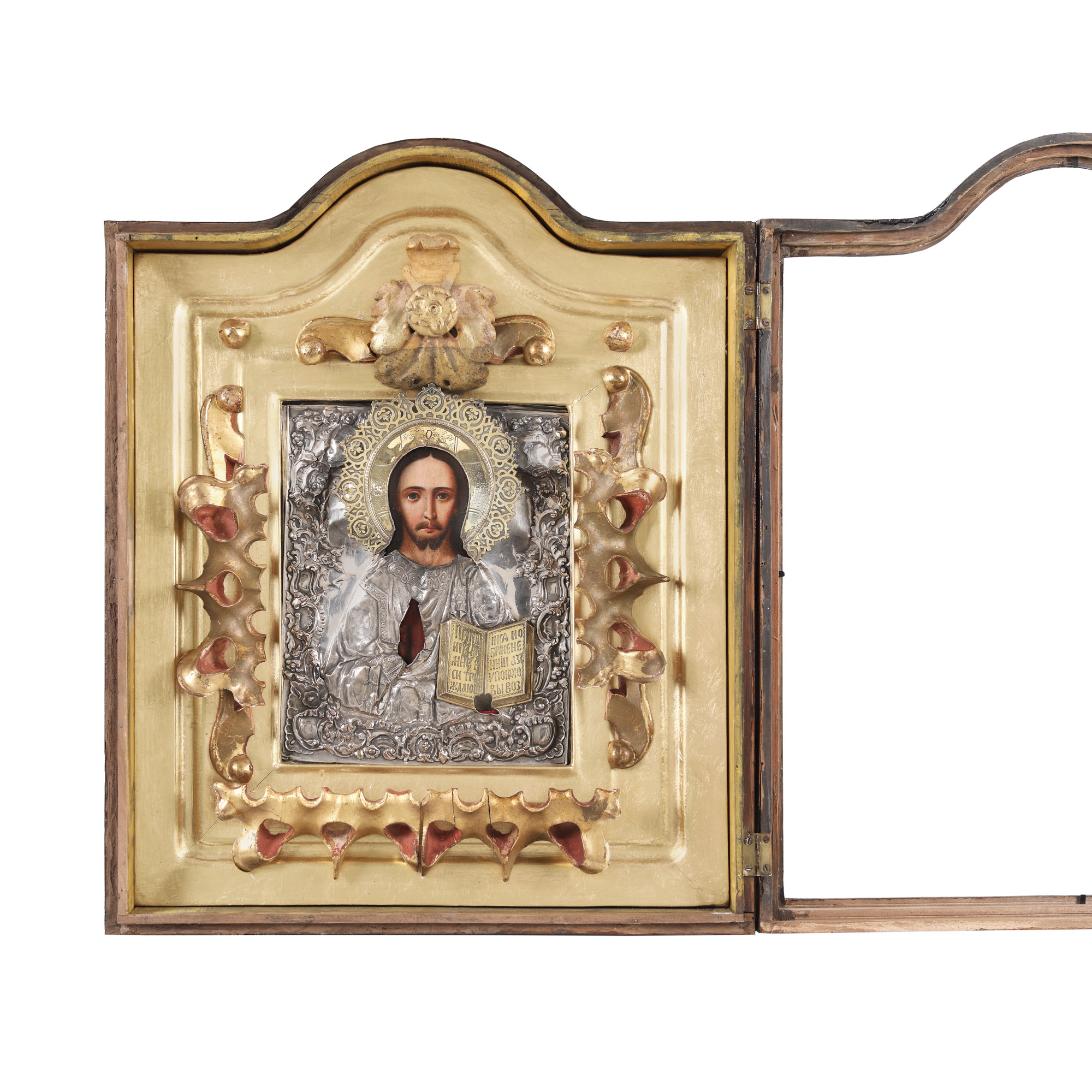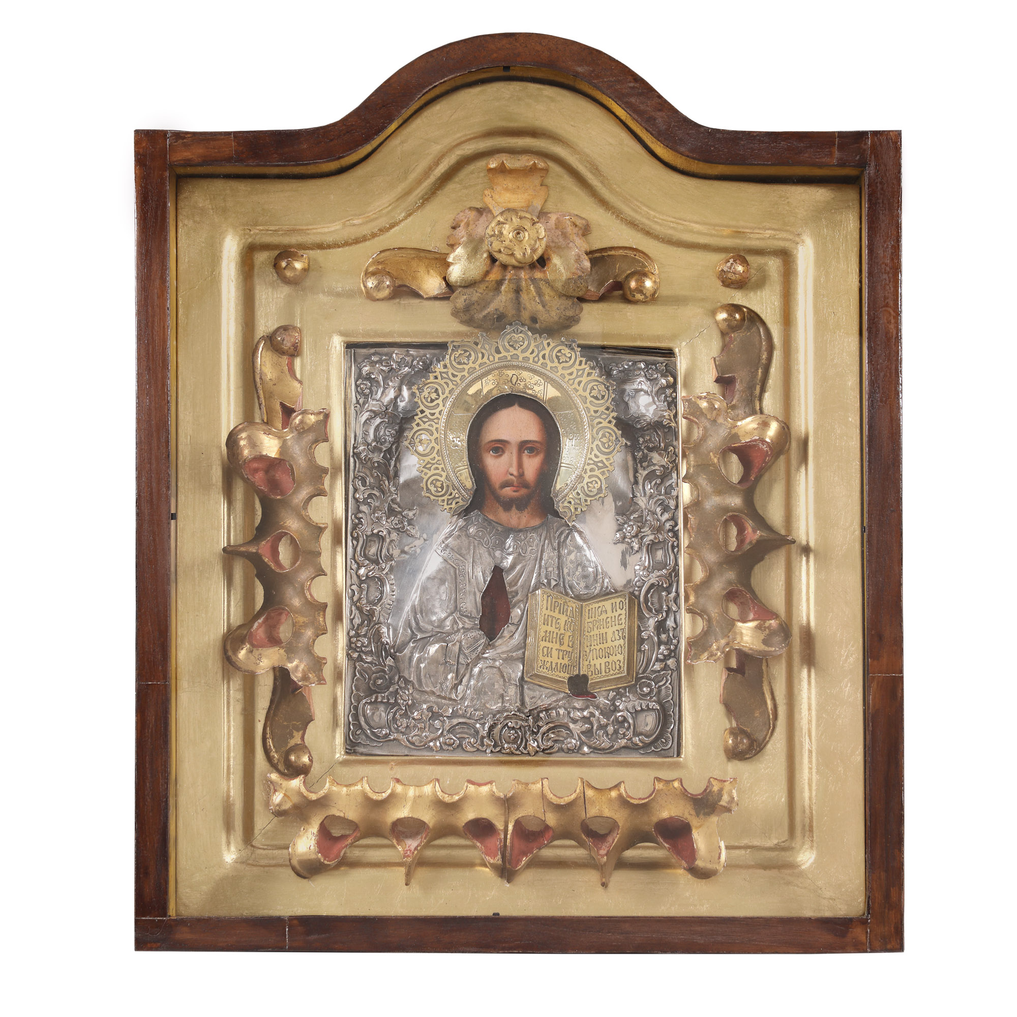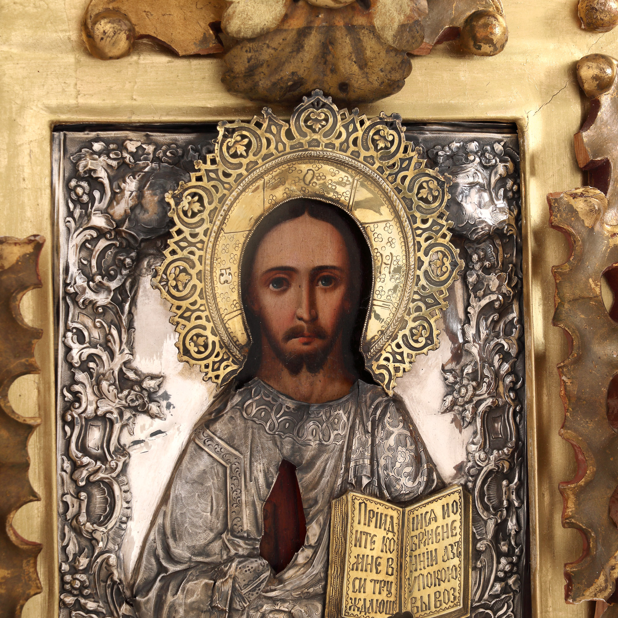 128. Icoană pe lemn, cu ferecătură din argint, ”Iisus Pantocrator”, școală rusească, cca. 1850