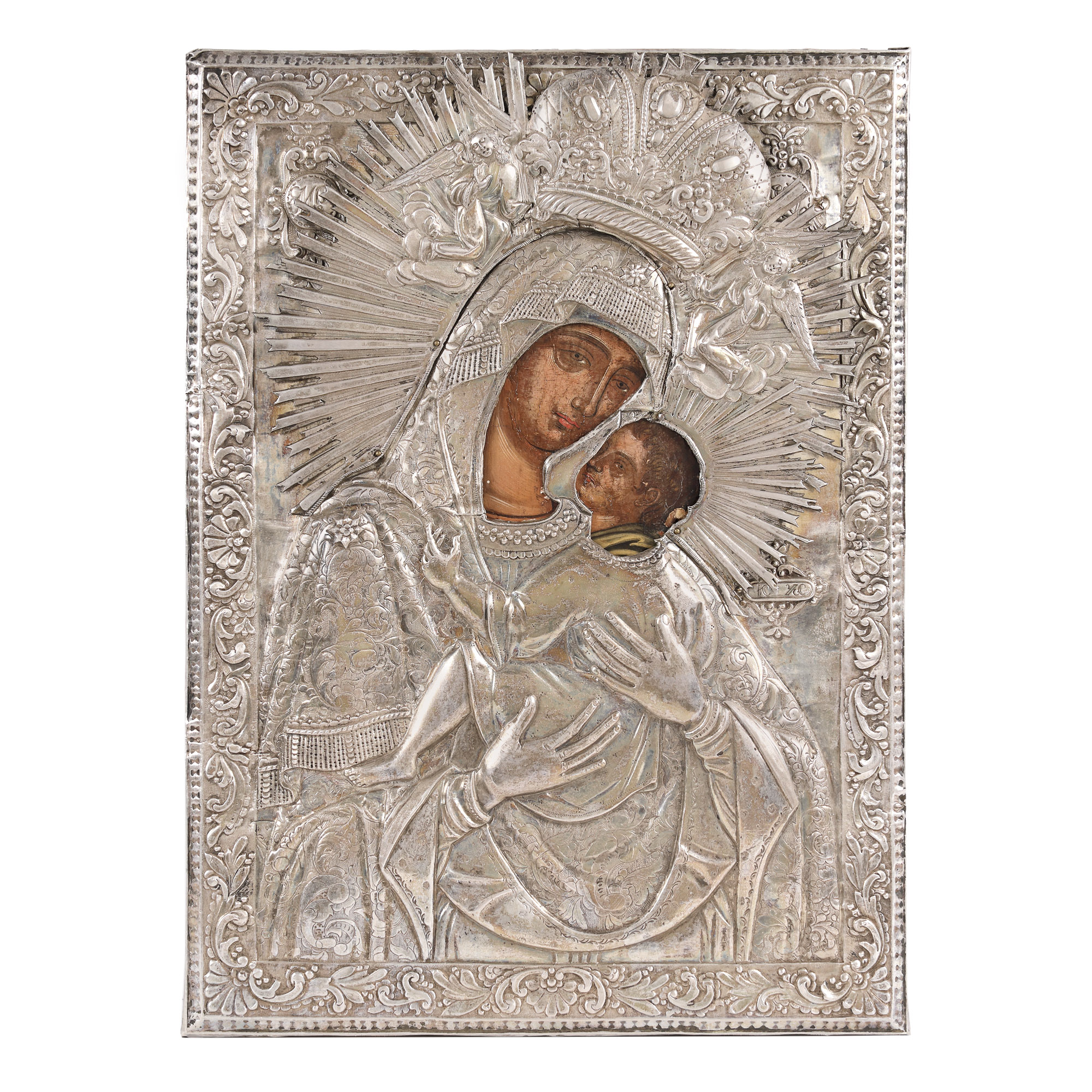 124. Icoană pe lemn, cu ferecătură din argint, ”Maica Domnului cu Pruncul (Glikofilusa)”, școală românească, începutul sec. XIX, piesă de colecție