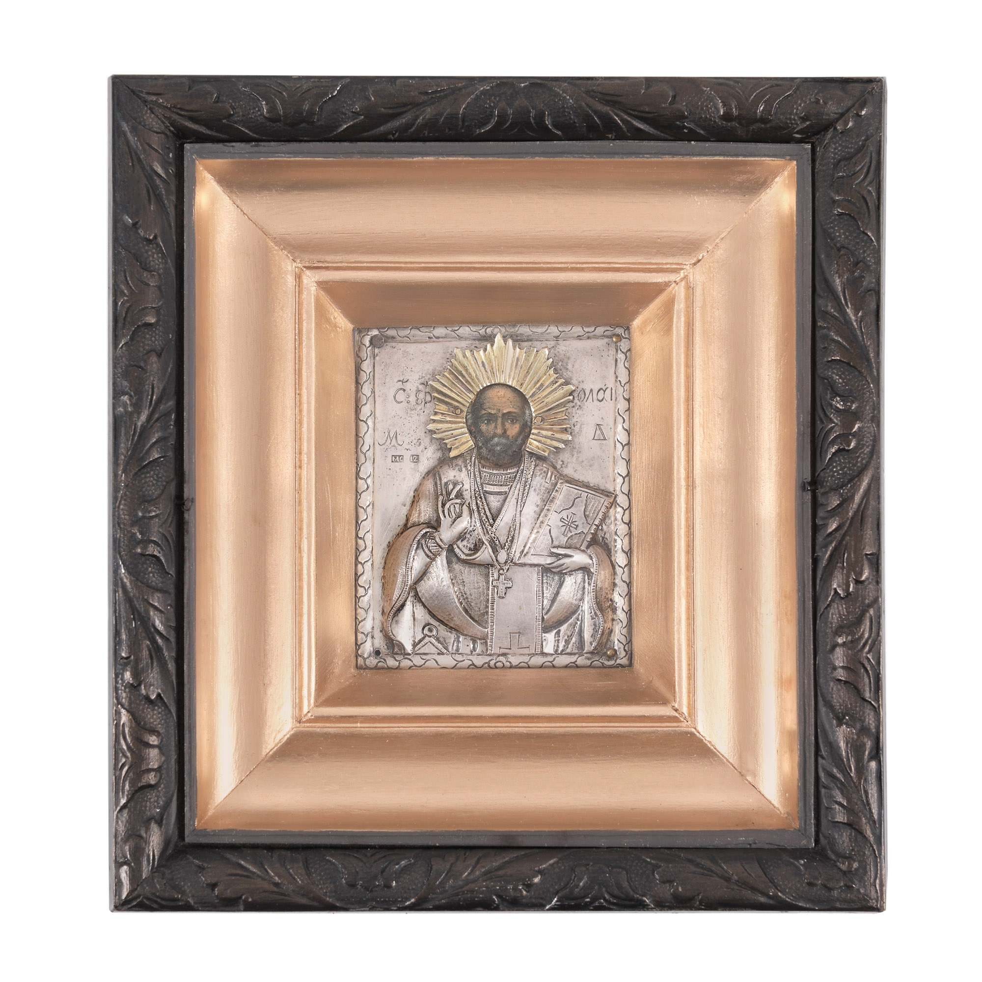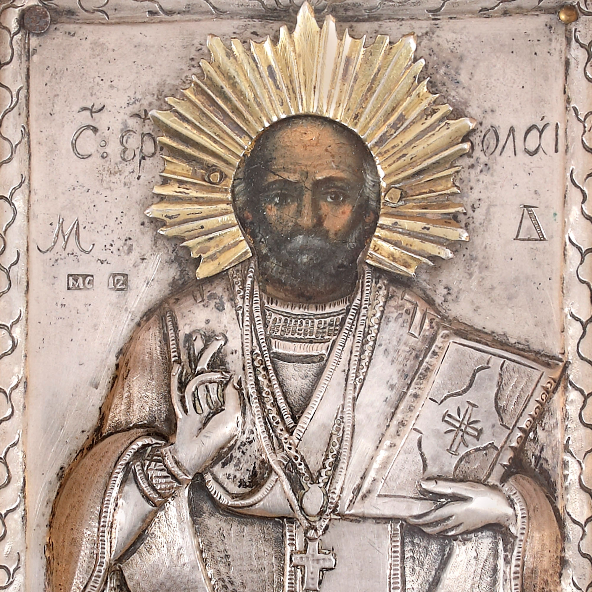 132. Icoană pe lemn, cu ferecătura din argint, ”Sfântul Nicolae”, școală românească, sfârșitul sec. XIX