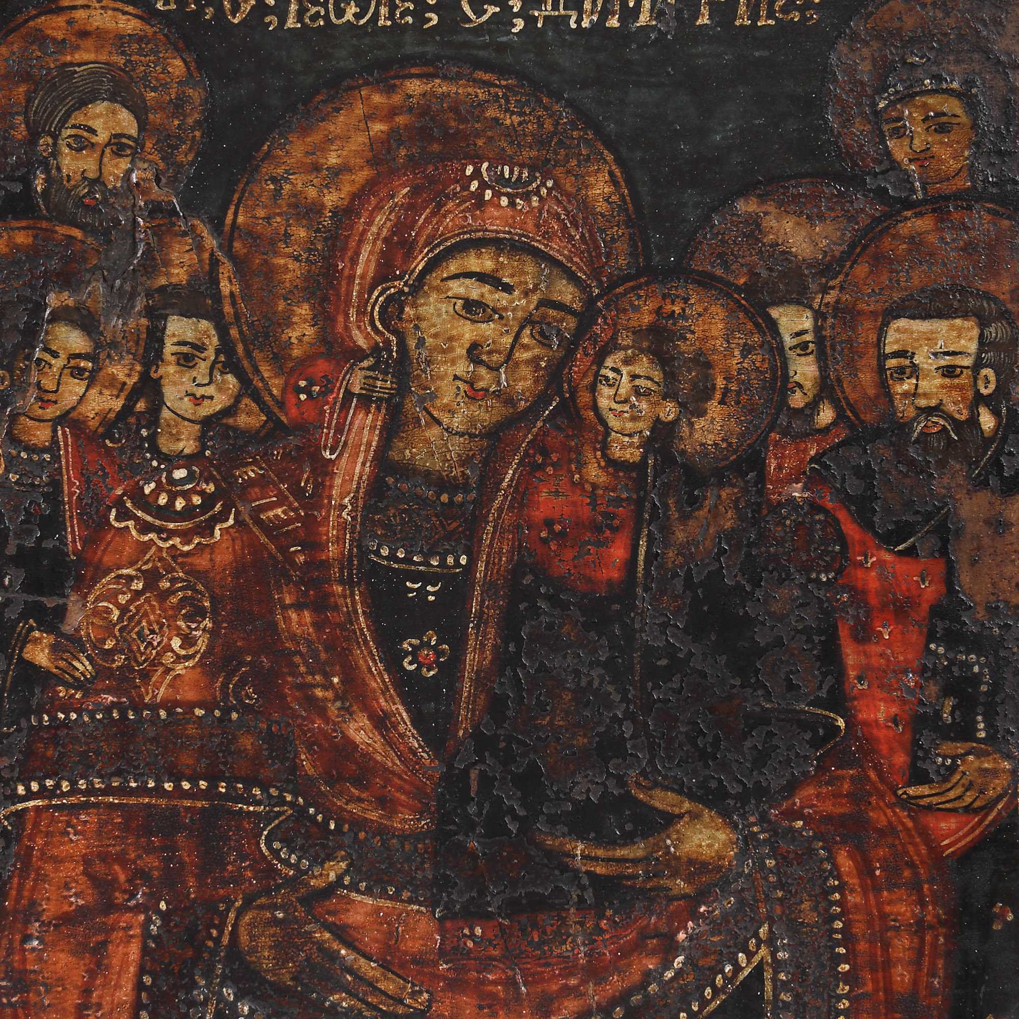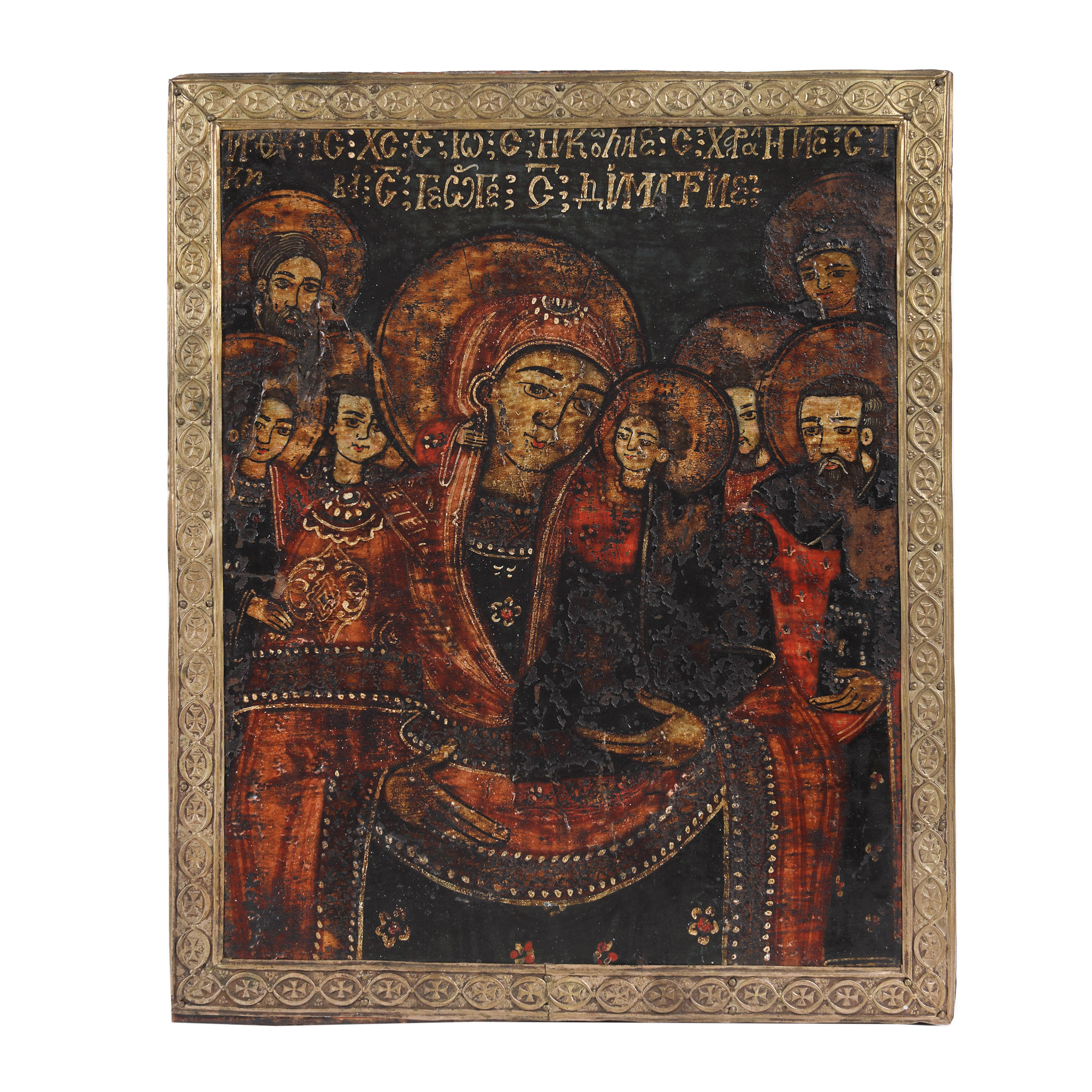 151. Icoană pe lemn, cu riză, ”Maica Domnului cu Pruncul”, școală românească, sfârșitul sec. XVIII - începutul sec. XIX