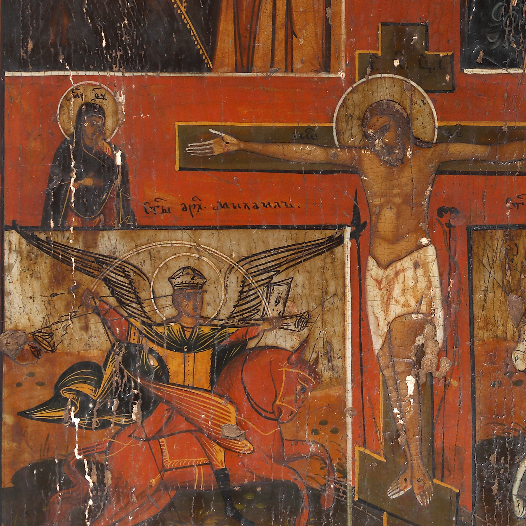 149. Icoană pe lemn, în patru registre, ”Maica Domnului cu Pruncul (Kazanskaia), Sfântul Nicolae, Sfântul Arhanghel Mihail și Sfântul Gheorghe ucigând balaurul”, școală rusească, sec. XIX