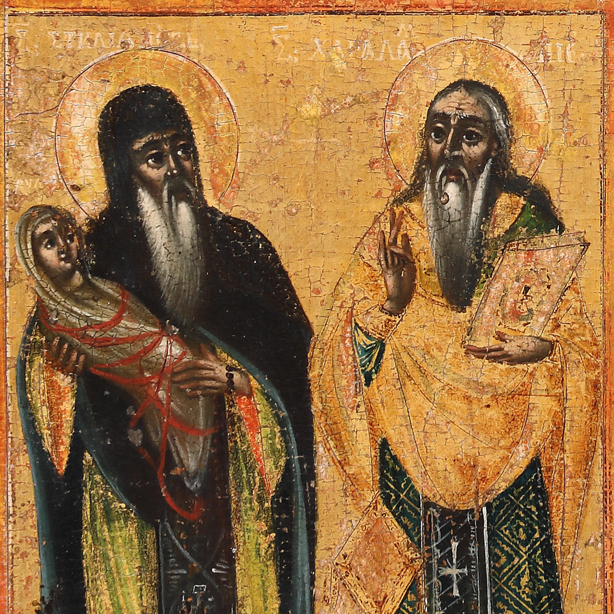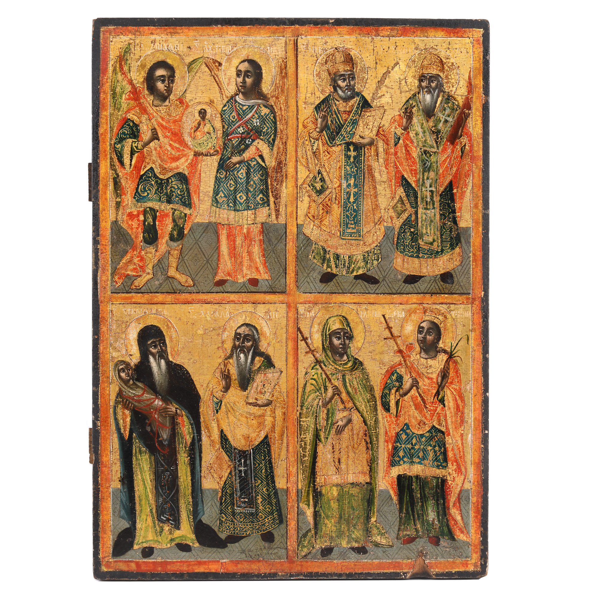 152. Icoană pe lemn, în patru registre, ”Sfinții Arhangheli Mihail și Gavril, Sfinții Ierarhi Nicolae și Spiridon, Sfinții Ierarhi Stelian și Haralambie și Sfintele muncenițe Paraschiva și Ecaterina”, școală românească, începutul sec. XIX