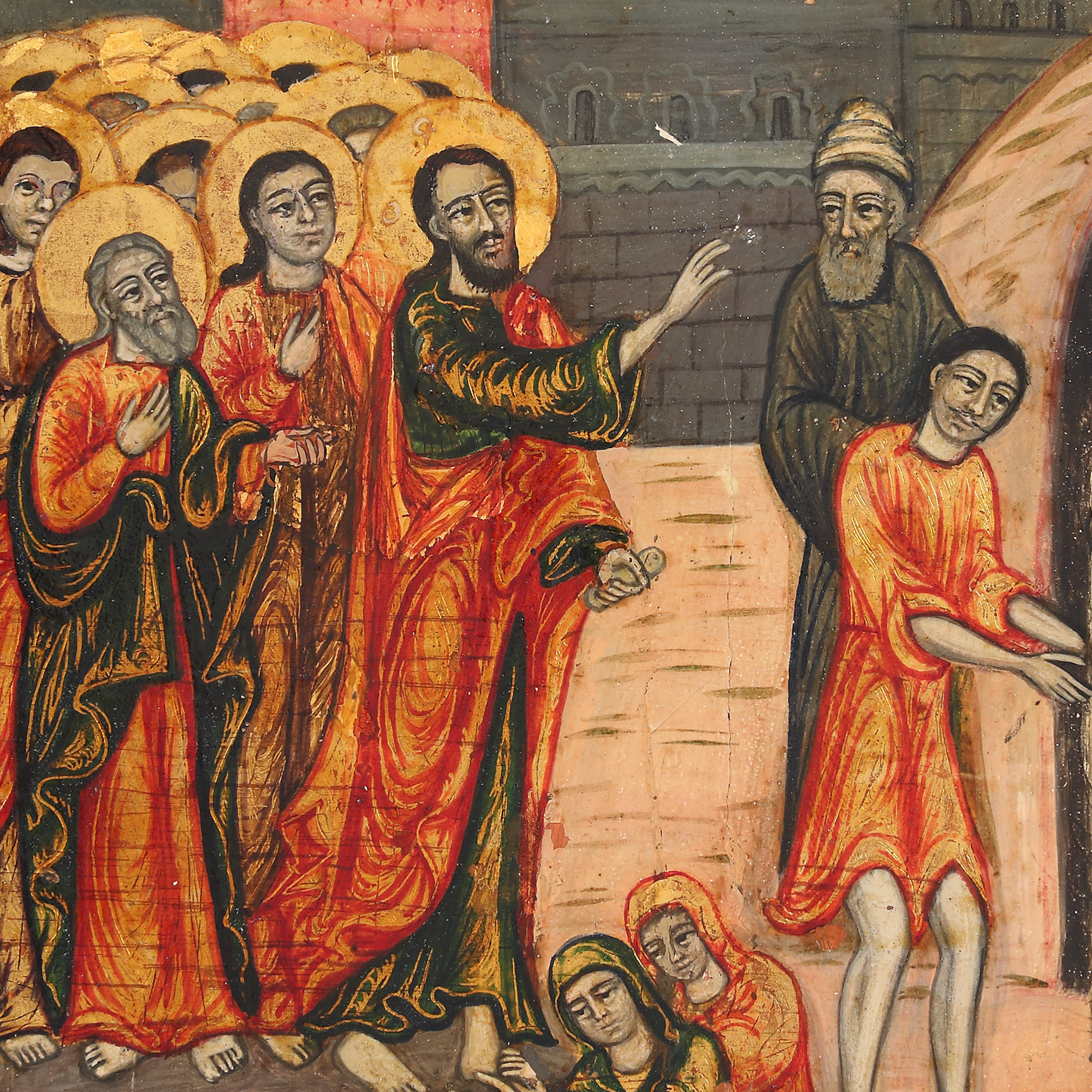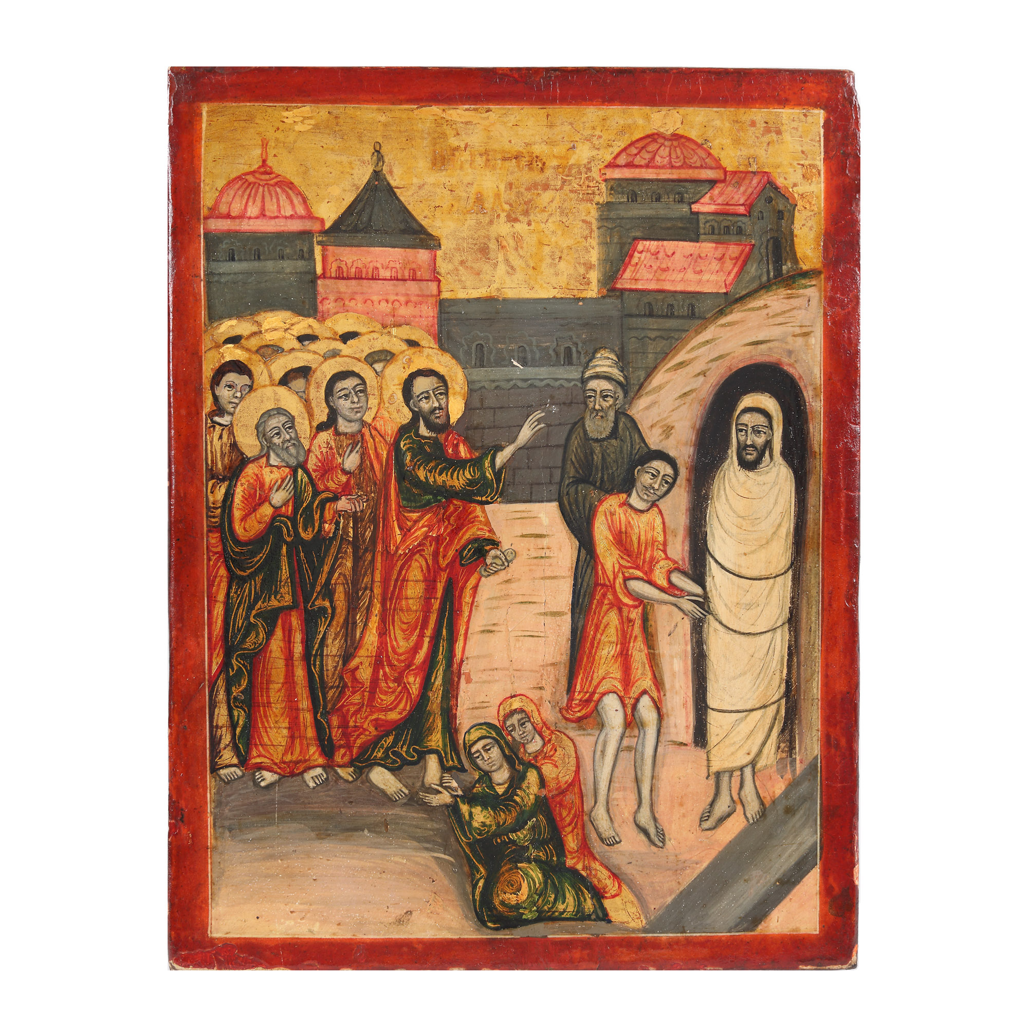 173. Icoană pe lemn, ”Învierea lui Lazăr”, școală grecească, sfârșitul sec. XVIII - începutul sec. XIX