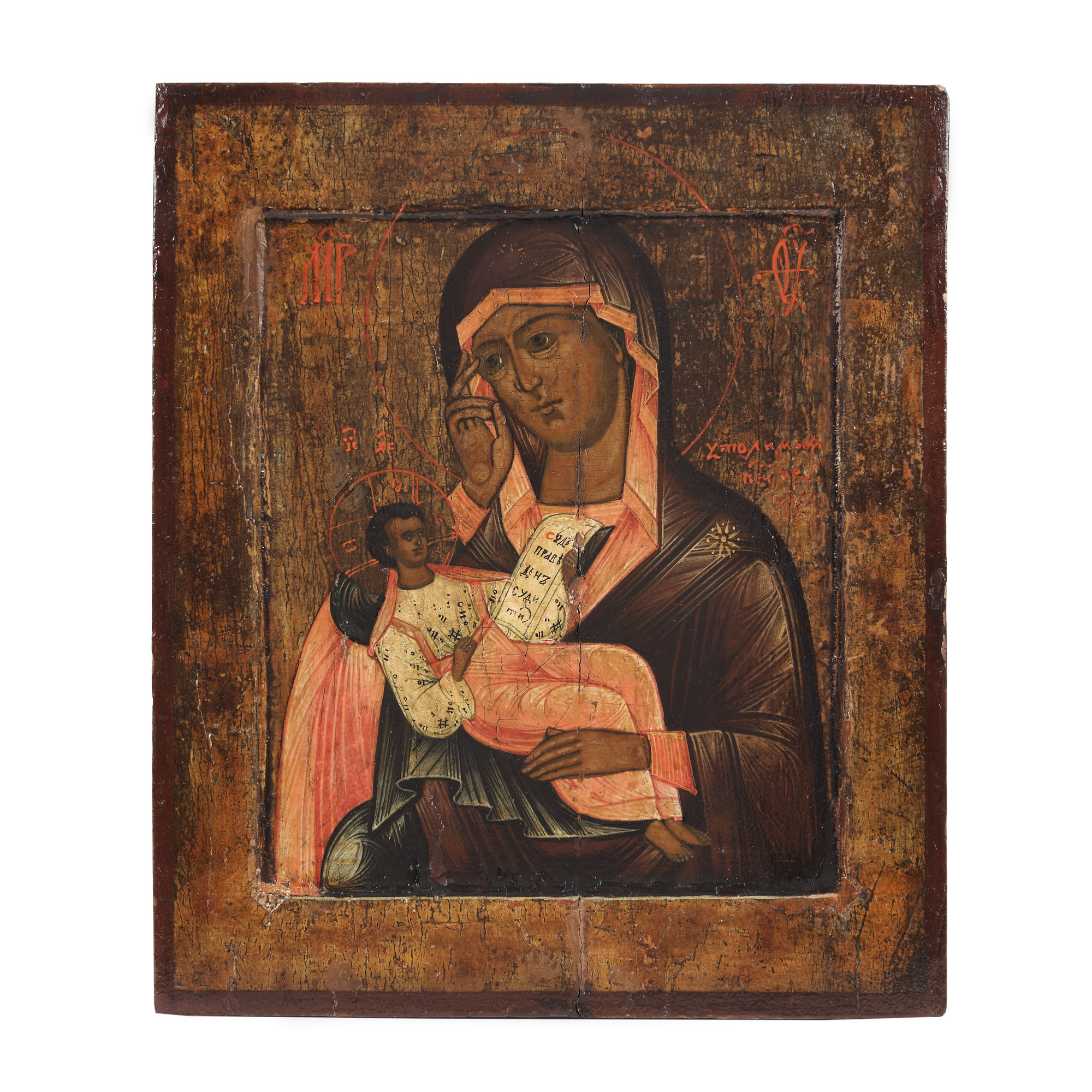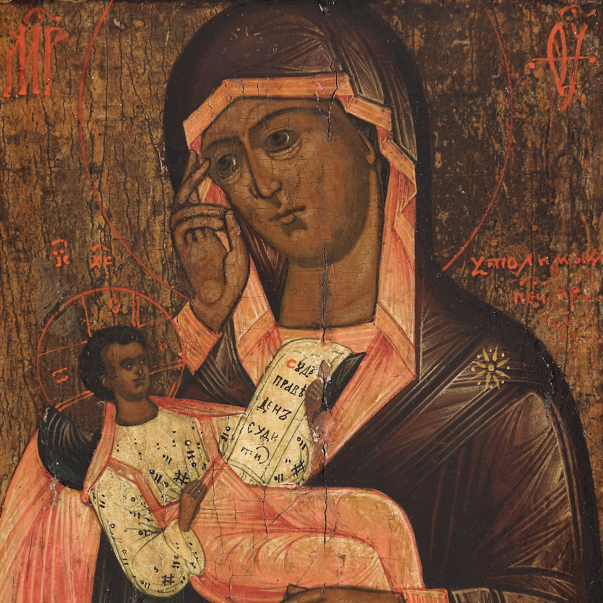 142. Icoană pe lemn, ”Maica Domnului cu Pruncul”, școală rusească, prima jumătate a sec. XIX