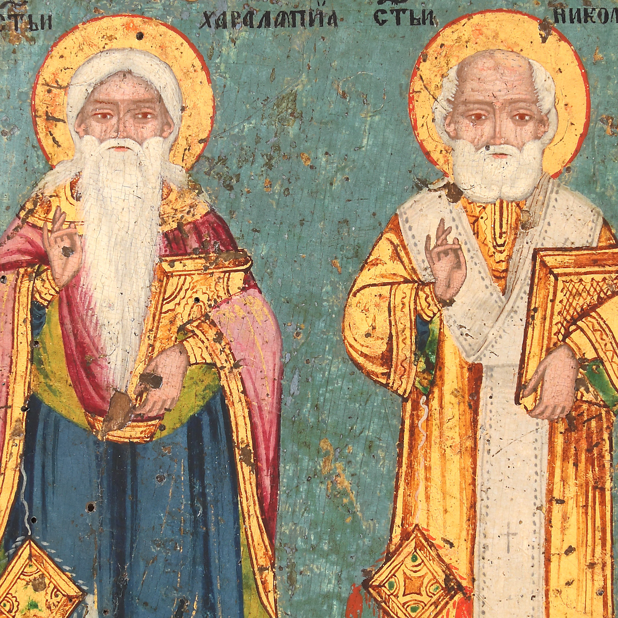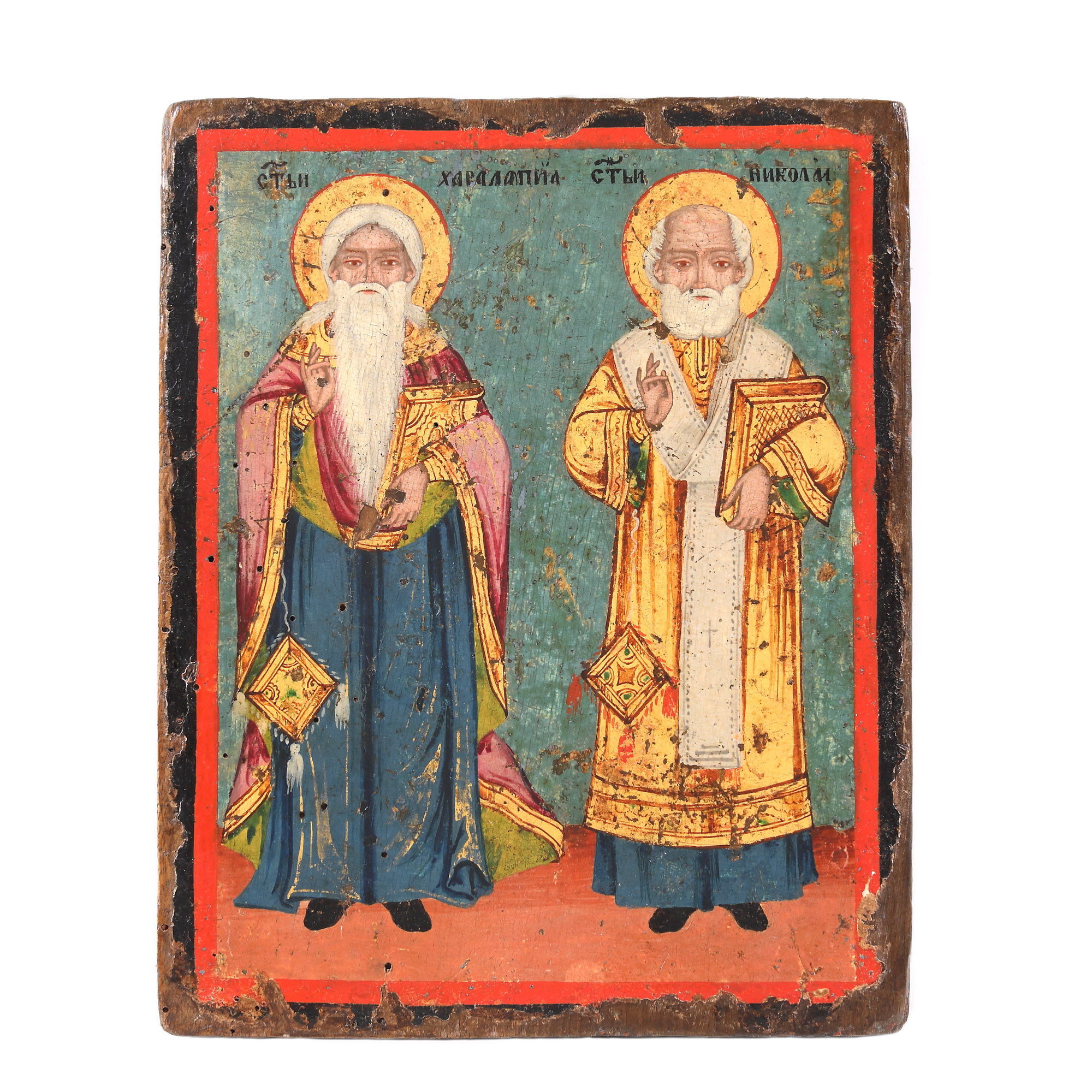 181. Icoană pe lemn, ”Sfinții Ierarhi Haralambie și Nicolae”, școală sud-dunăreană de influență grecească, începutul sec. XIX