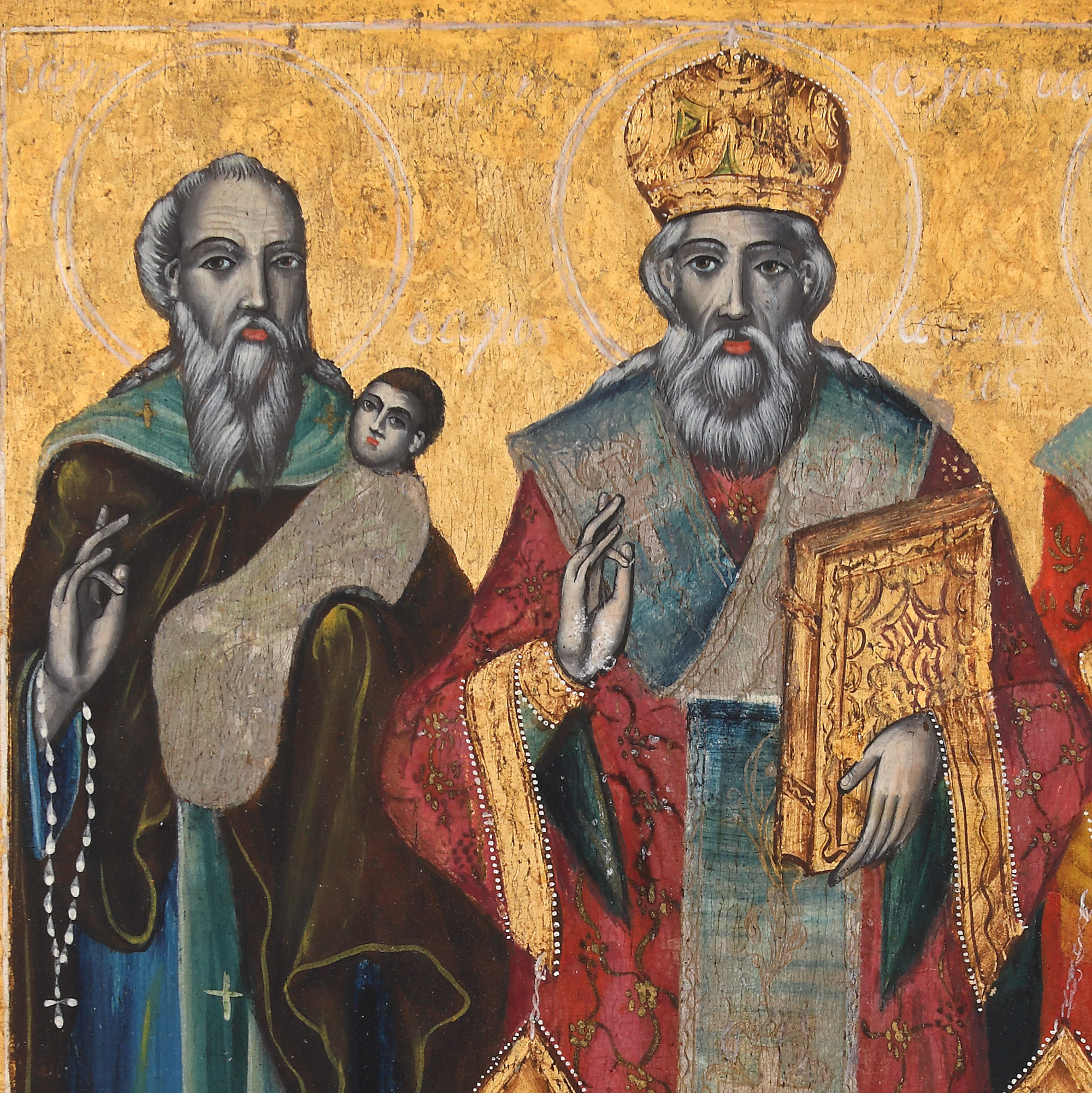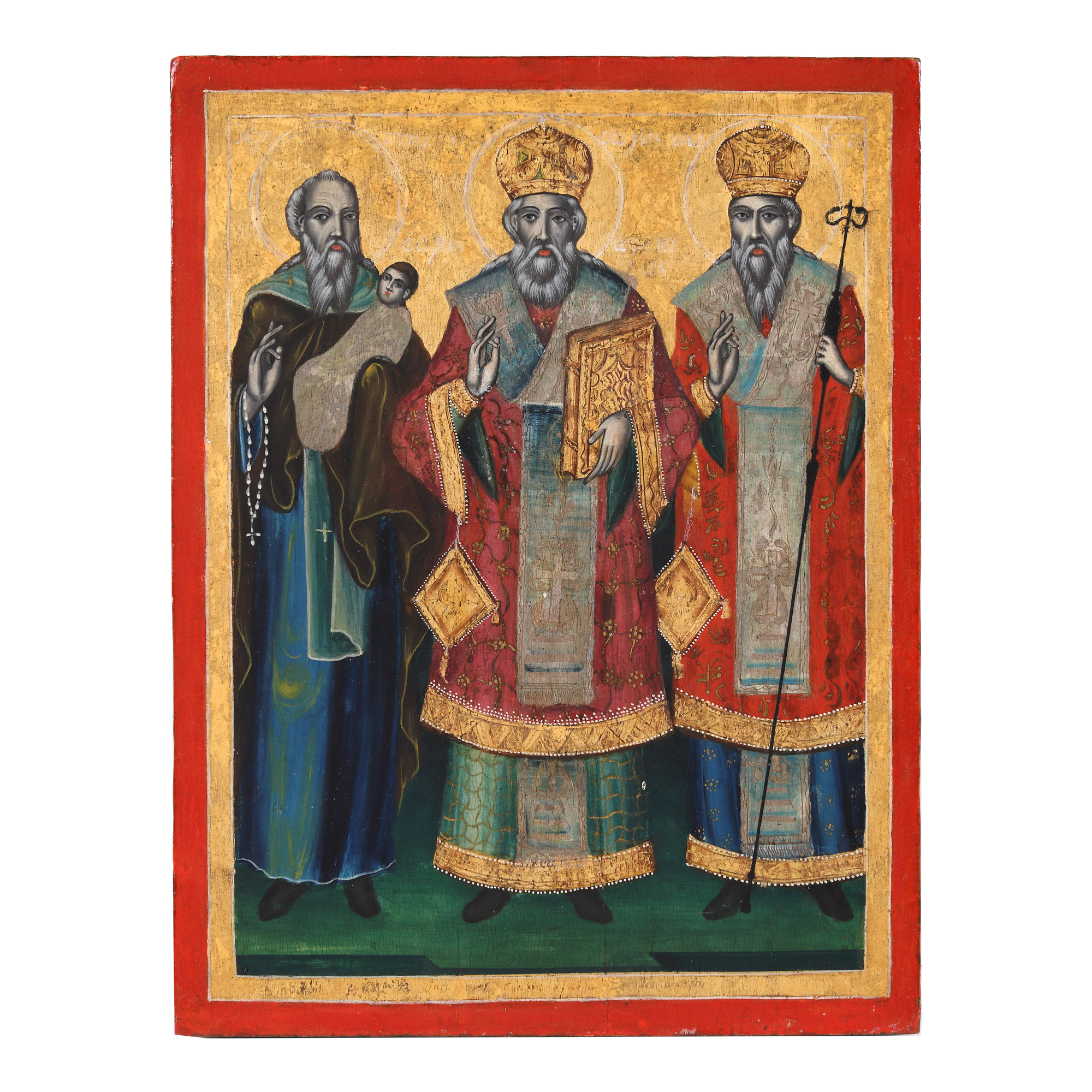 59. Icoană pe lemn, ”Sfinții Stelian, Atanasie și Modest”, școală grecească, 1877