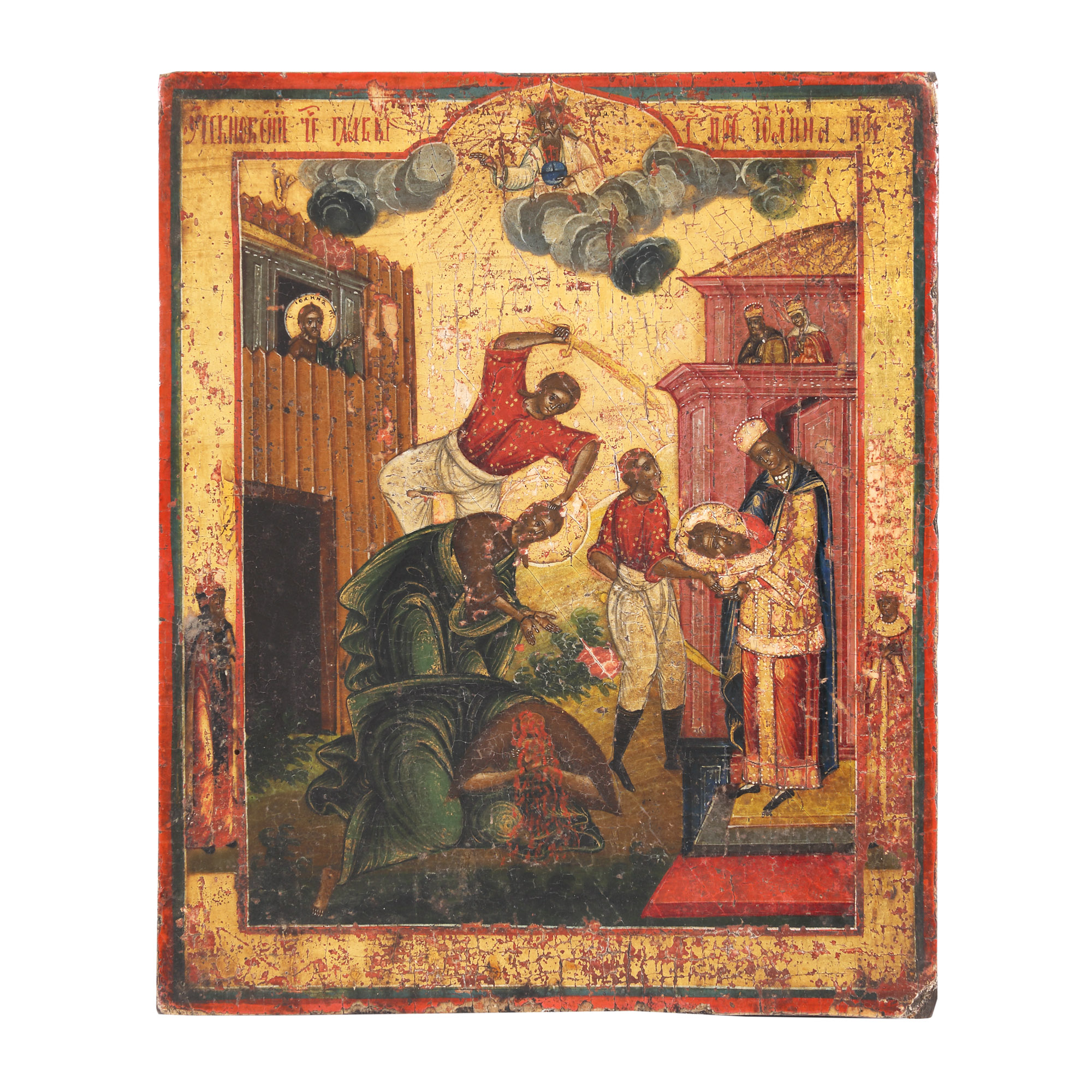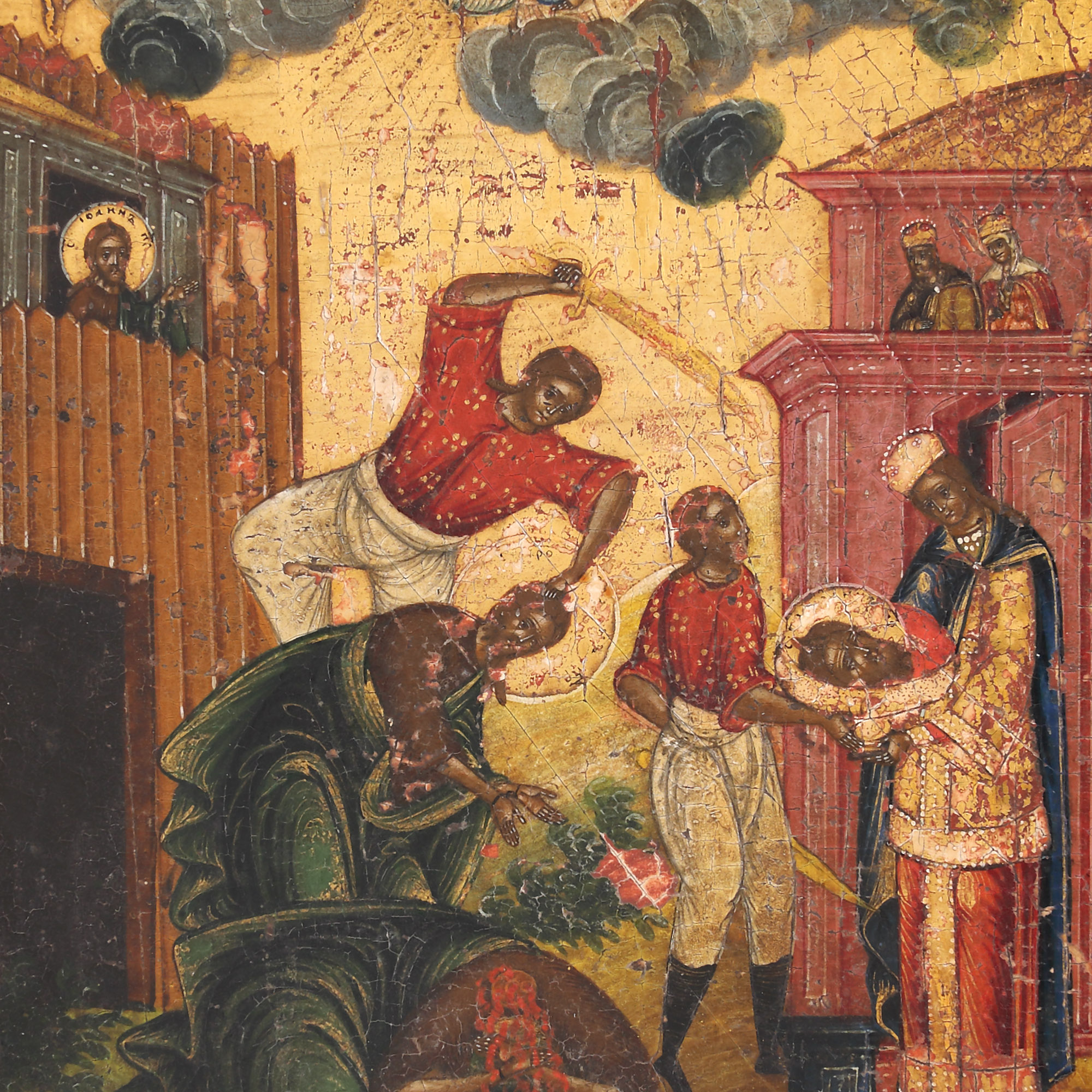 141. Icoană pe lemn, "Tăierea capului Sfântului Ioan Botezătorul", școală rusească, începutul sec. XIX