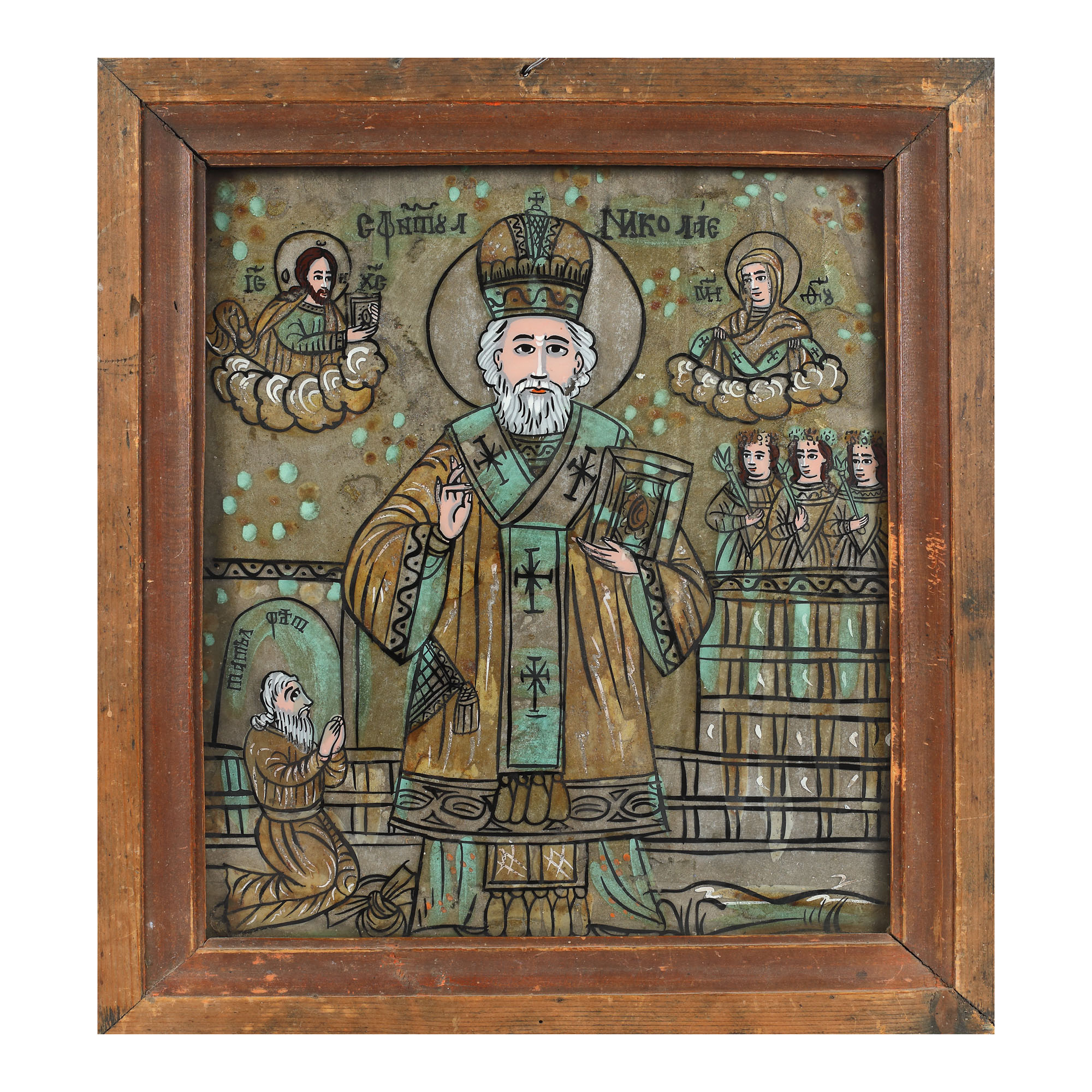 51. Icoană pe glajă, ”Sfântul Nicolae”, ramă băițuită, cu șforț, atribuit zugrav Nicolae Oancea din Vale, jumătatea sec. XIX