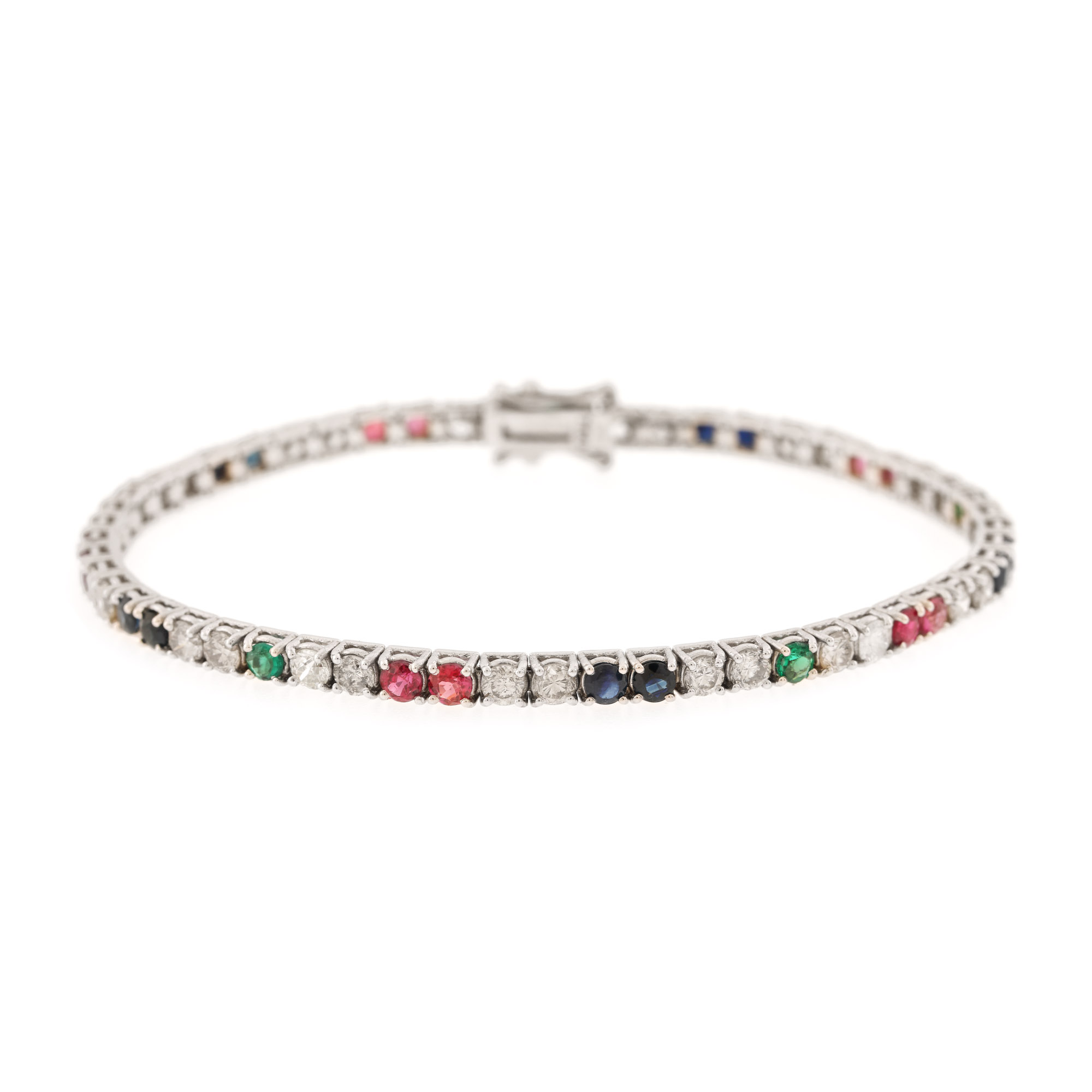 53. Brățară tennis din aur alb, decorată cu diamante, rubine, safire și tsavorite