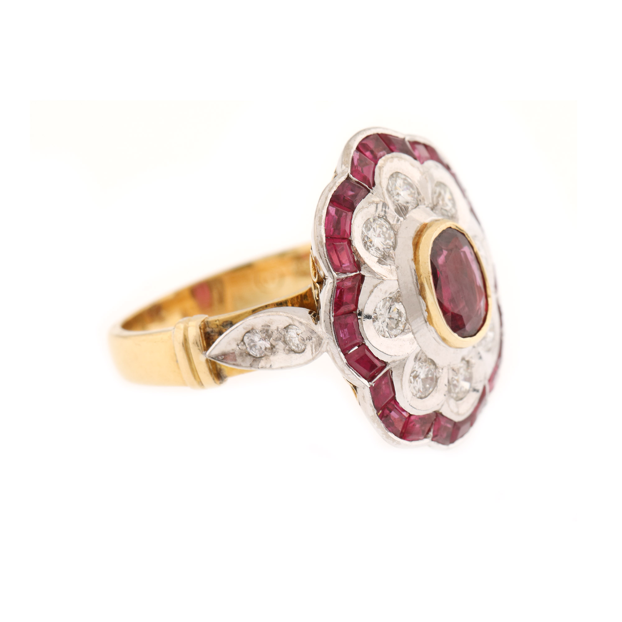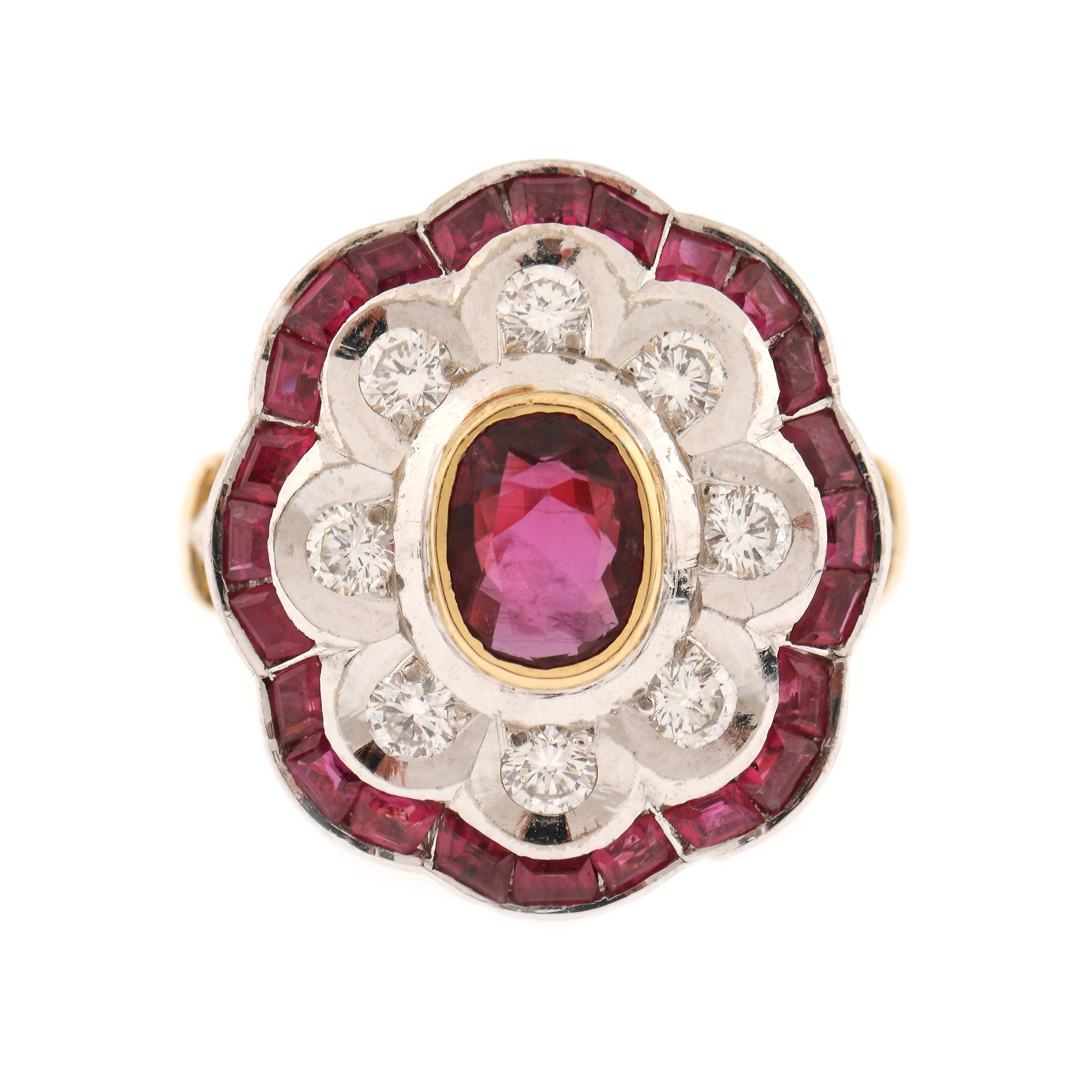 1 rubin oval fațetat, culoare roșu, claritate SI, cca. 1,35 ct., 8 diamante rotunde briliant, culoare G-H, claritate VS, cca. 0,6 ct. și 24 rubine calibre cut, culoare roșu, claritate SI, cca. 1,6 ct.