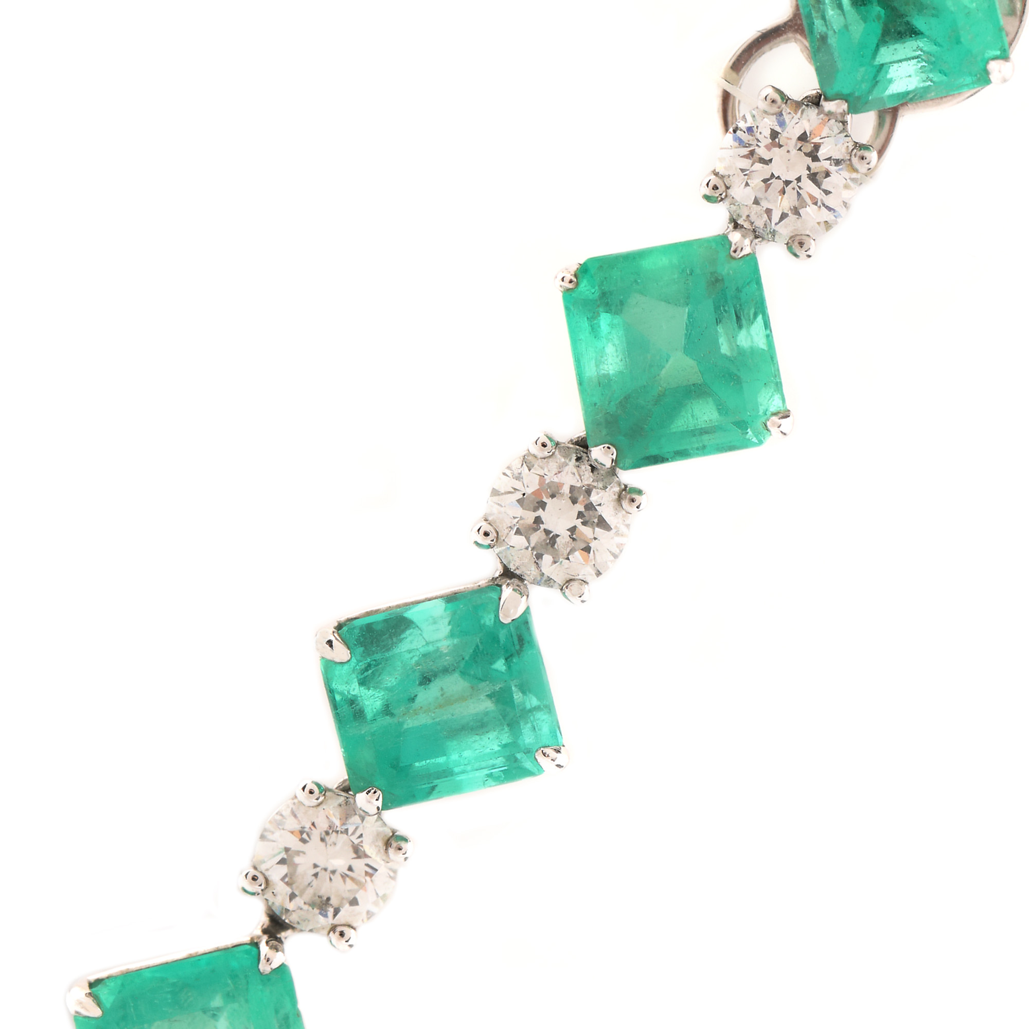8 smaralde pătrate step cut, culoare verde, claritate SI-moderately included, cca. 8,50 ct.; 1 diamant pară fațetat, culoare J-K, claritate I2, cca. 1,10 ct.; 6 diamante rotunde briliant, culoare G-H, claritate SI-I1, cca. 1,40 ct. și 1 diamant oval fațetat, culoare H-I, claritate I1, cca. 0,75 ct. smaralde: 4 fracture filled, 4 tratate cu ulei