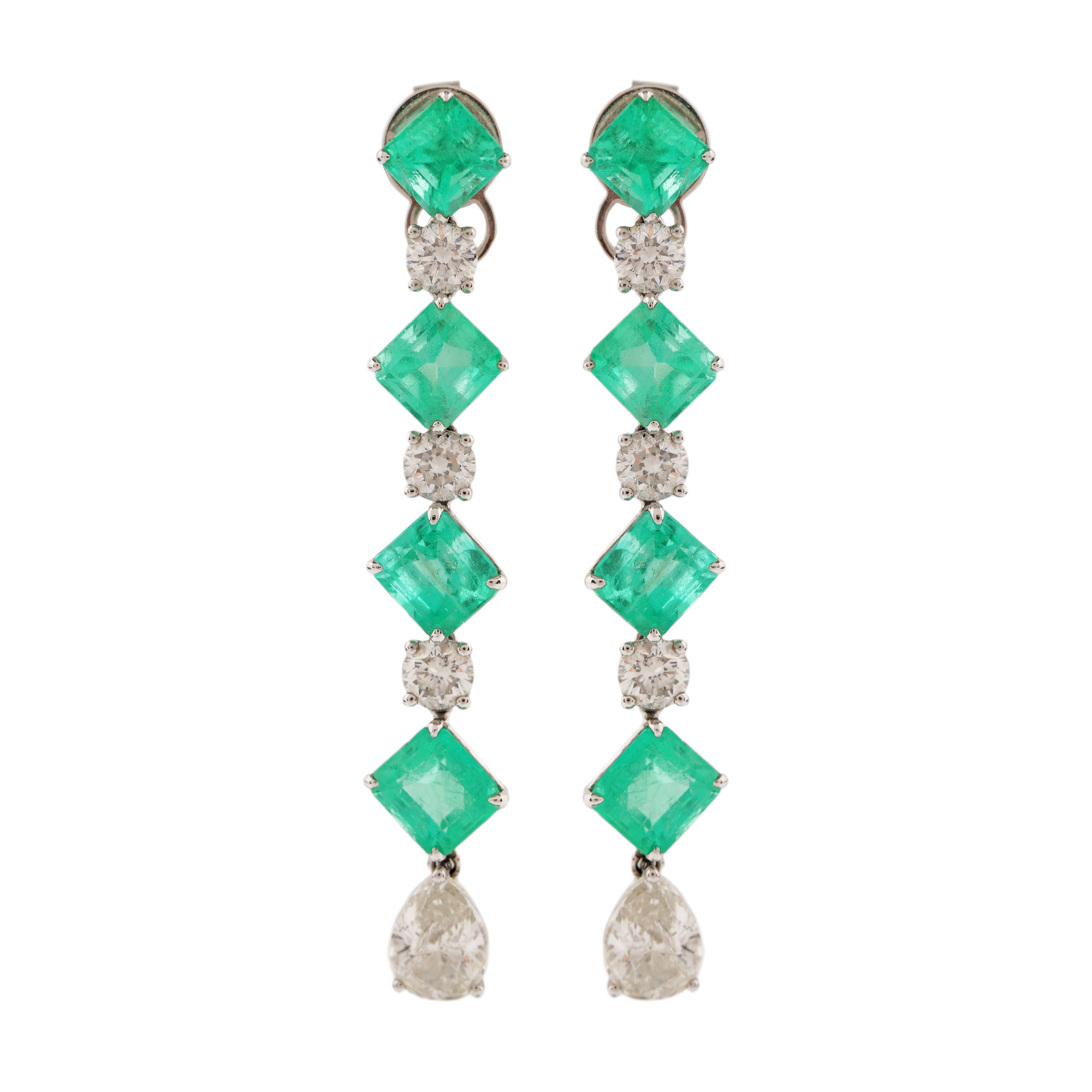 52. Pereche de cercei din aur alb, ornată alternativ cu smaralde și diamante