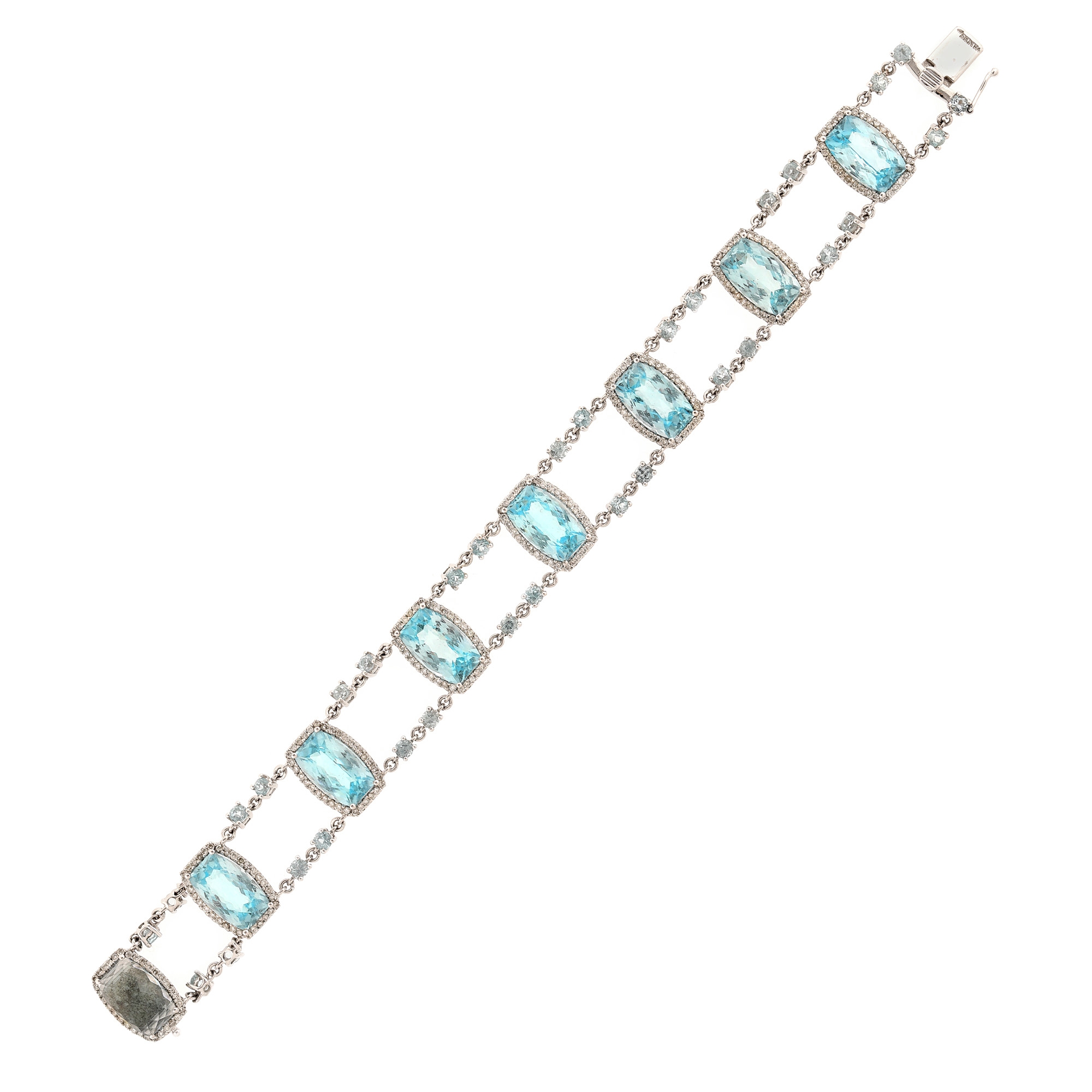 40 topaze (8 checker cut, 32 rotund fațetate), culoare bleu, claritate eye-clean, cca. 27,5 ct. și 256 diamante rotunde briliant, culoare I-J, claritate VS2-I1, cca. 1,3 ct.
