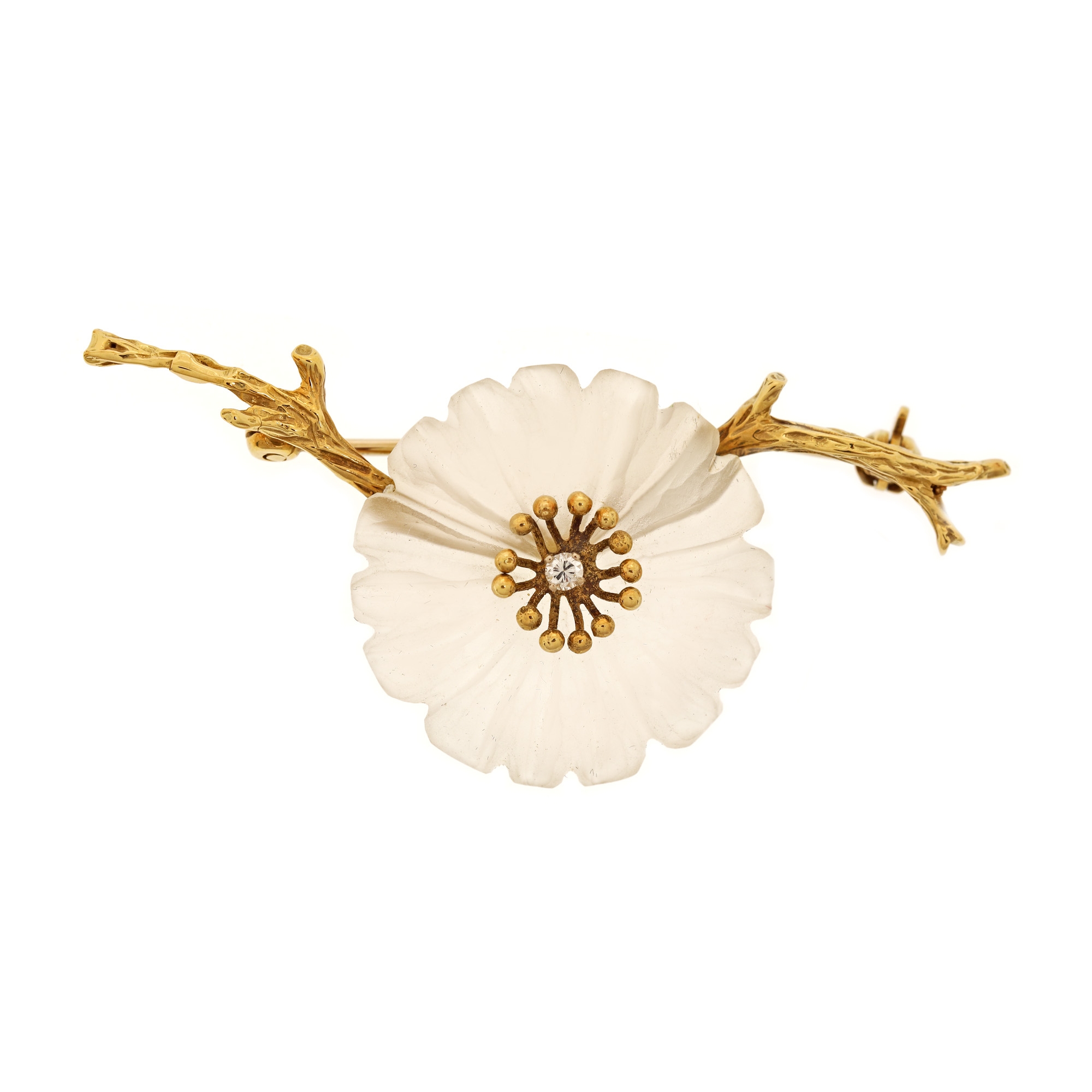 101. Broșă din aur, decorată cu cuarț sculptat în forma unei flori și un diamant