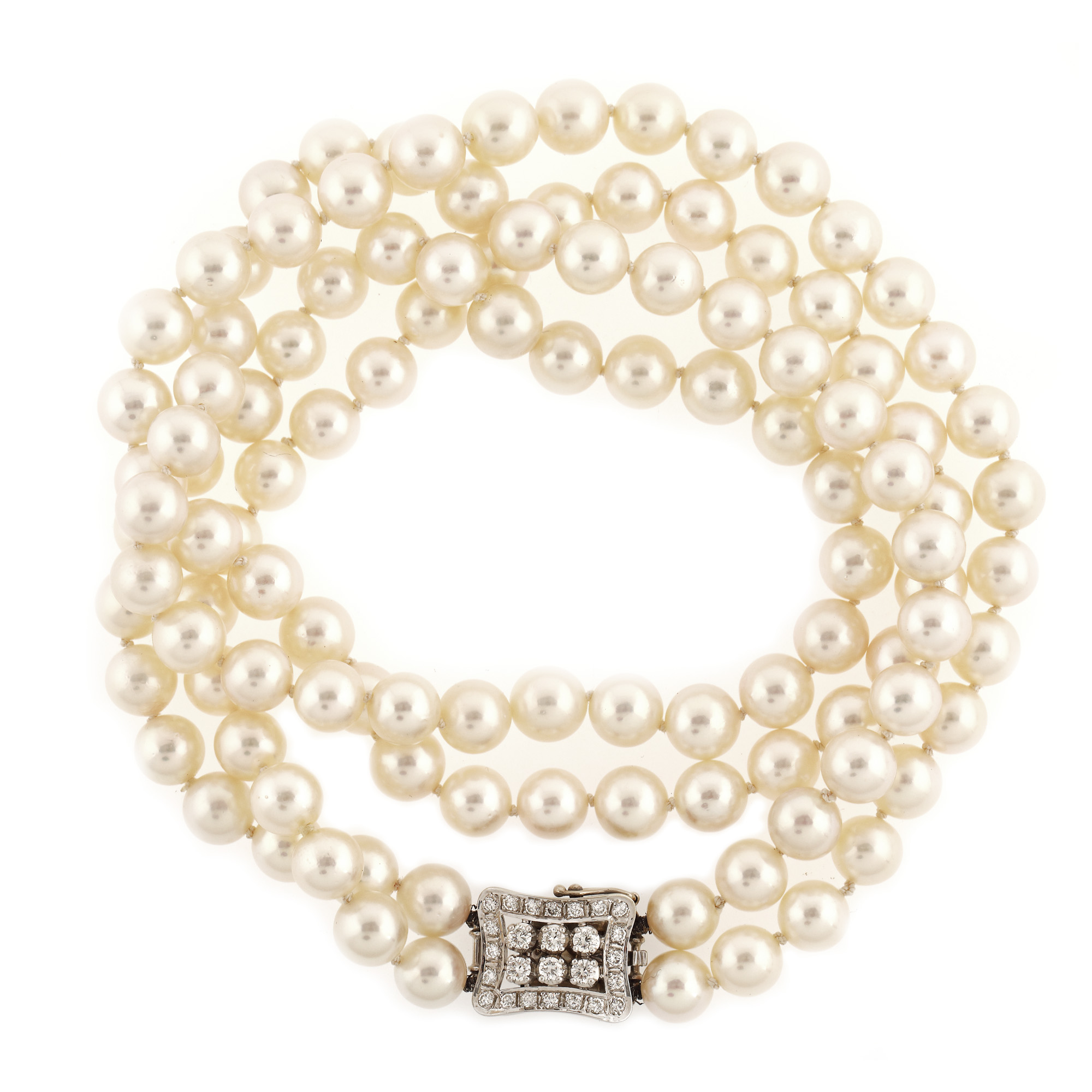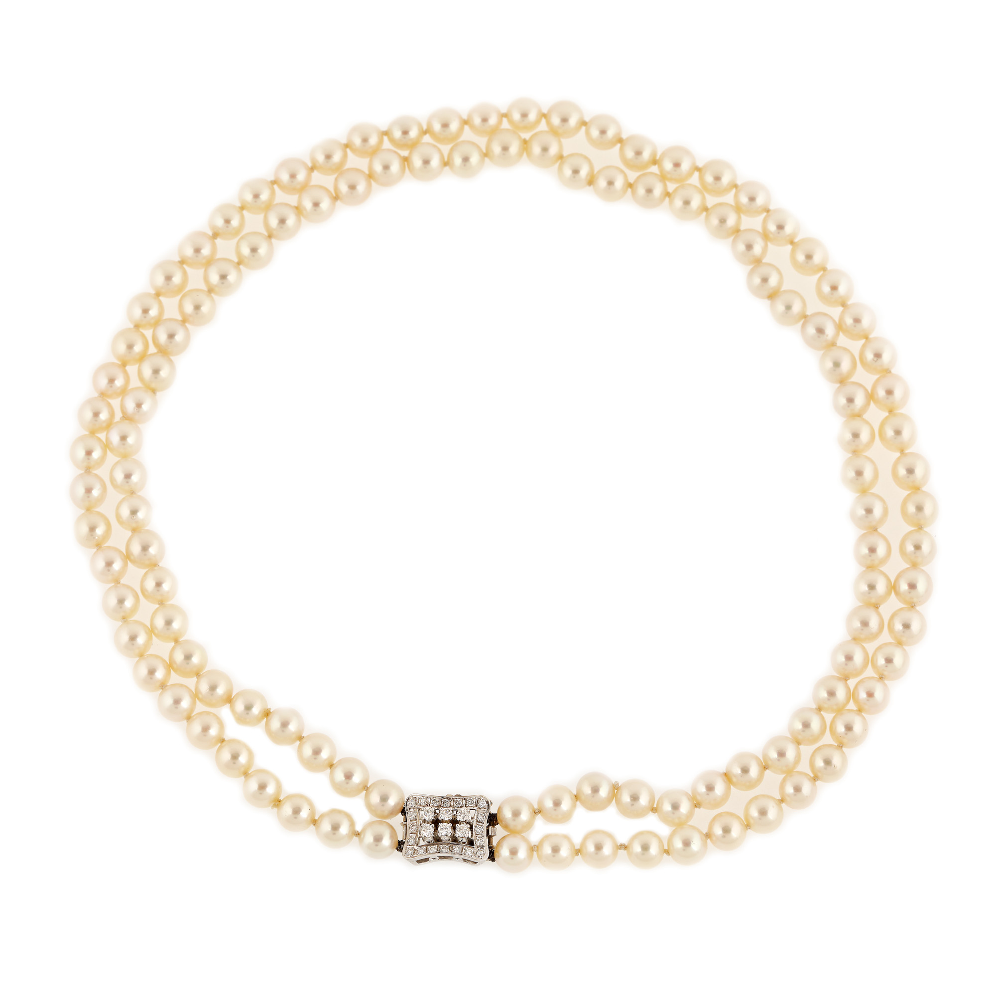 149. Colier cu două rânduri de perle, cu închizătoare din aur alb ornată cu diamante