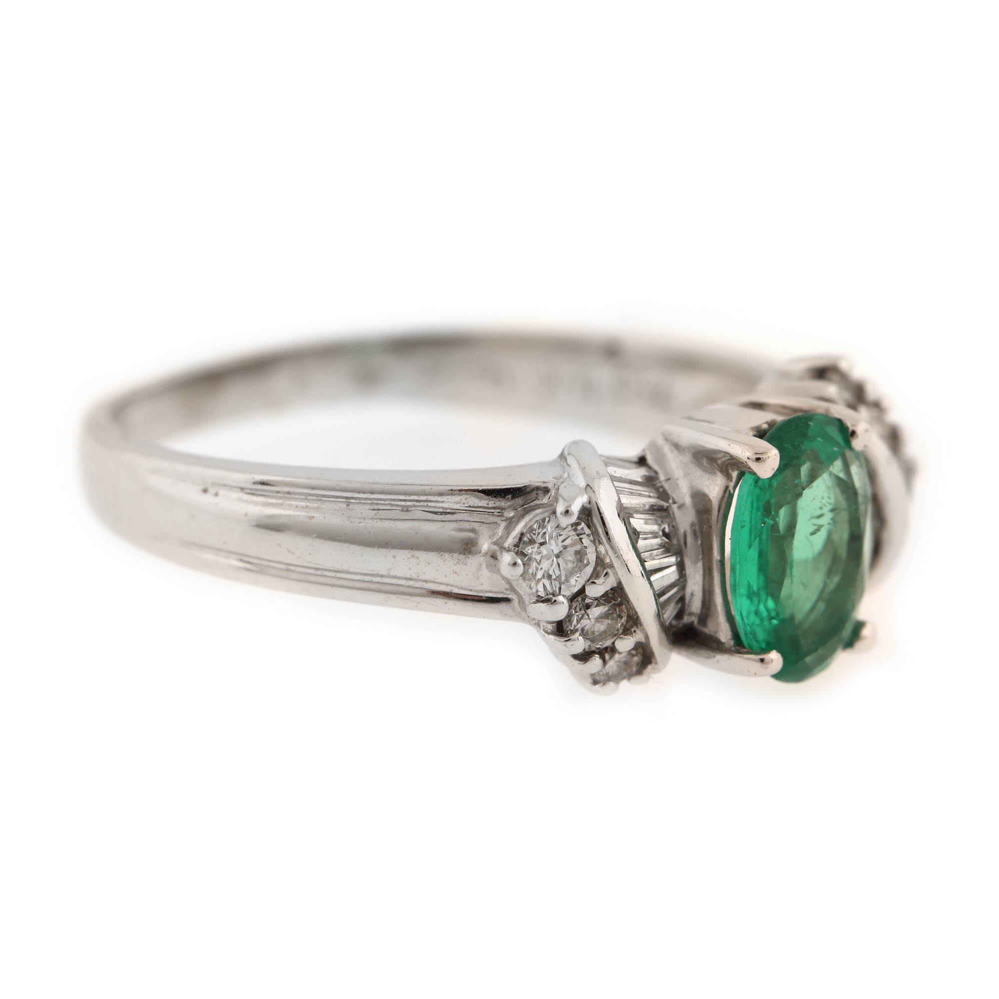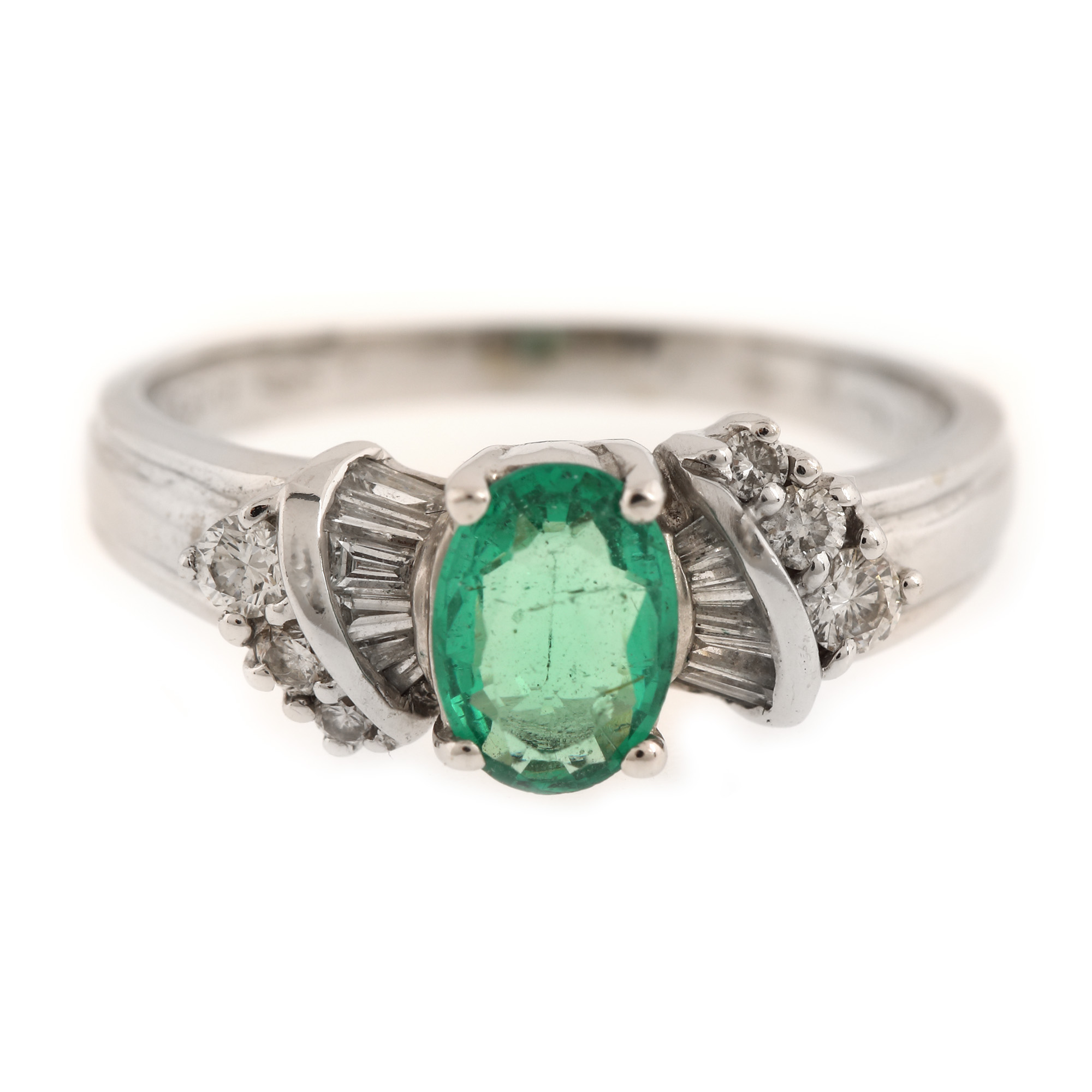 1 smarald oval fațetat, culoare verde, claritate SI, cca. 0,52 ct. și 18 diamante (6 rotunde briliant, 12 baghete), culoare F-H, claritate VS1-VS2, cca. 0,28 ct.