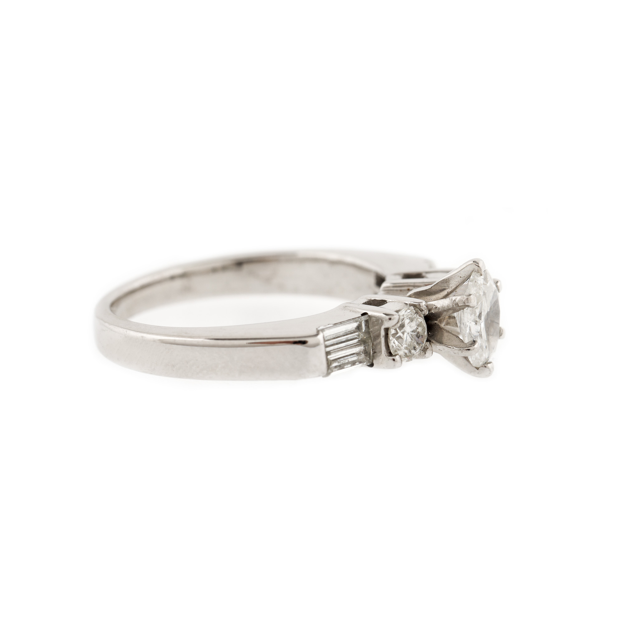 1 diamant oval fațetat, culoare F-G, claritate I1, cca. 0,52 ct.; 2 diamante rotunde briliant, culoare I-J, claritate I2, cca. 0,27 ct. și 4 diamante baghete, culoare I-J, claritate VS1-VS2, cca. 0,26 ct.