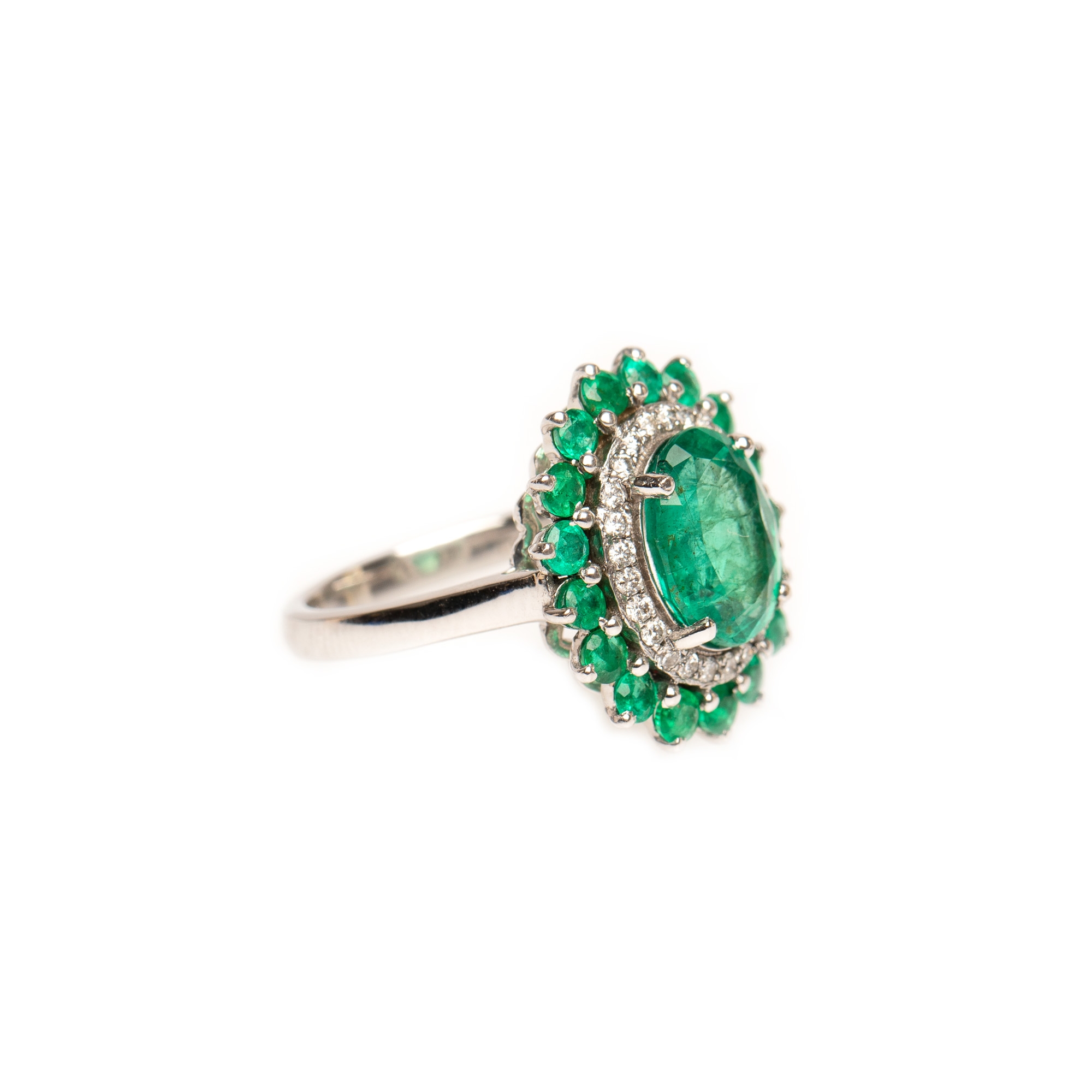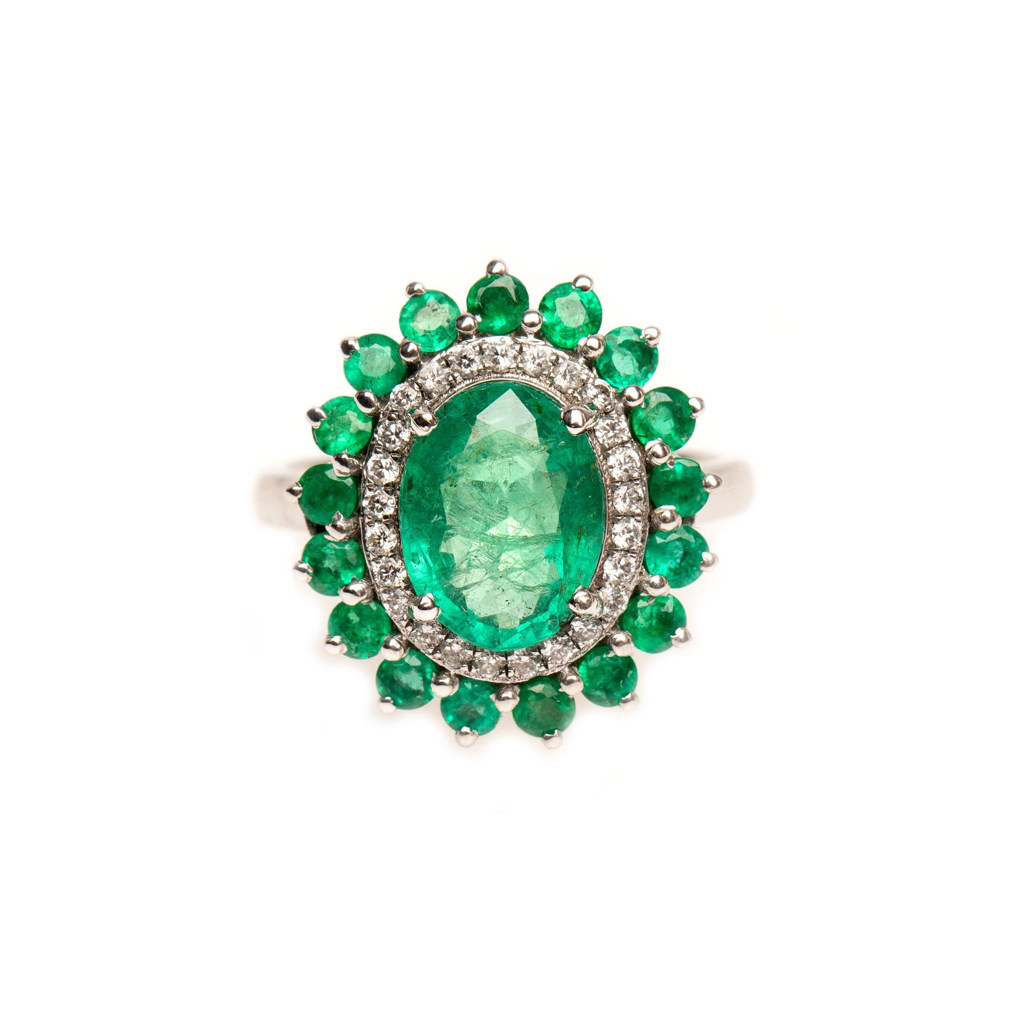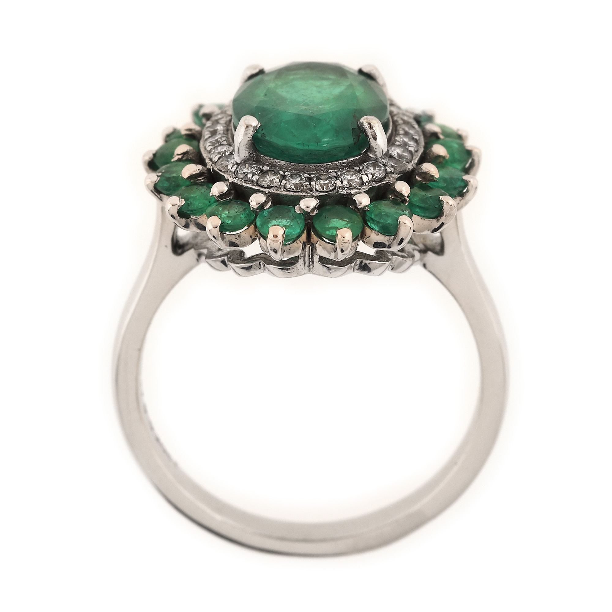 1 smarald oval fațetat, culoare verde, claritate moderately included, cca. 1,98 ct.; 25 diamante rotunde briliant, culoare H-I, claritate VS2-SI2, cca. 0,20 ct. și 17 smaralde rotund fațetate, culoare verde, claritate SI-moderately included, cca. 0,77 ct.