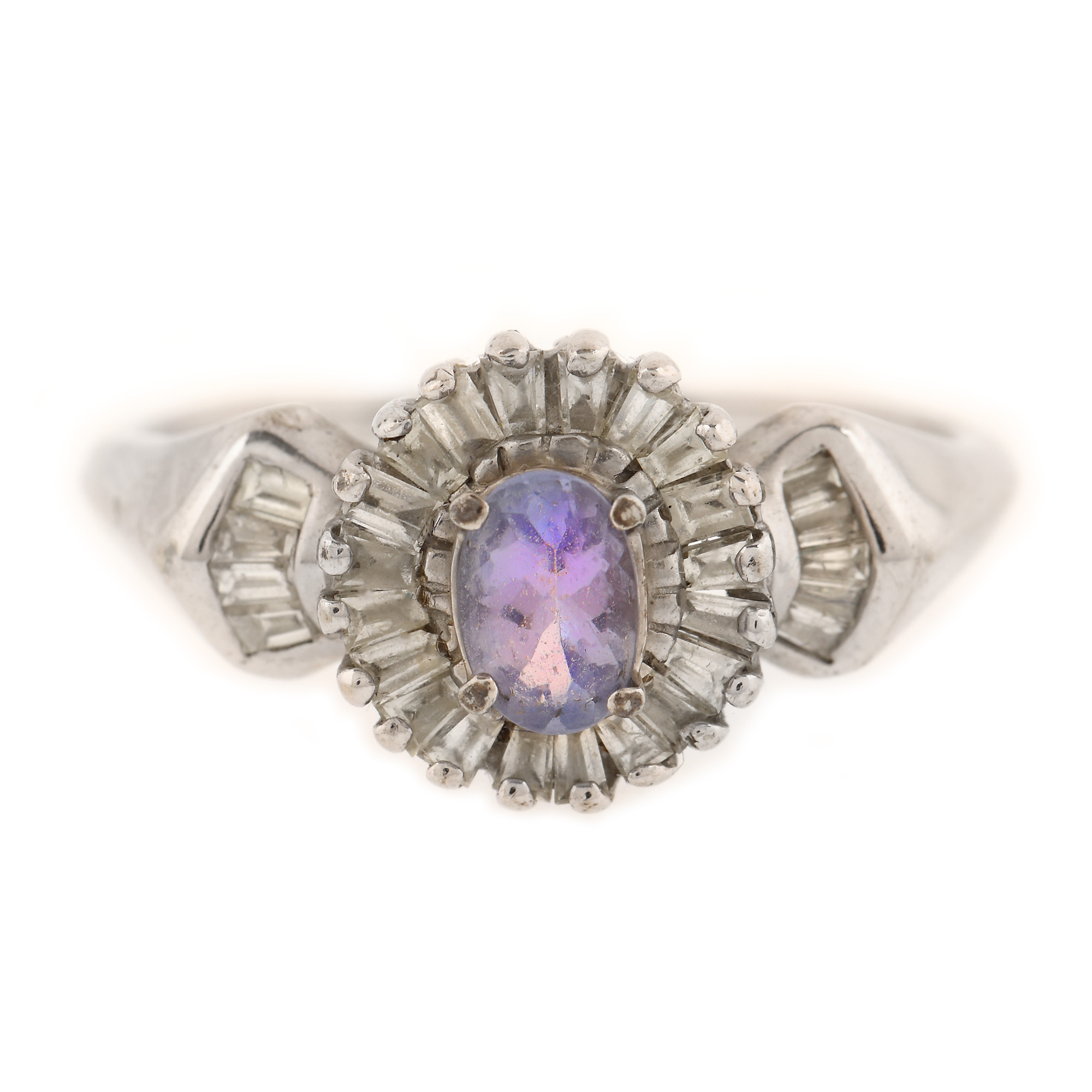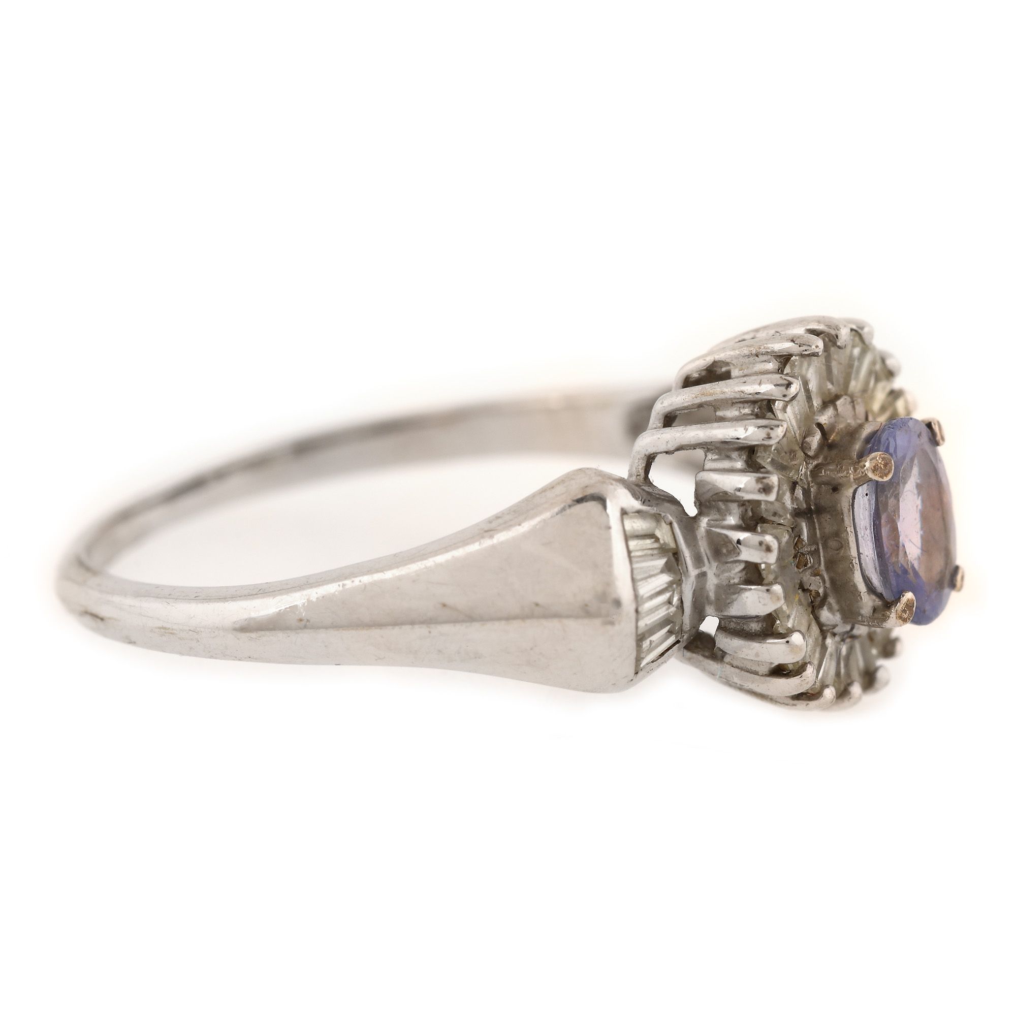 122. Inel din aur alb, decorat cu tanzanit și baghete de diamante