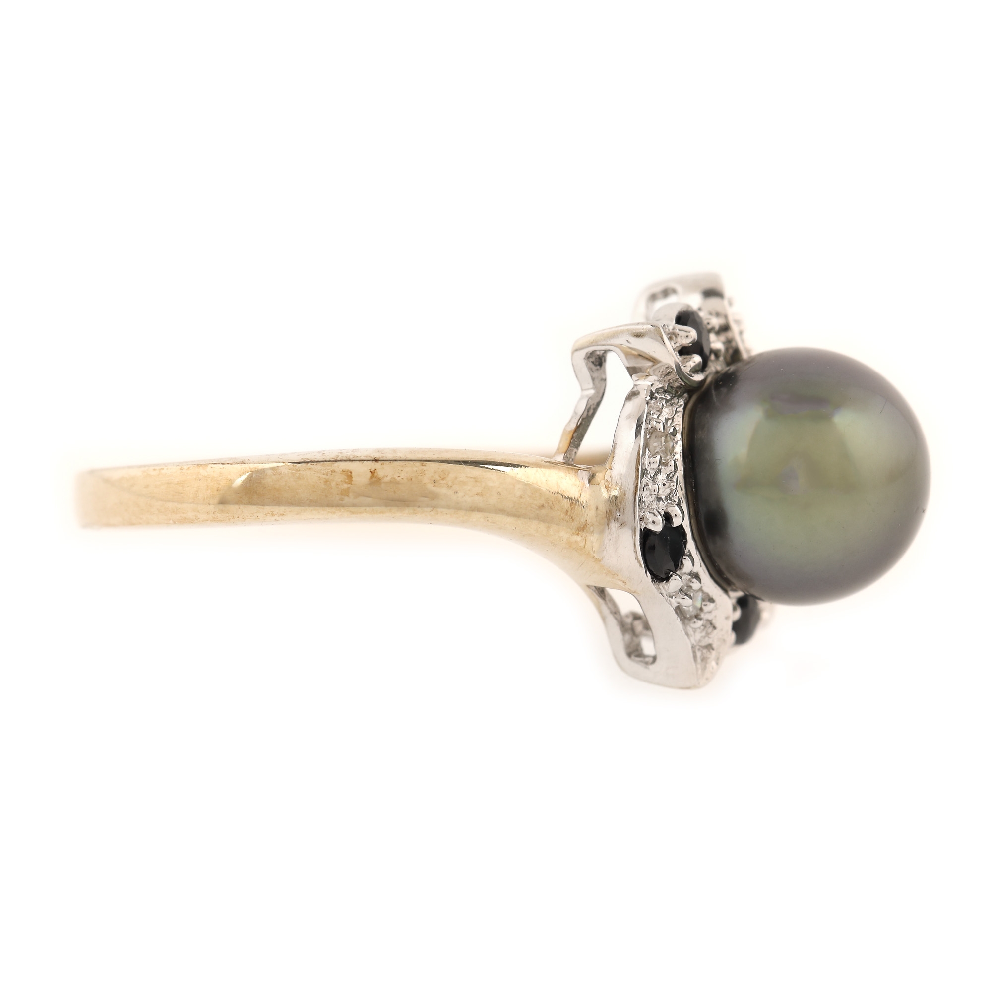 4 diamante single cut, culoare K-L, claritate VS2-SI1, cca. 0,024 ct.; 4 safire rotund fațetate, culoare albastru, claritate SI, cca. 0,15 ct. și 1 perlă de cultură rotundă, culoare negru, d=8,04/-8,05 mm