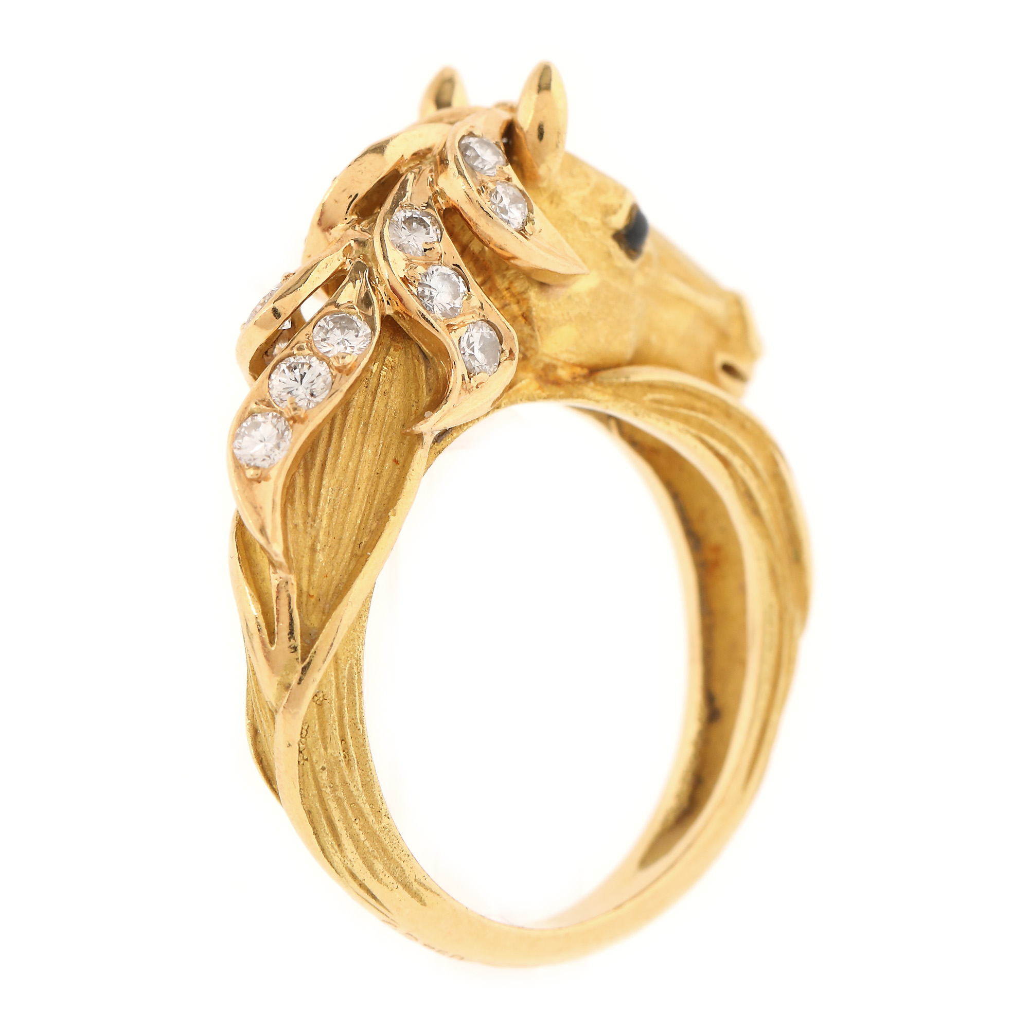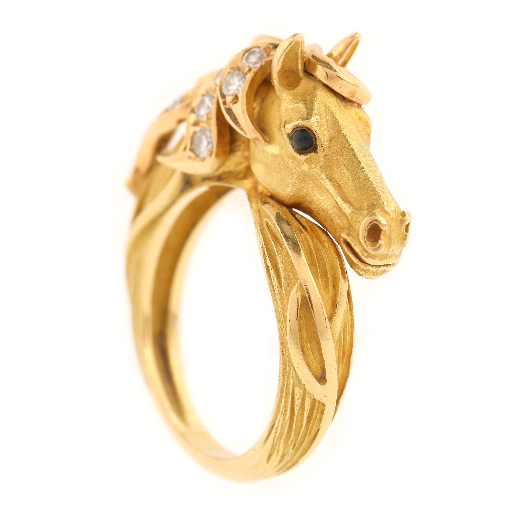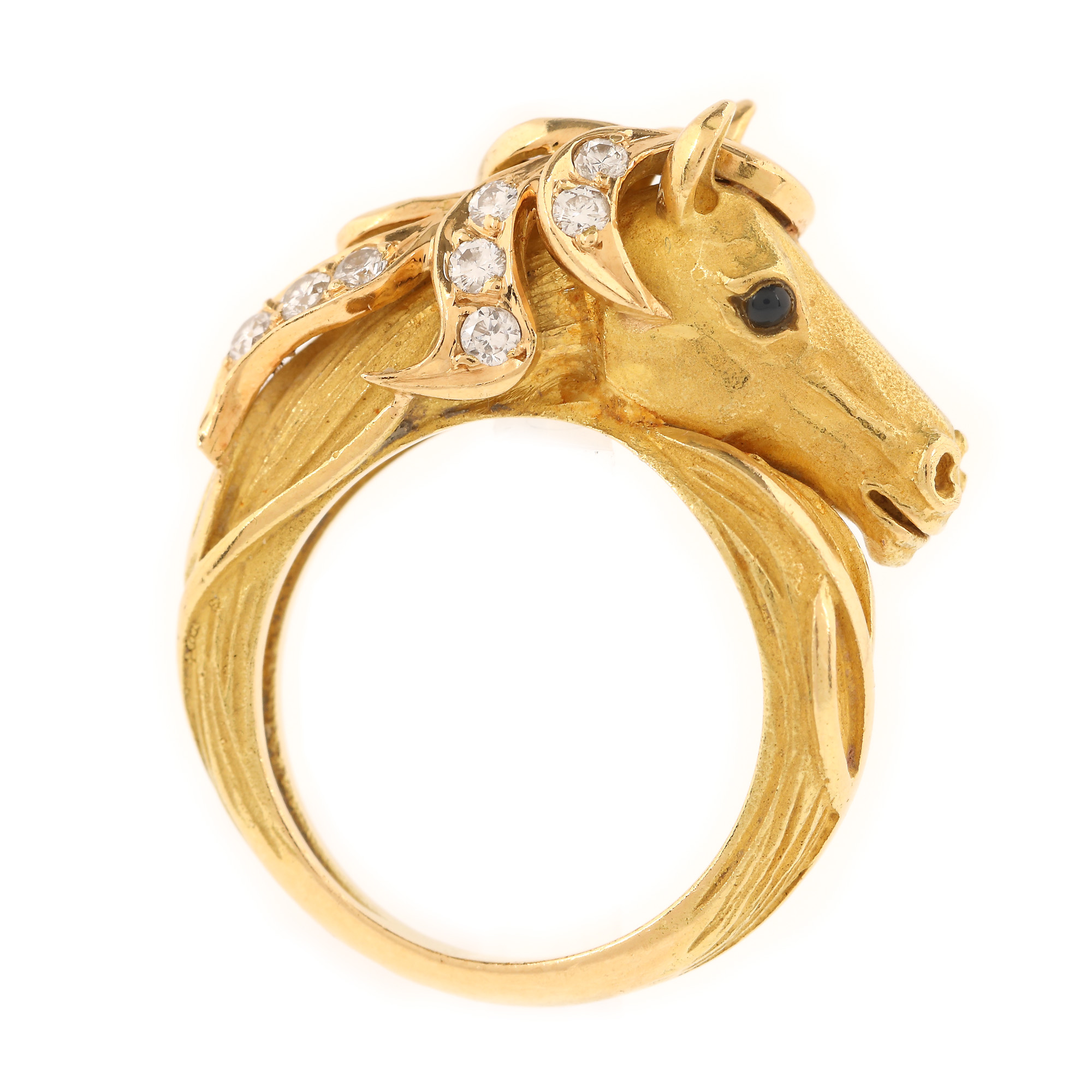 104. Inel din aur, în forma unui cal, decorat cu diamante și safire