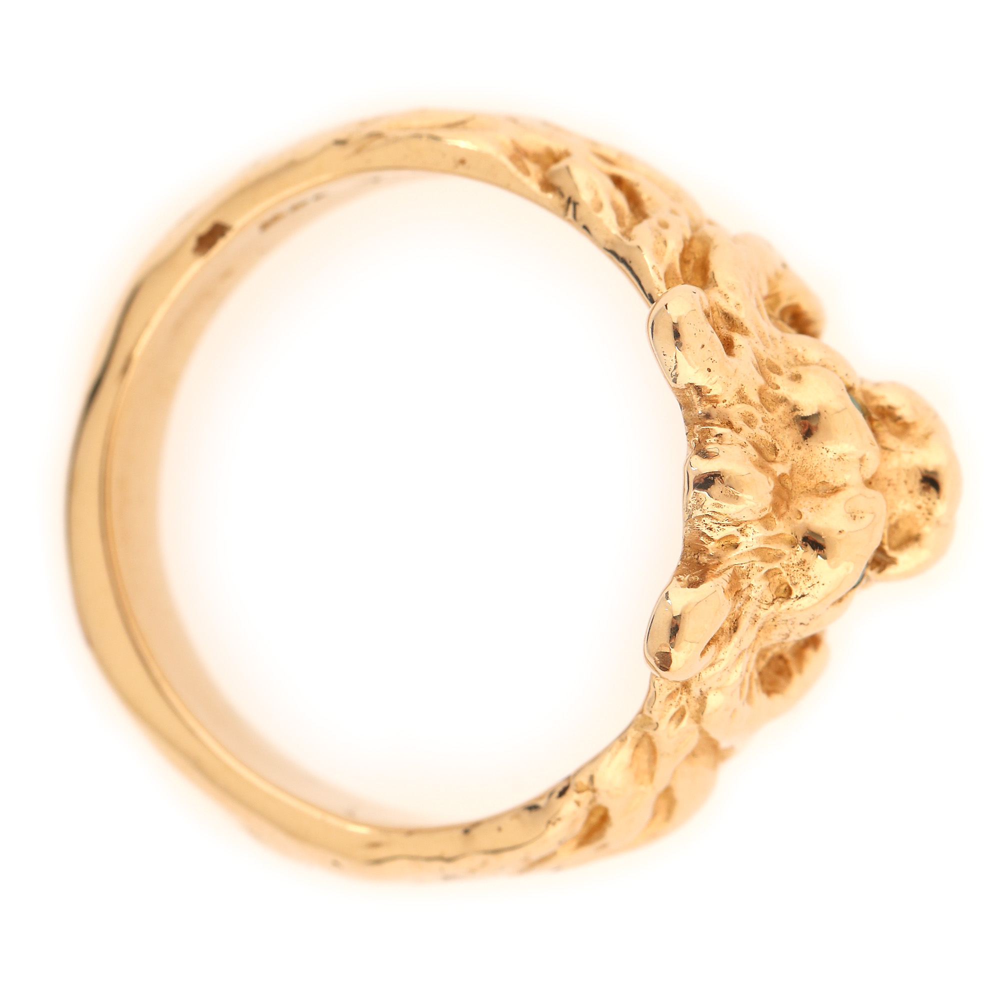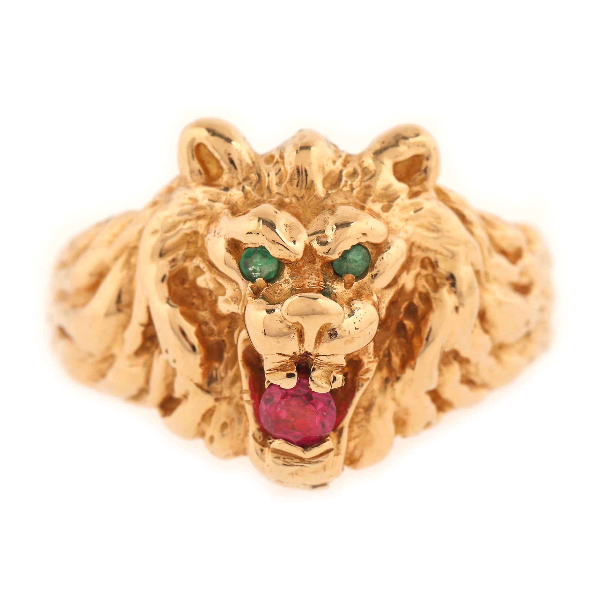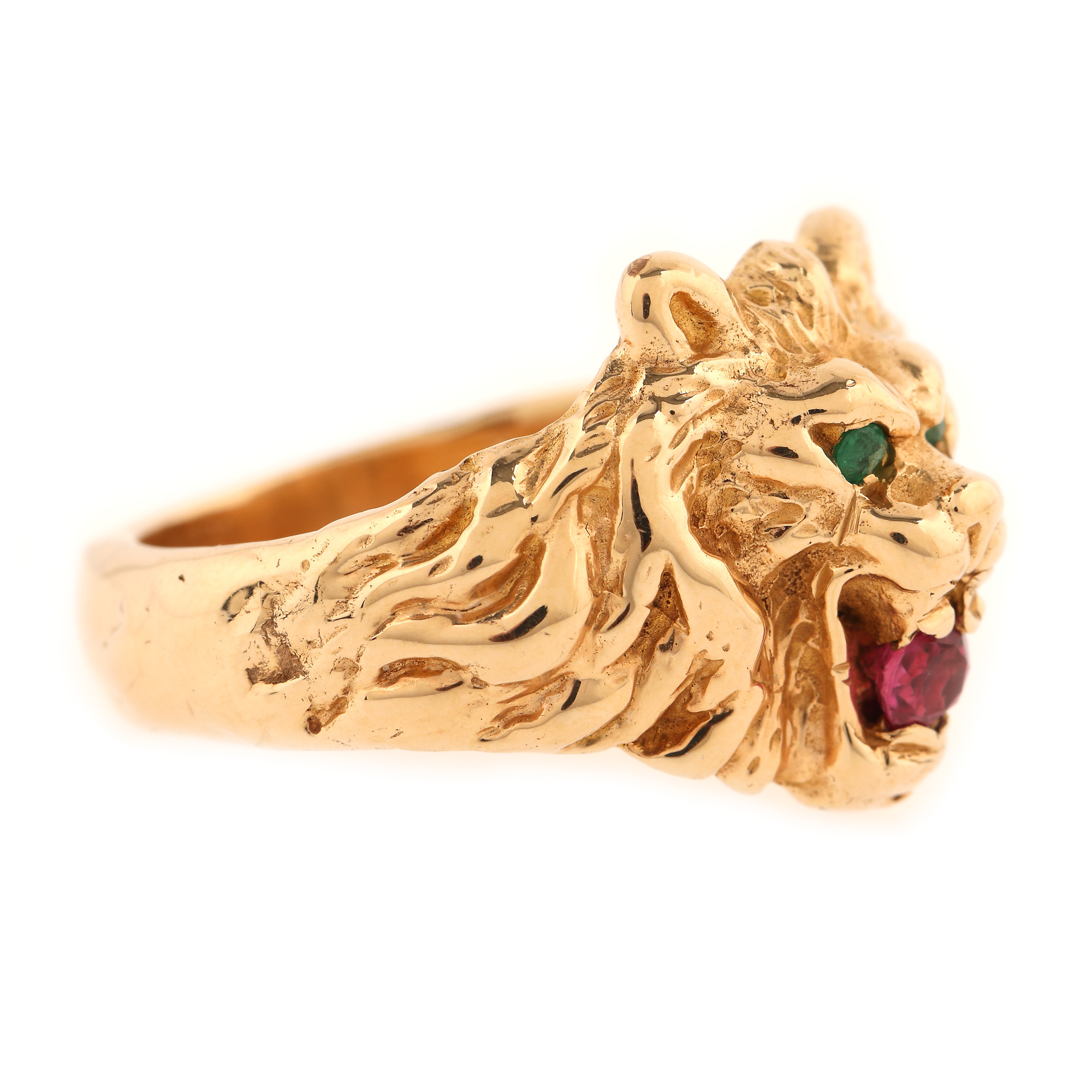 103. Inel din aur, în forma unui leu, ornat cu smaralde și rubin
