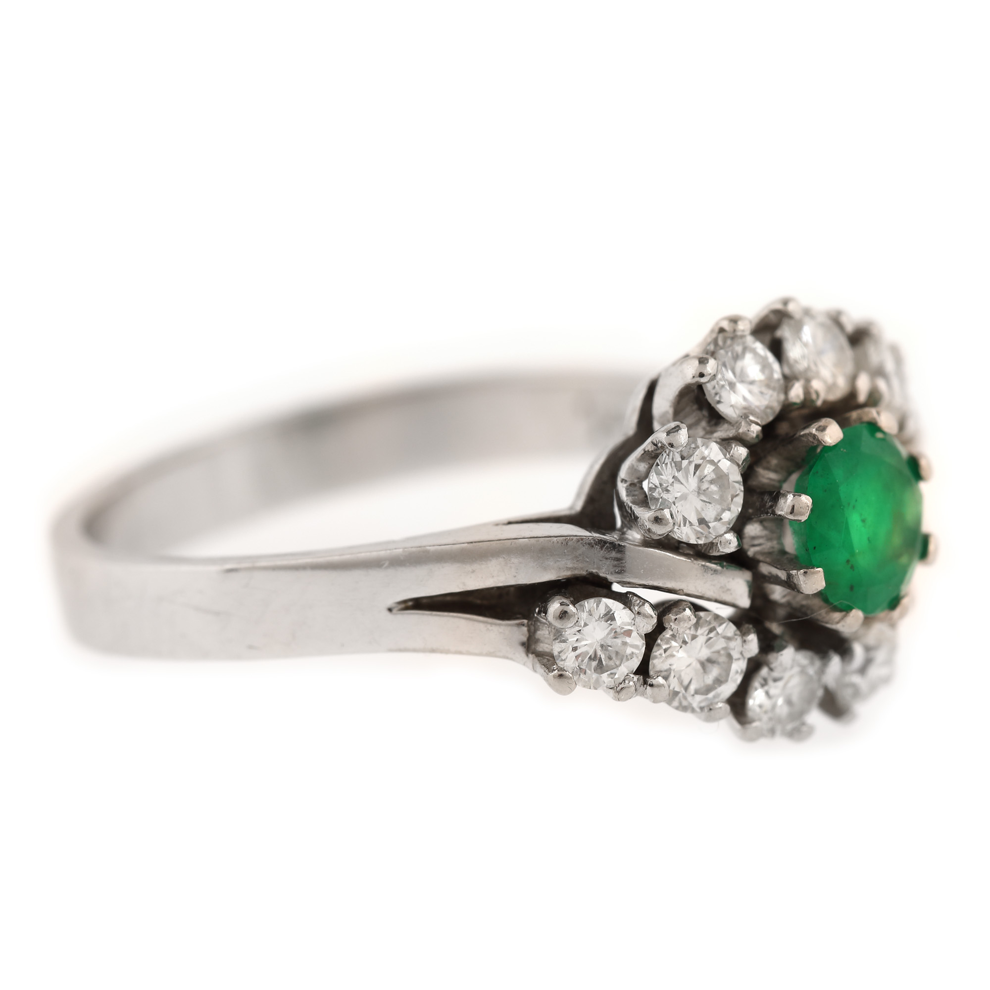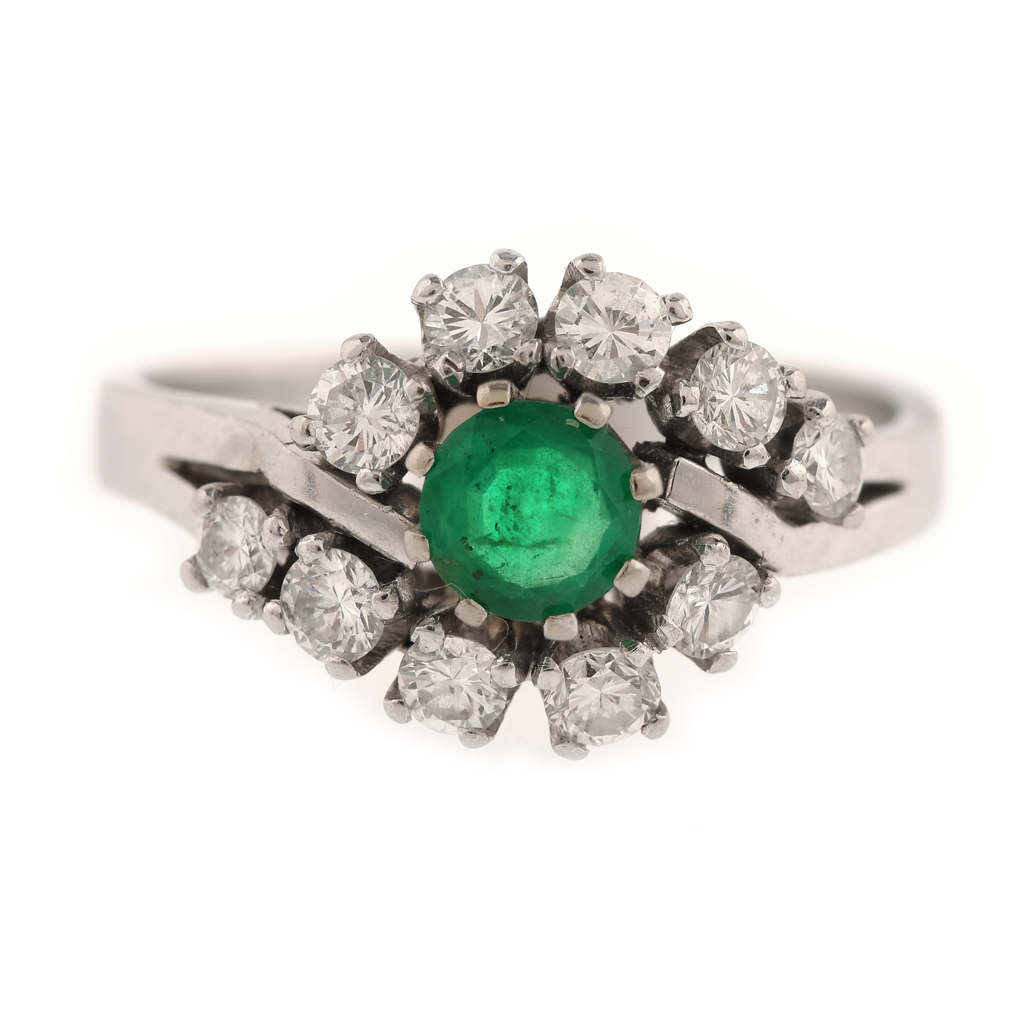 1 smarald rotund fațetat, culoare verde, claritate moderately included, cca. 0,40 ct. și 10 diamante rotunde briliant, culoare F-G, claritate VS1-VS2, cca. 0,62 ct.