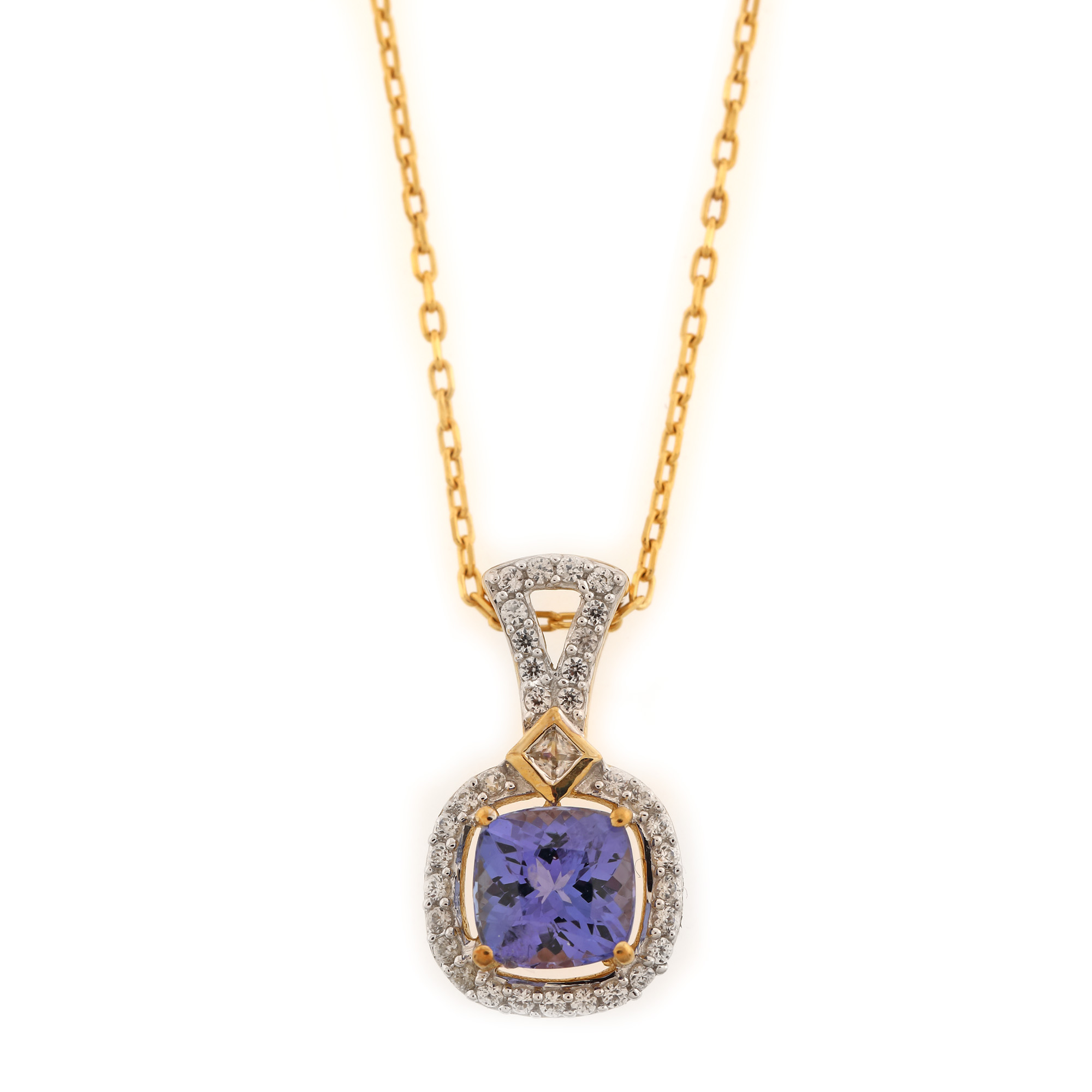 123. Lanț cu pandantiv din aur, decorat cu tanzanit și topaze